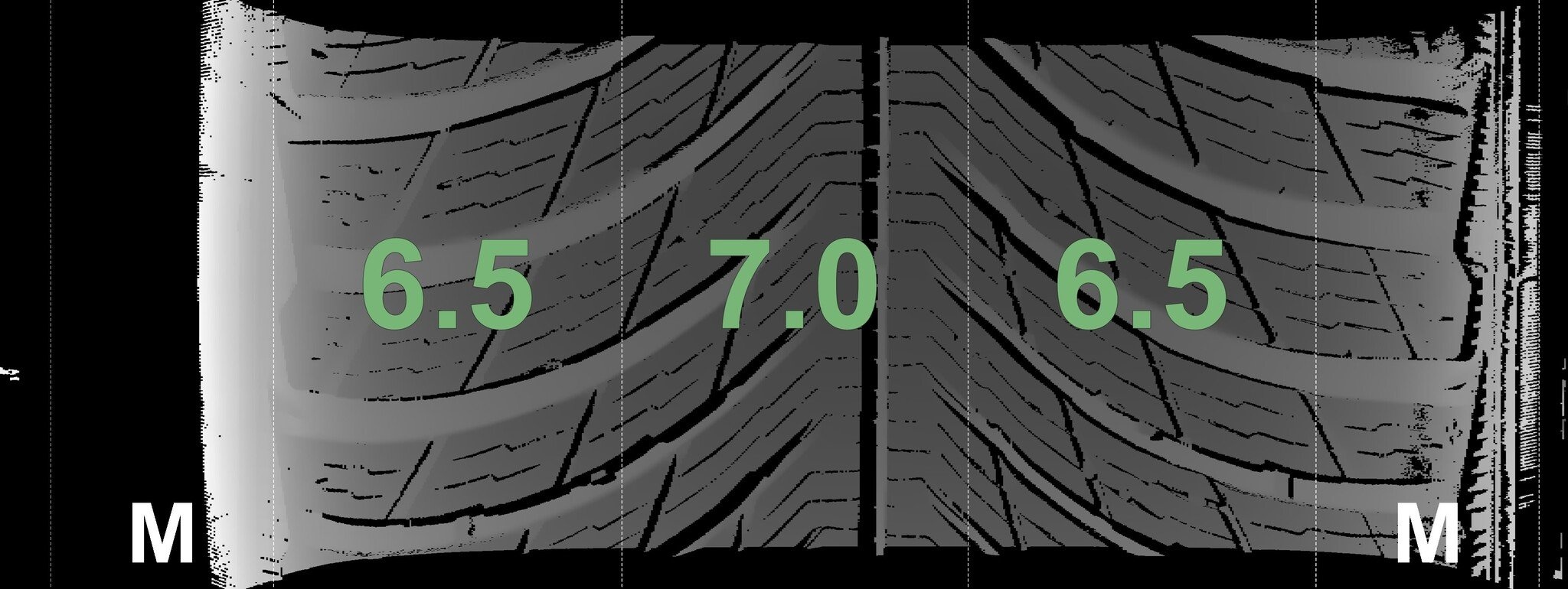 De gemeten profieldieptes en de details van de velgen zijn hierboven weergegeven.