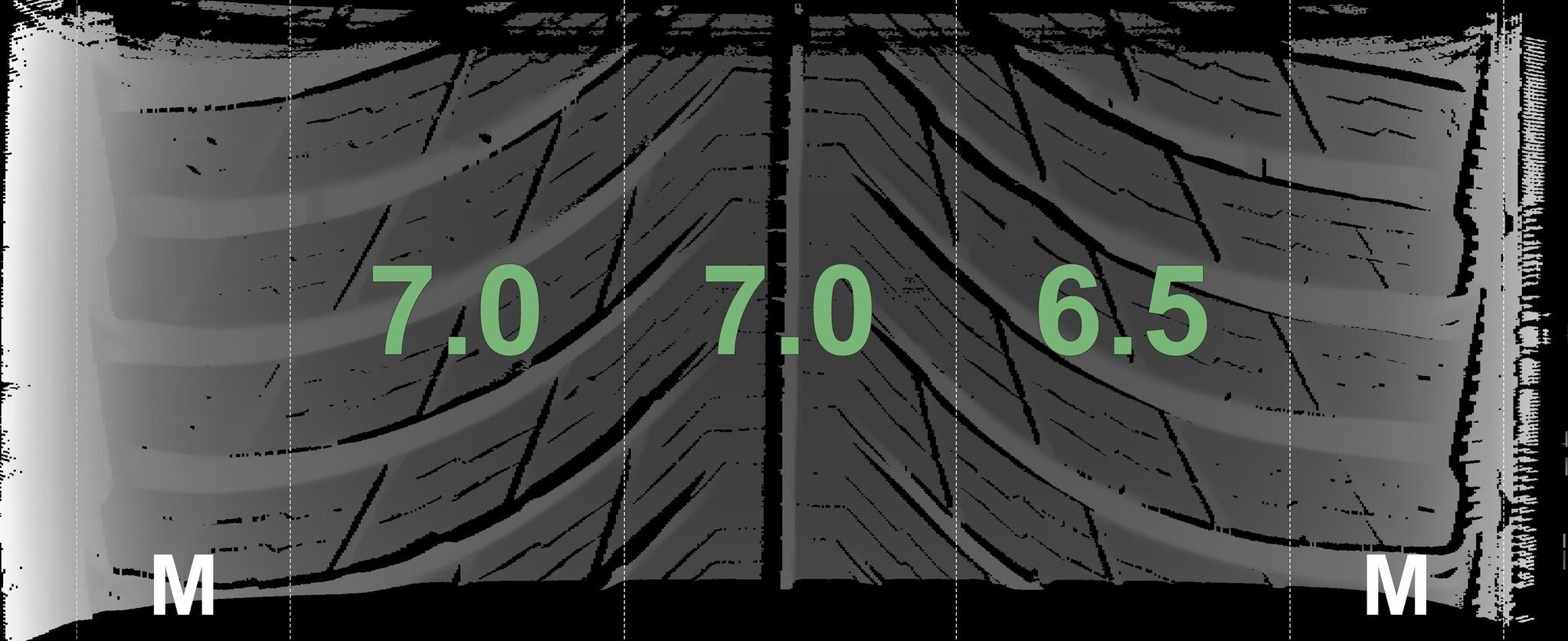 De gemeten profieldieptes en de details van de velgen zijn hierboven weergegeven.