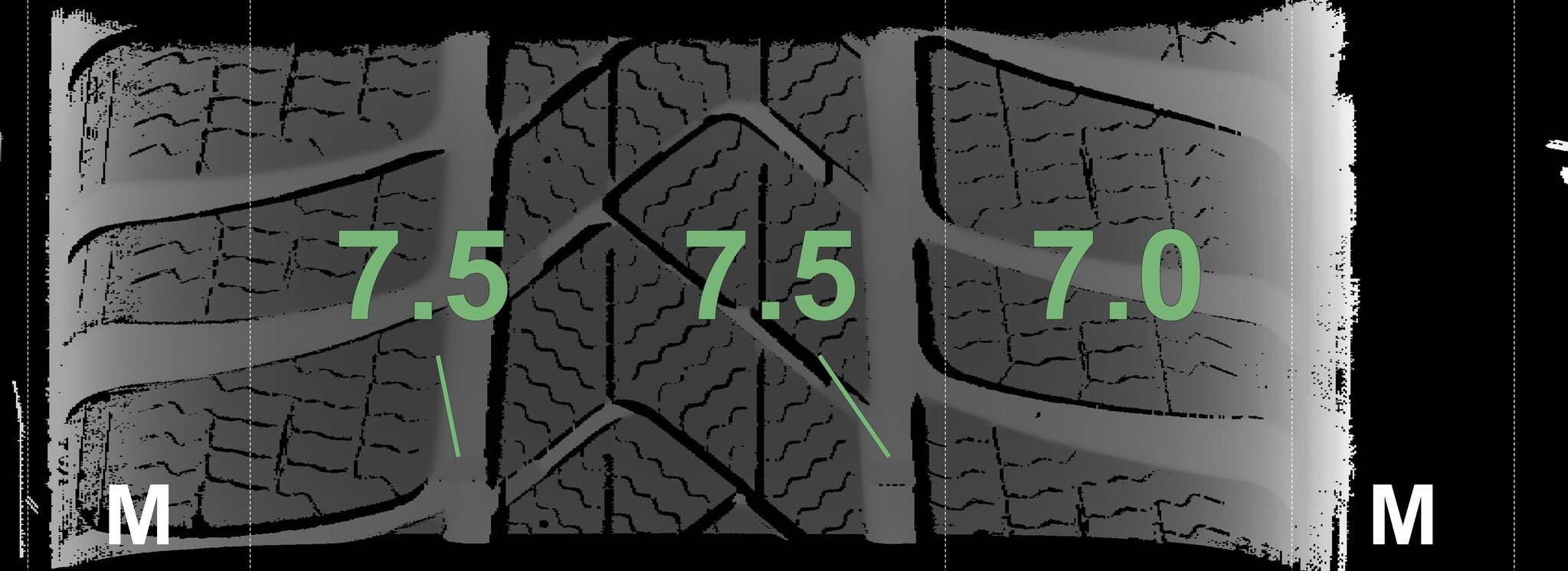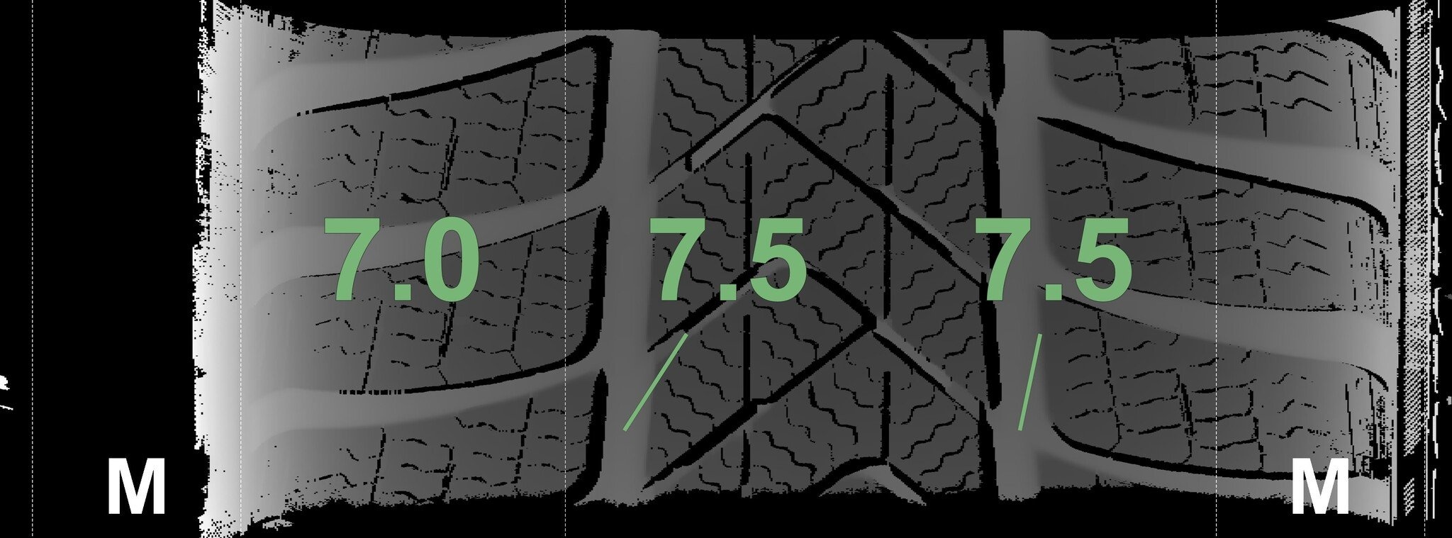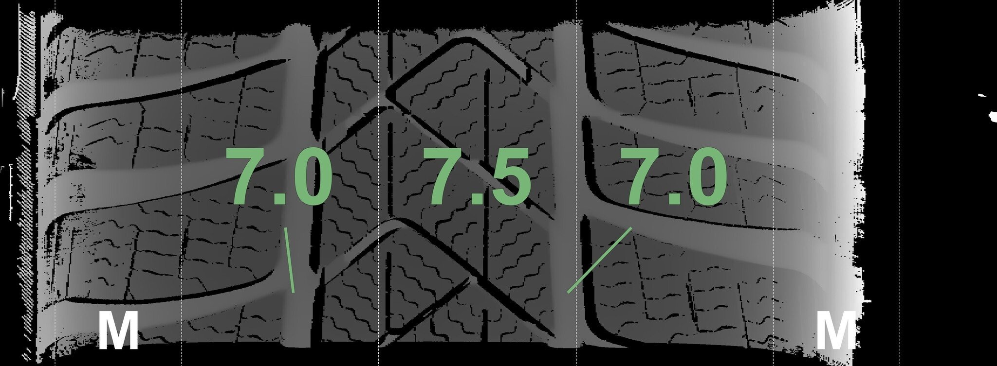 De gemeten profieldieptes en de details van de velgen zijn hierboven weergegeven.
