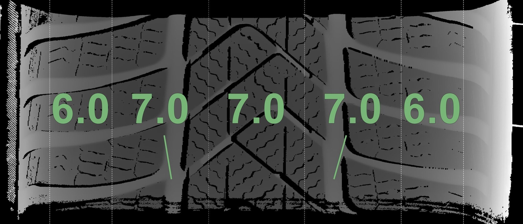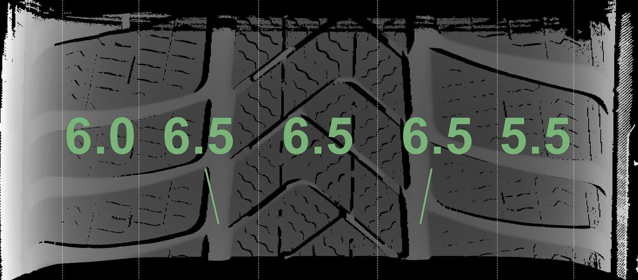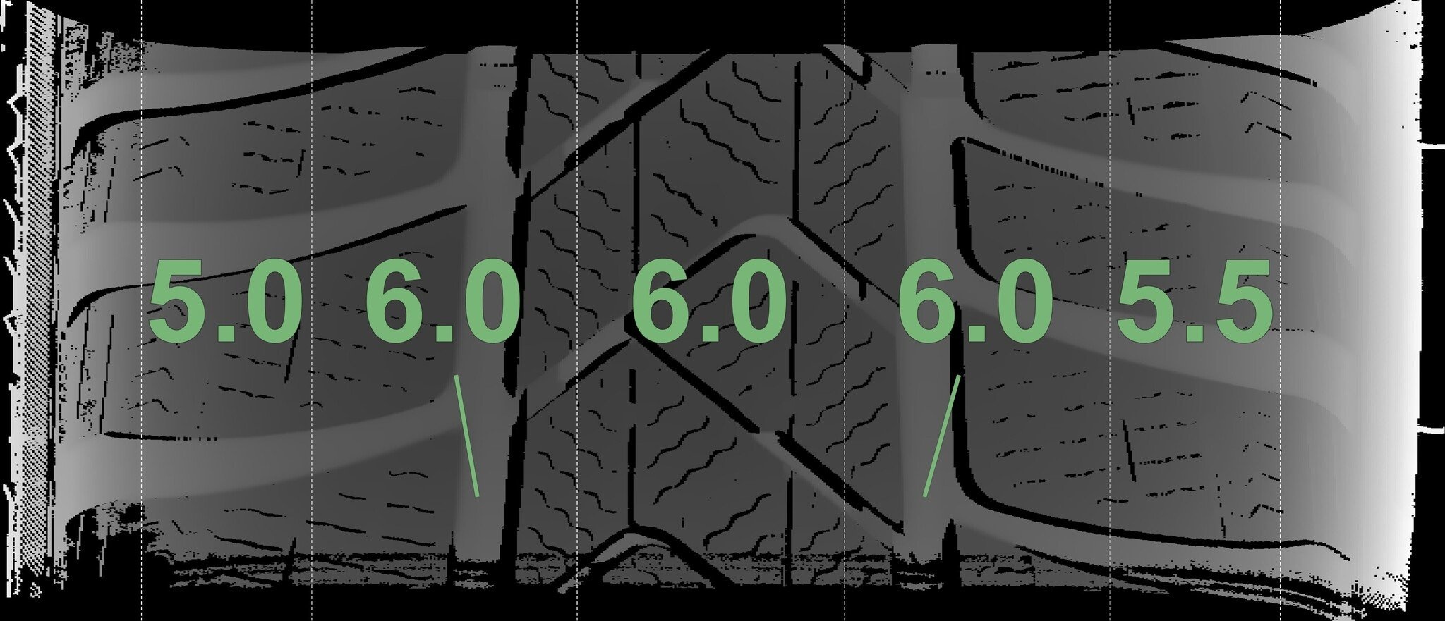 De gemeten profieldieptes en de details van de velgen zijn hierboven weergegeven.