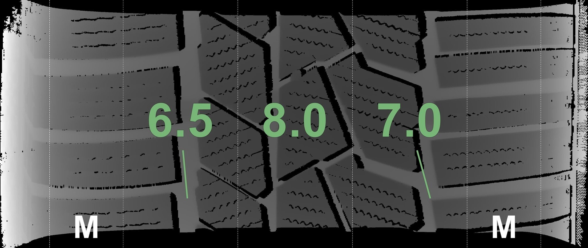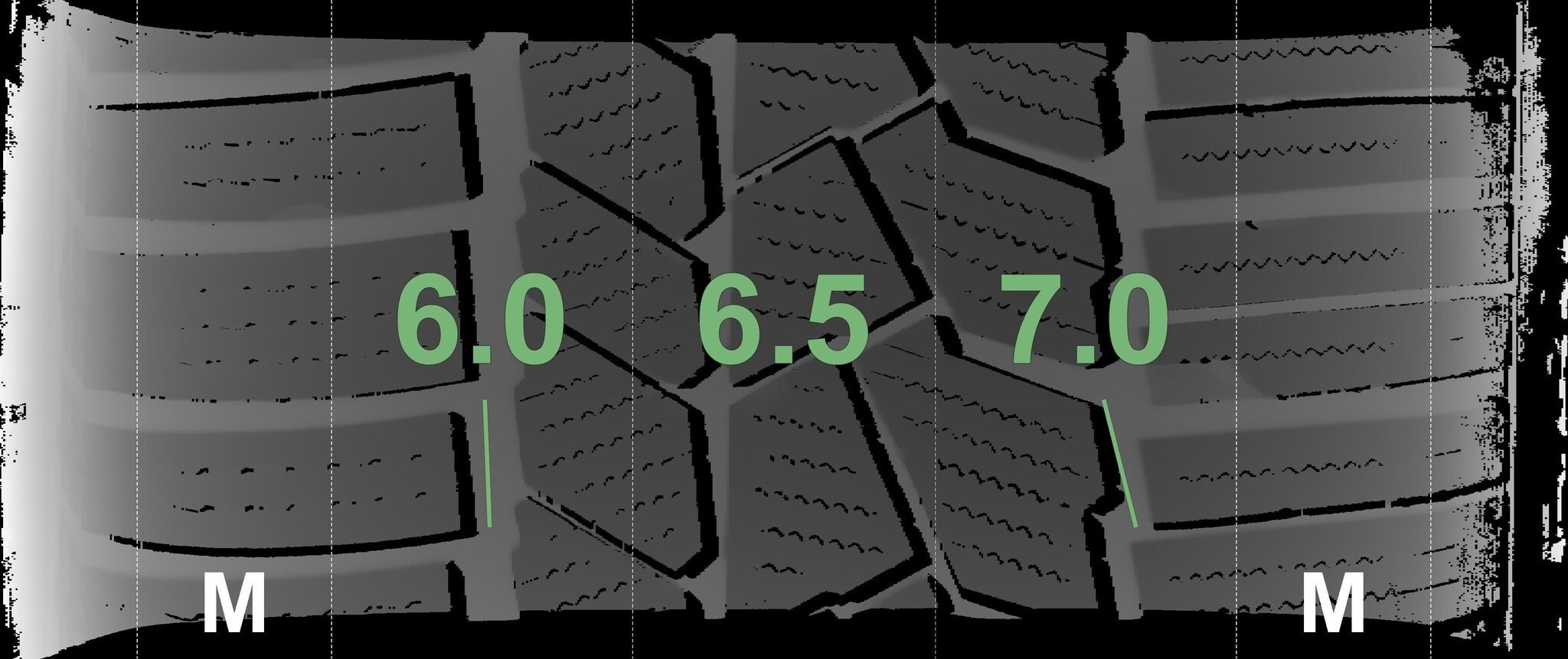 De gemeten profieldieptes en de details van de velgen zijn hierboven weergegeven.