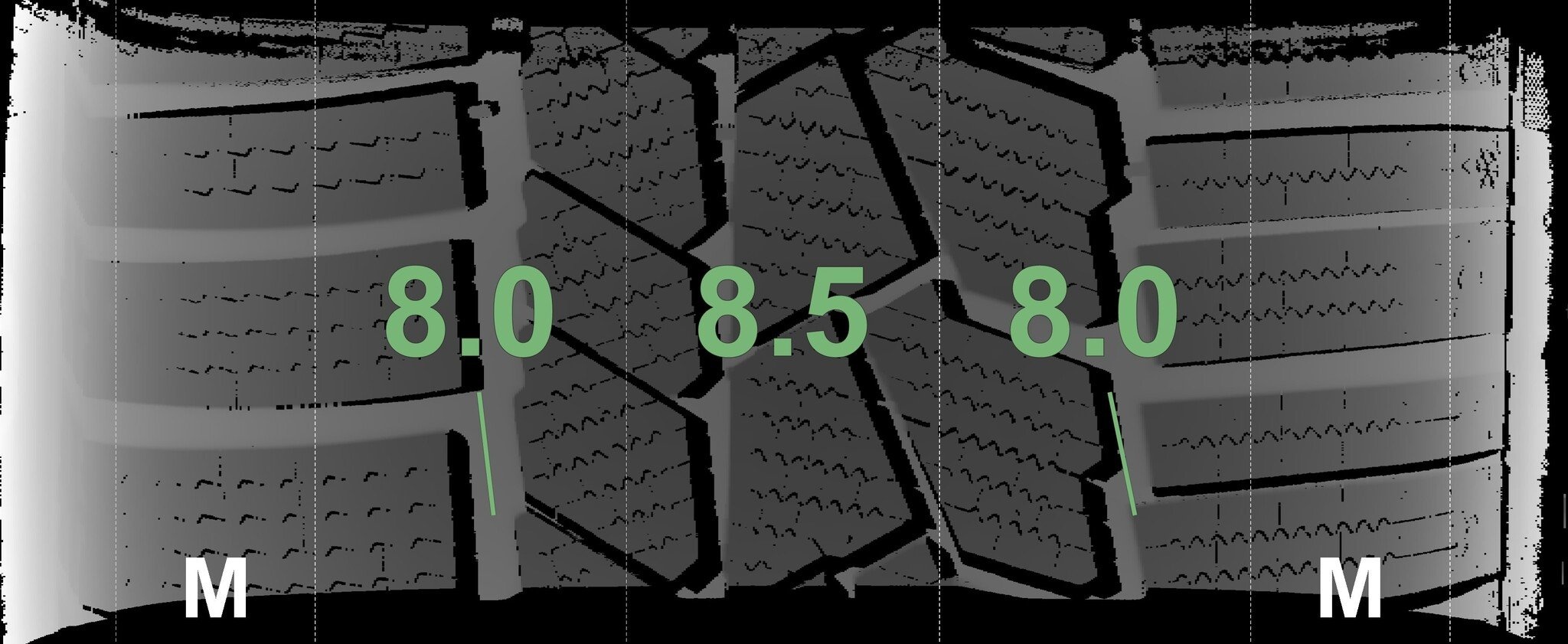 De gemeten profieldieptes en de details van de velgen zijn hierboven weergegeven.
