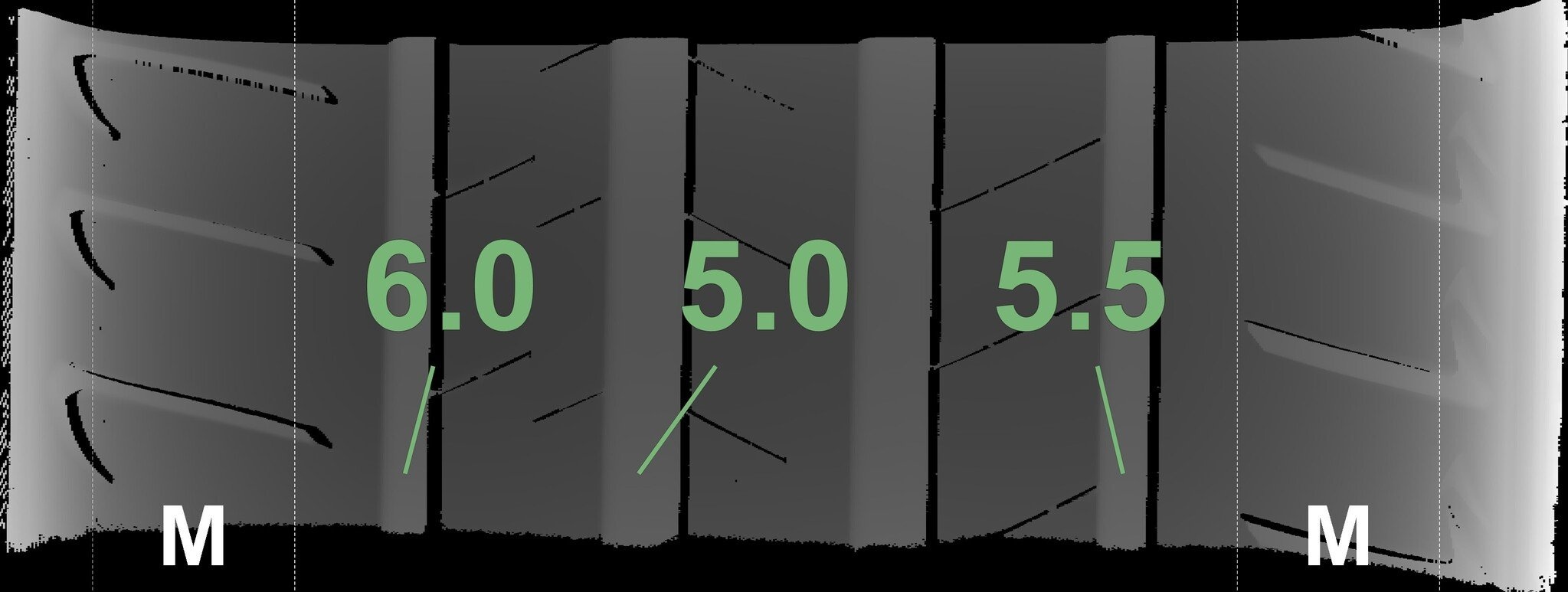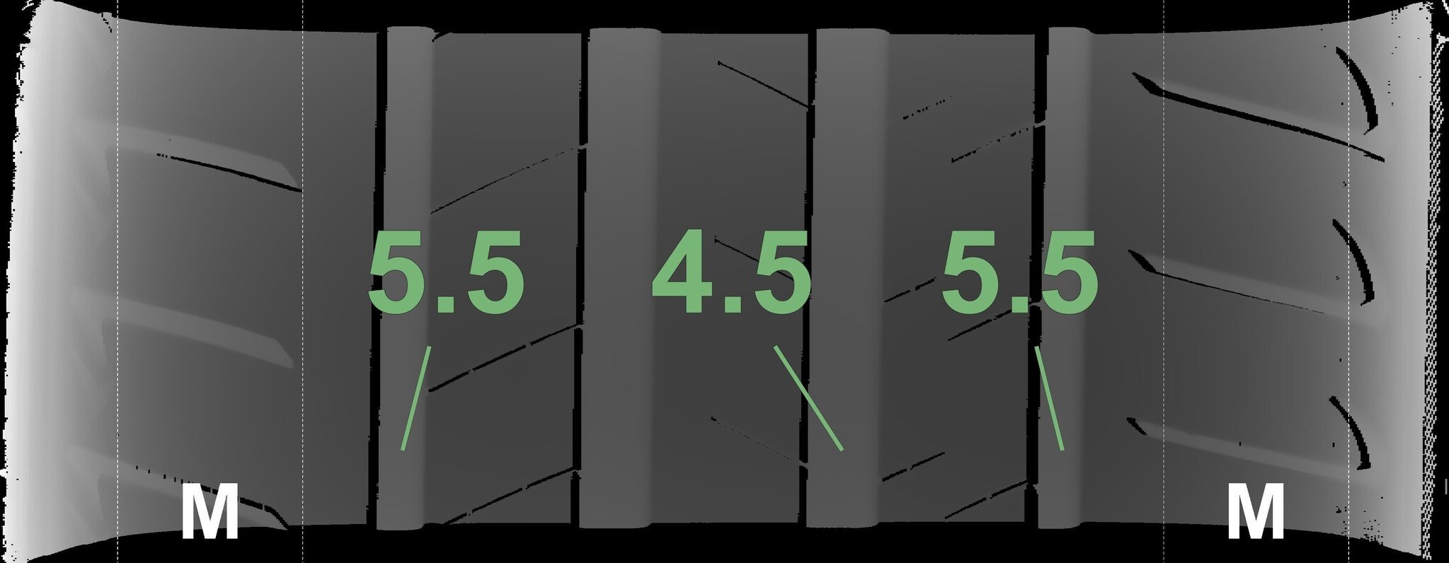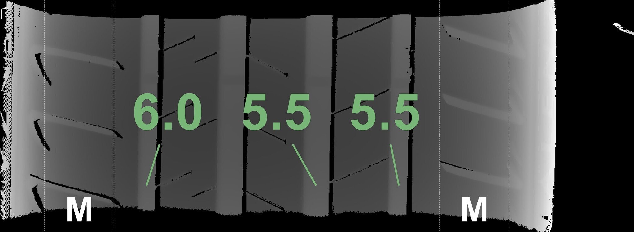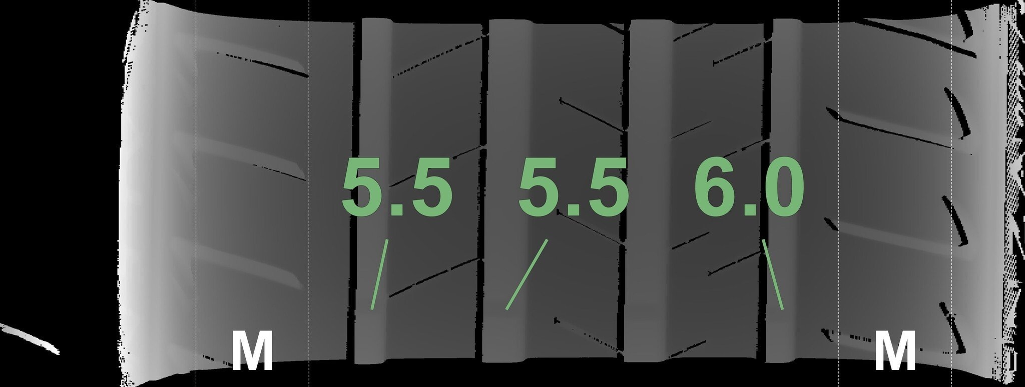 De gemeten profieldieptes en de details van de velgen zijn hierboven weergegeven.