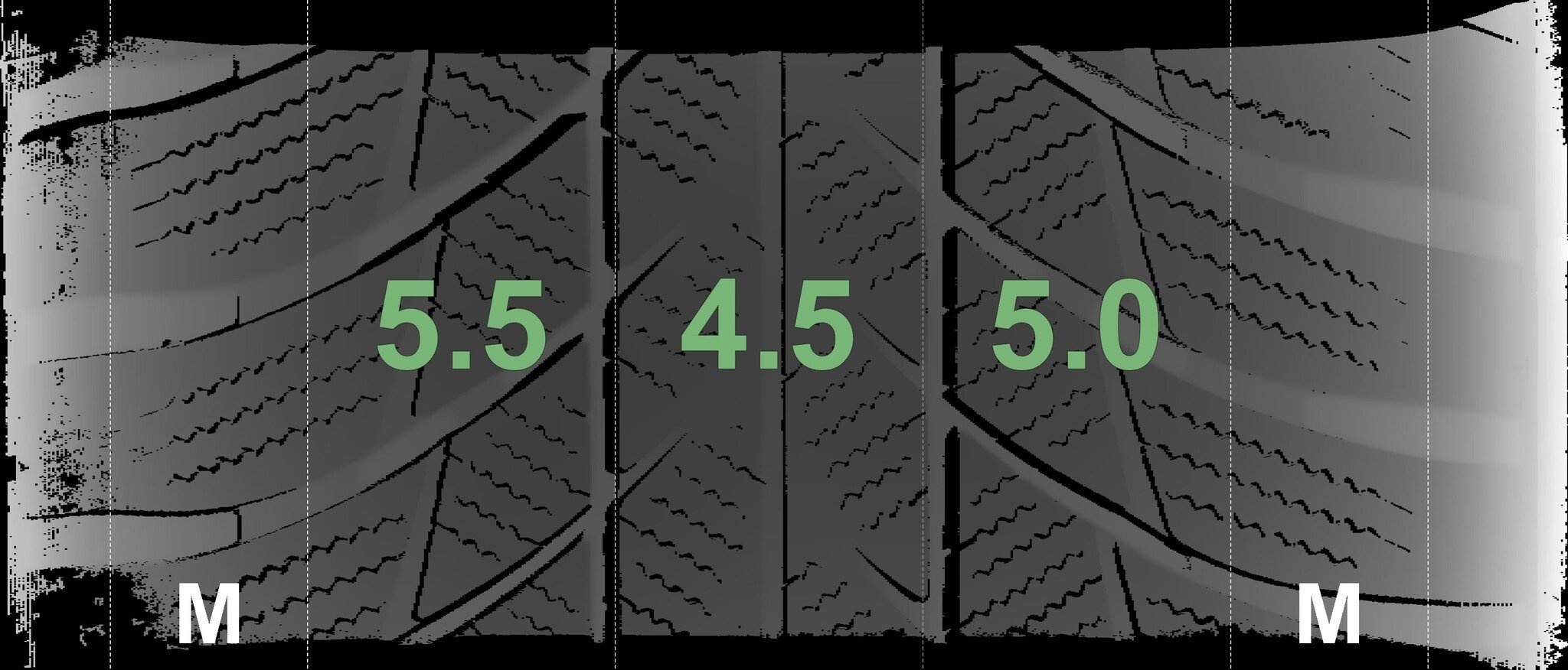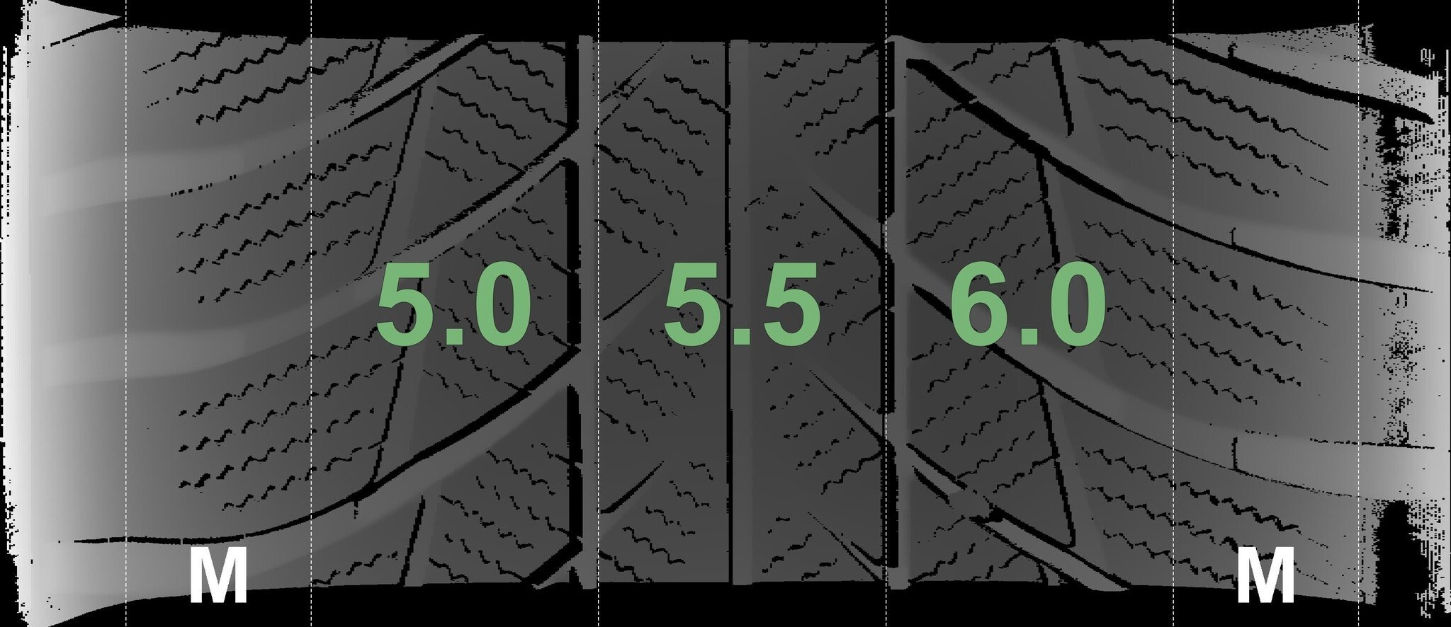 De gemeten profieldieptes en de details van de velgen zijn hierboven weergegeven.