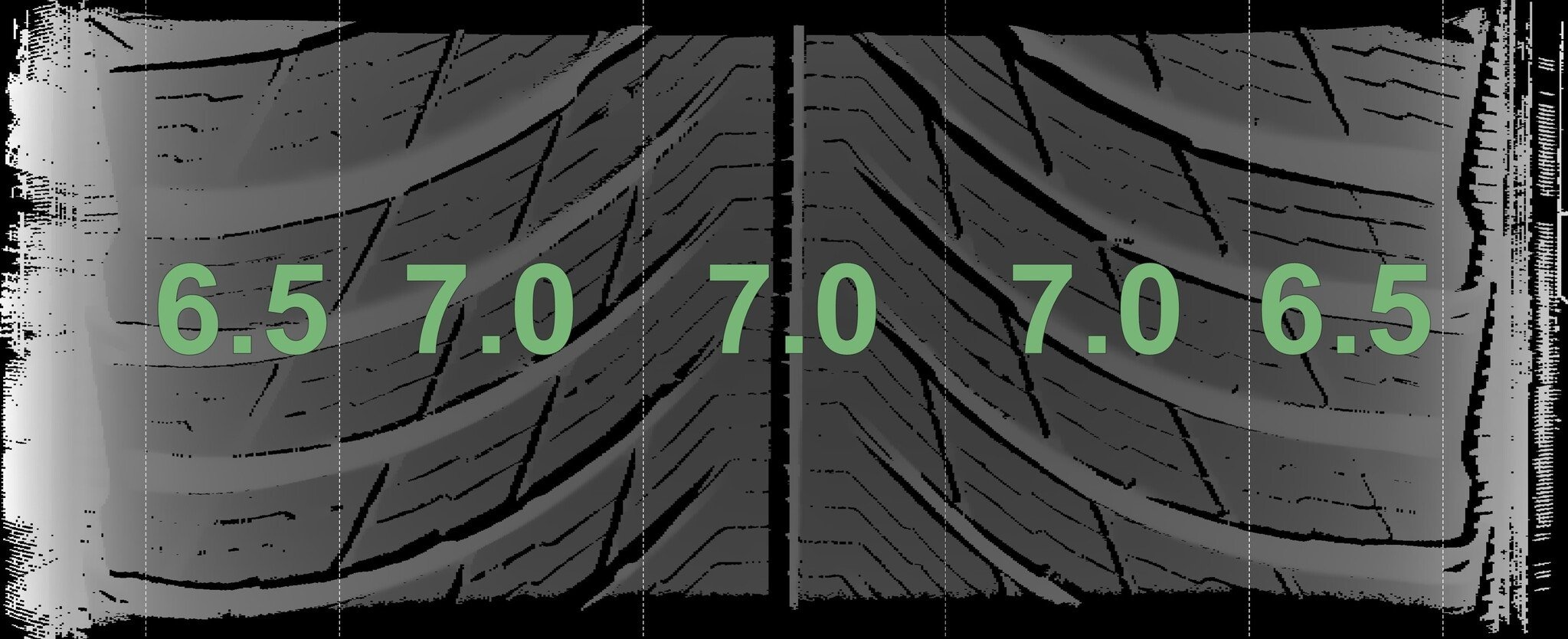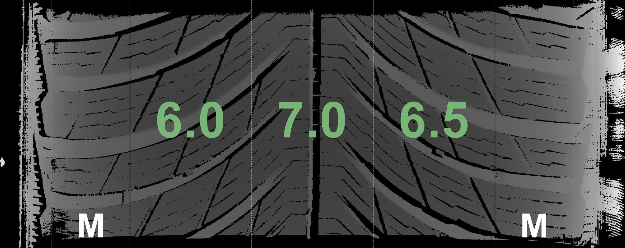 De gemeten profieldieptes en de details van de velgen zijn hierboven weergegeven.
