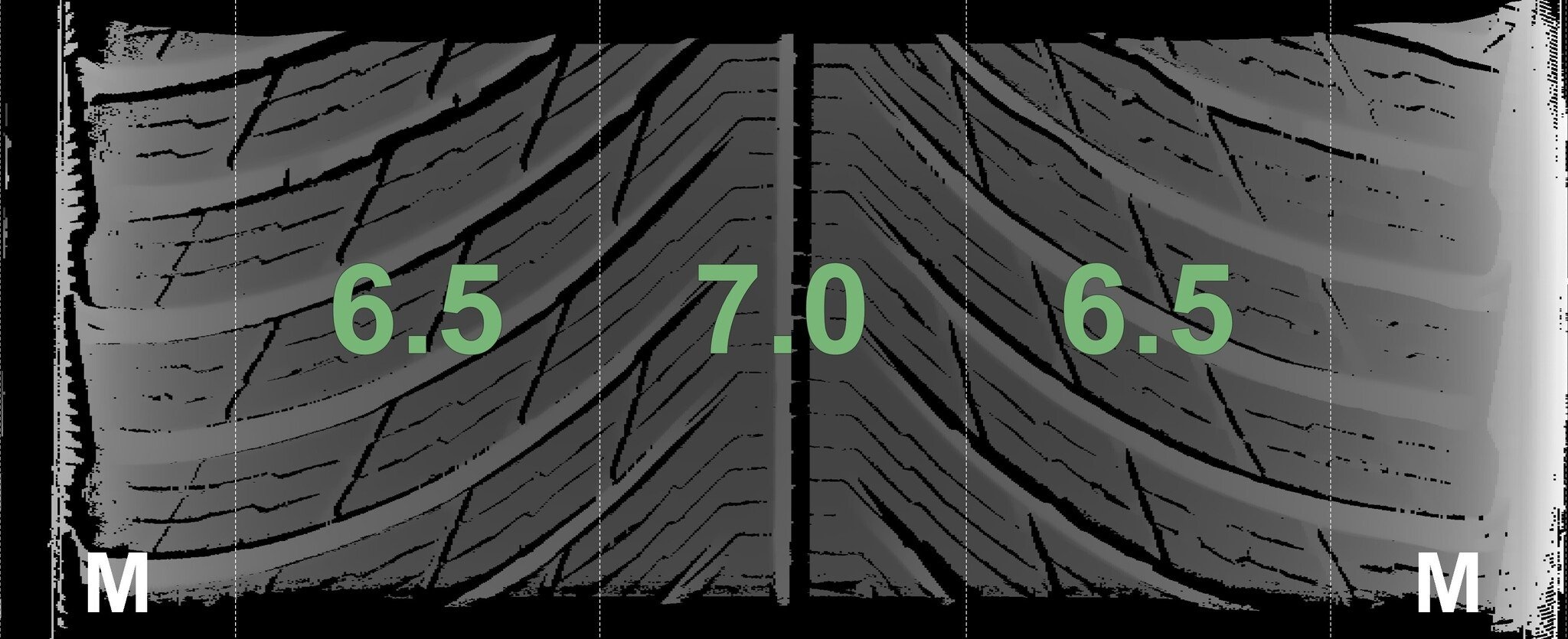 De gemeten profieldieptes en de details van de velgen zijn hierboven weergegeven.