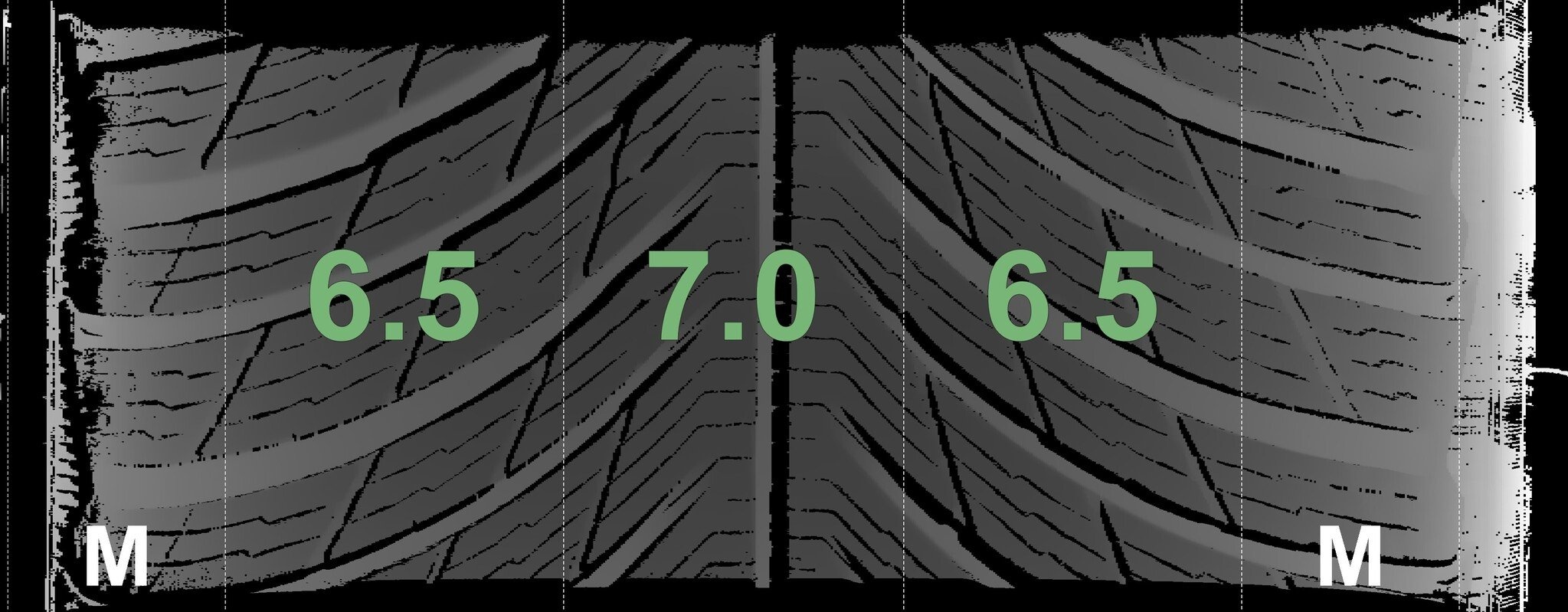 De gemeten profieldieptes en de details van de velgen zijn hierboven weergegeven.
