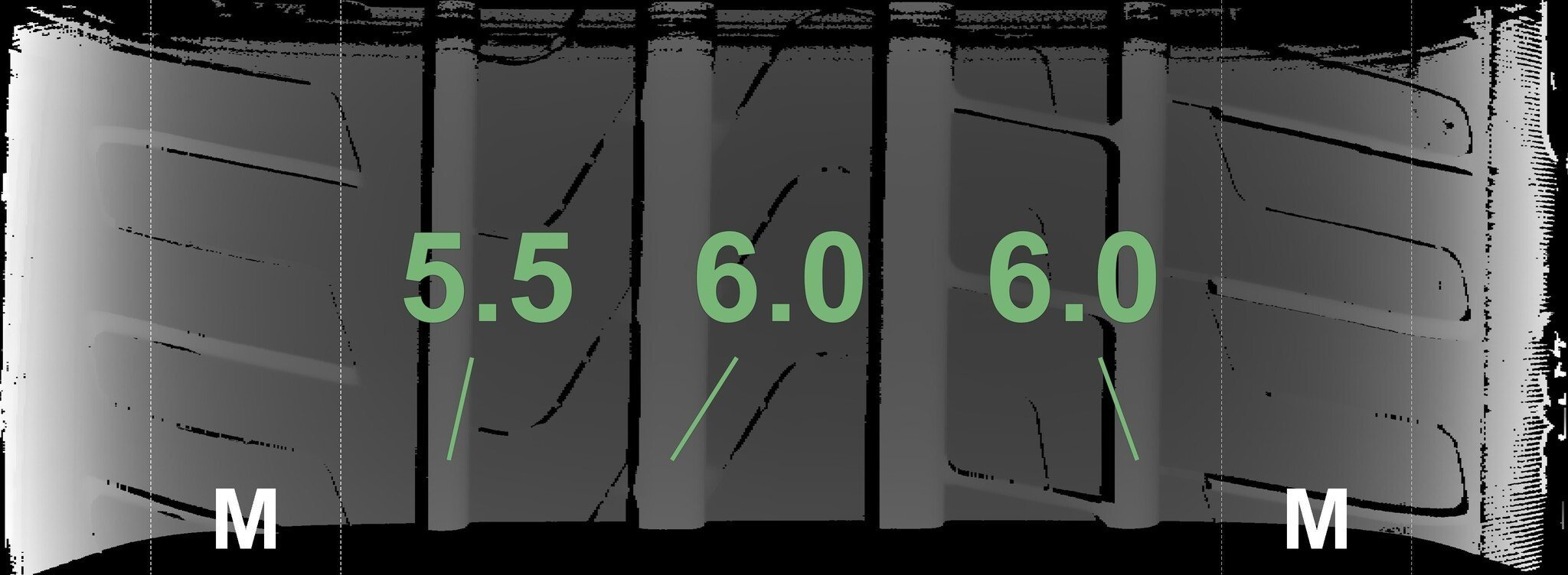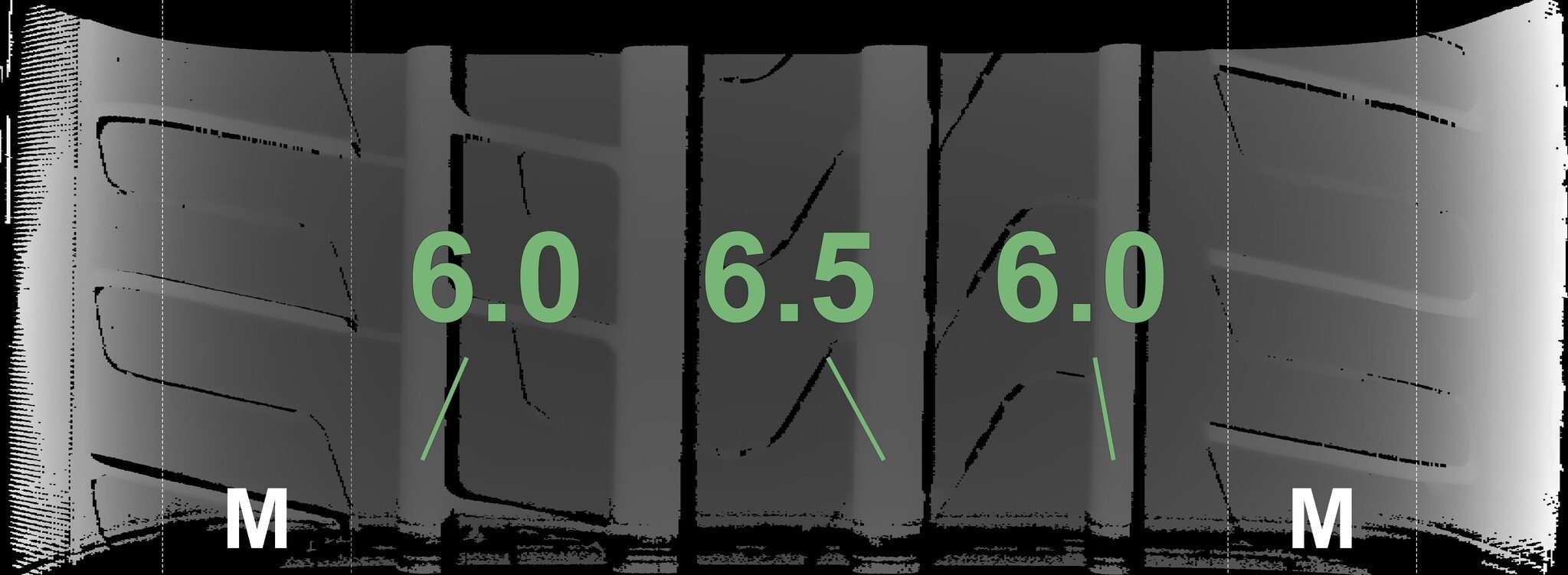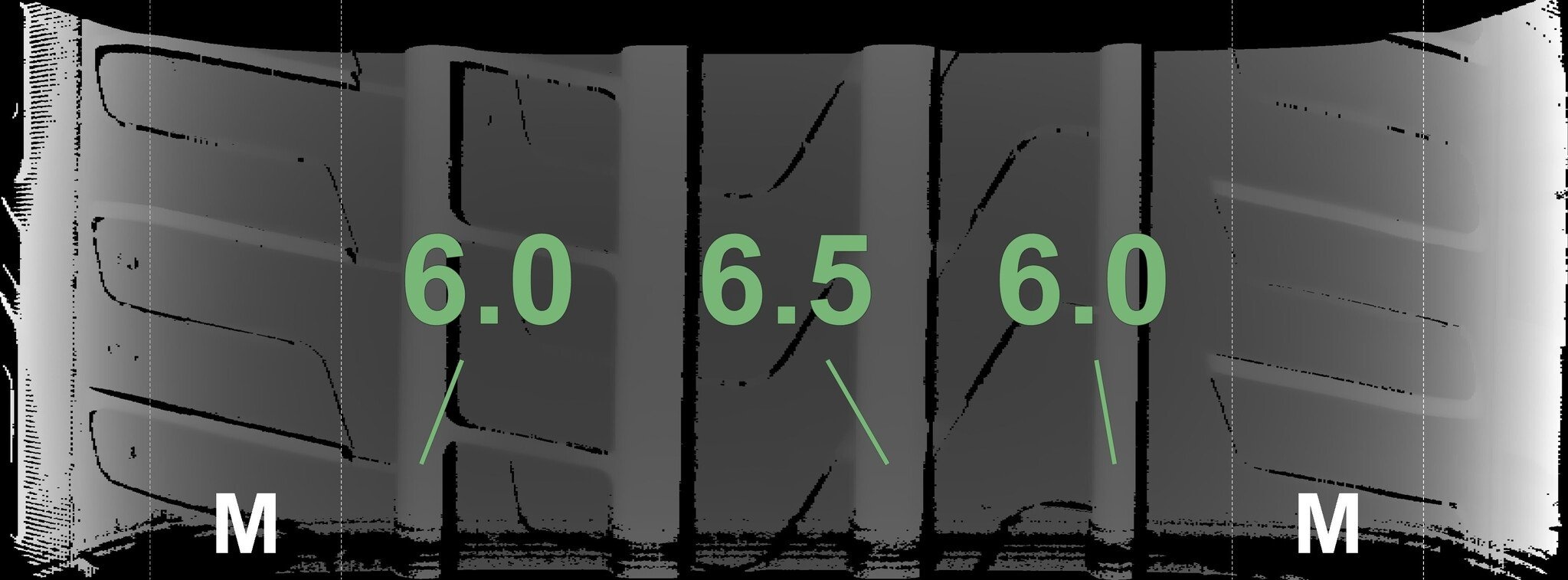 De gemeten profieldieptes en de details van de velgen zijn hierboven weergegeven.