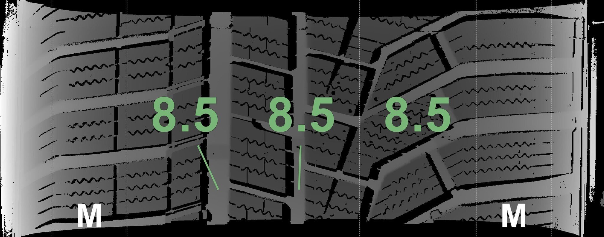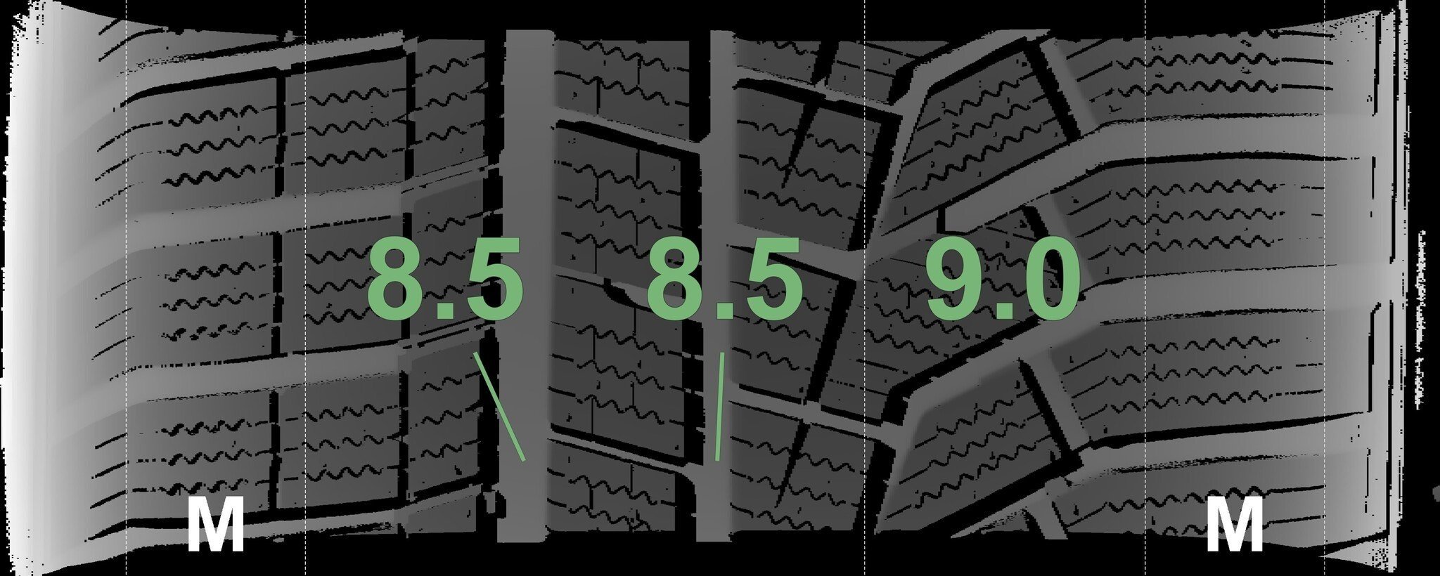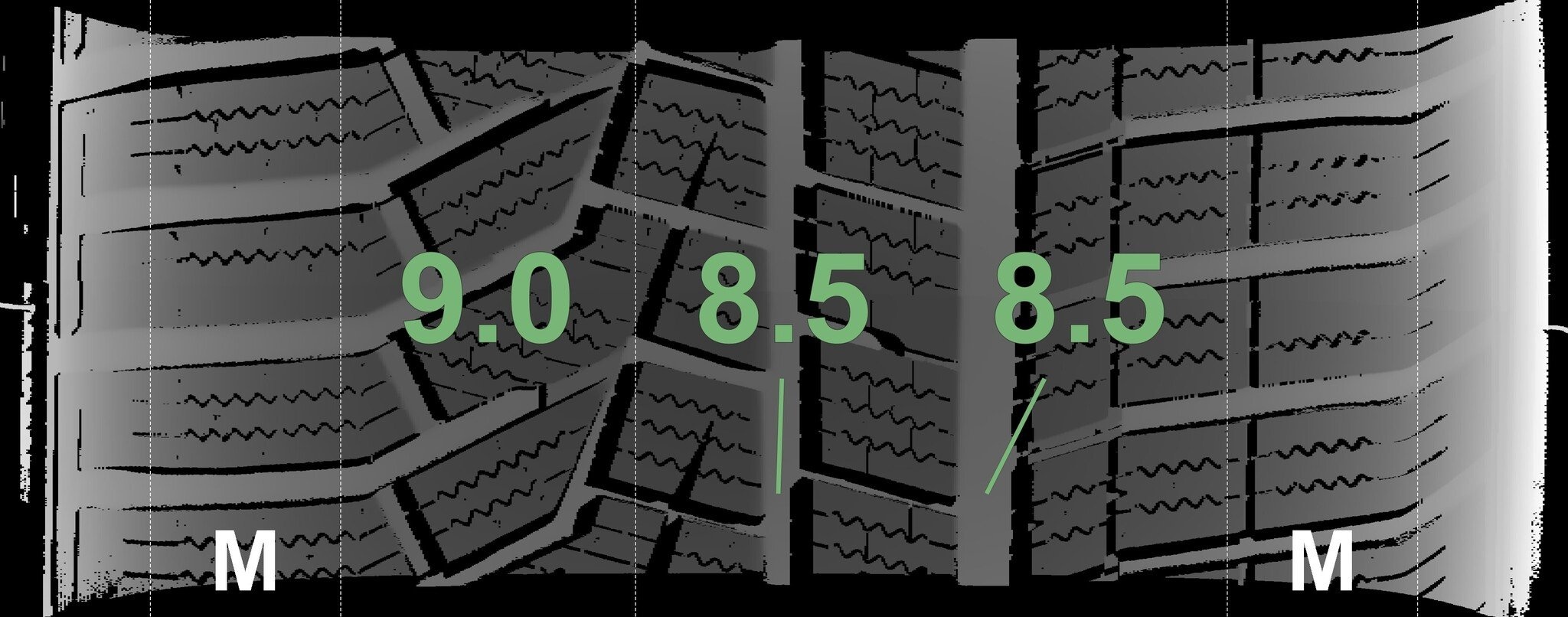 De gemeten profieldieptes en de details van de velgen zijn hierboven weergegeven.