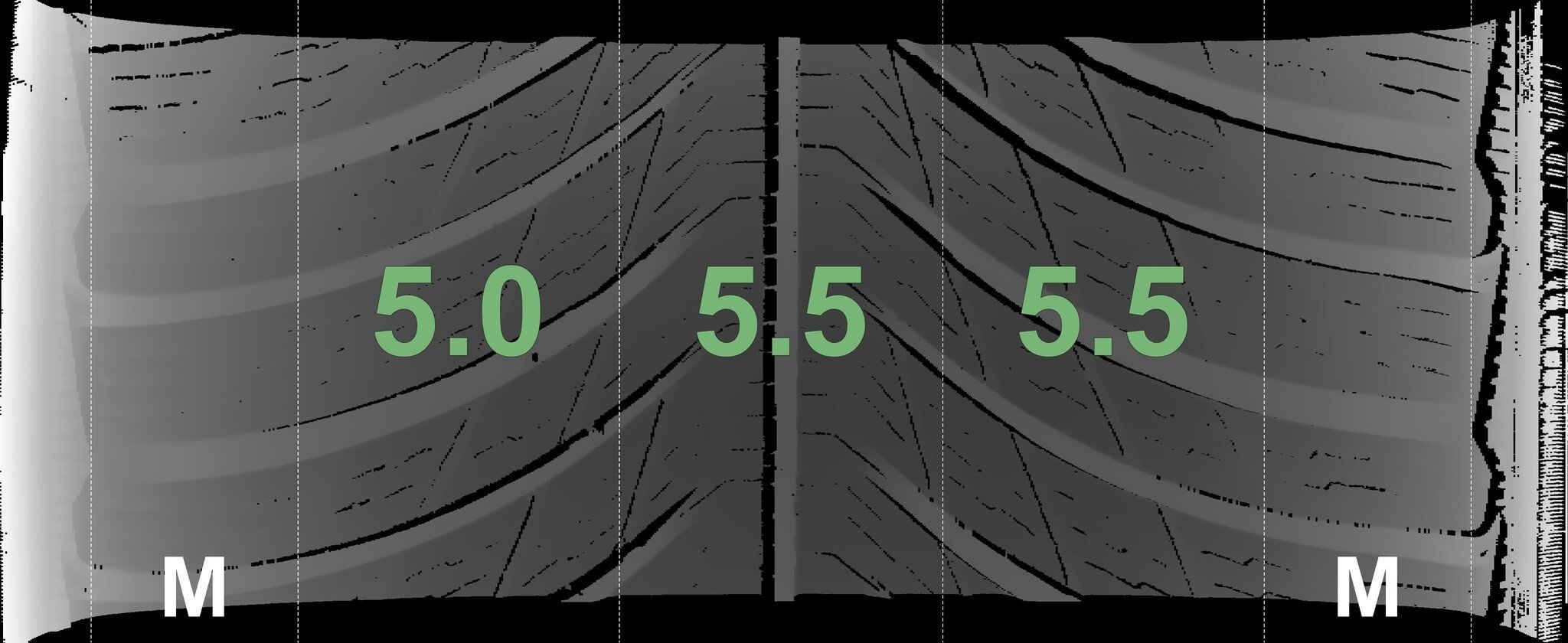 De gemeten profieldieptes en de details van de velgen zijn hierboven weergegeven.