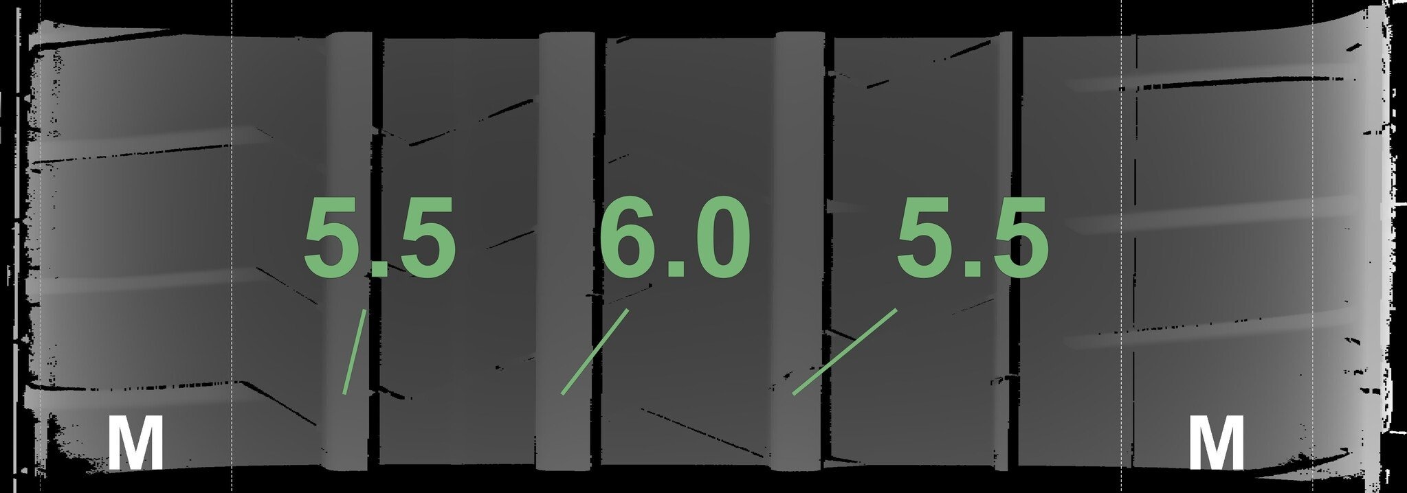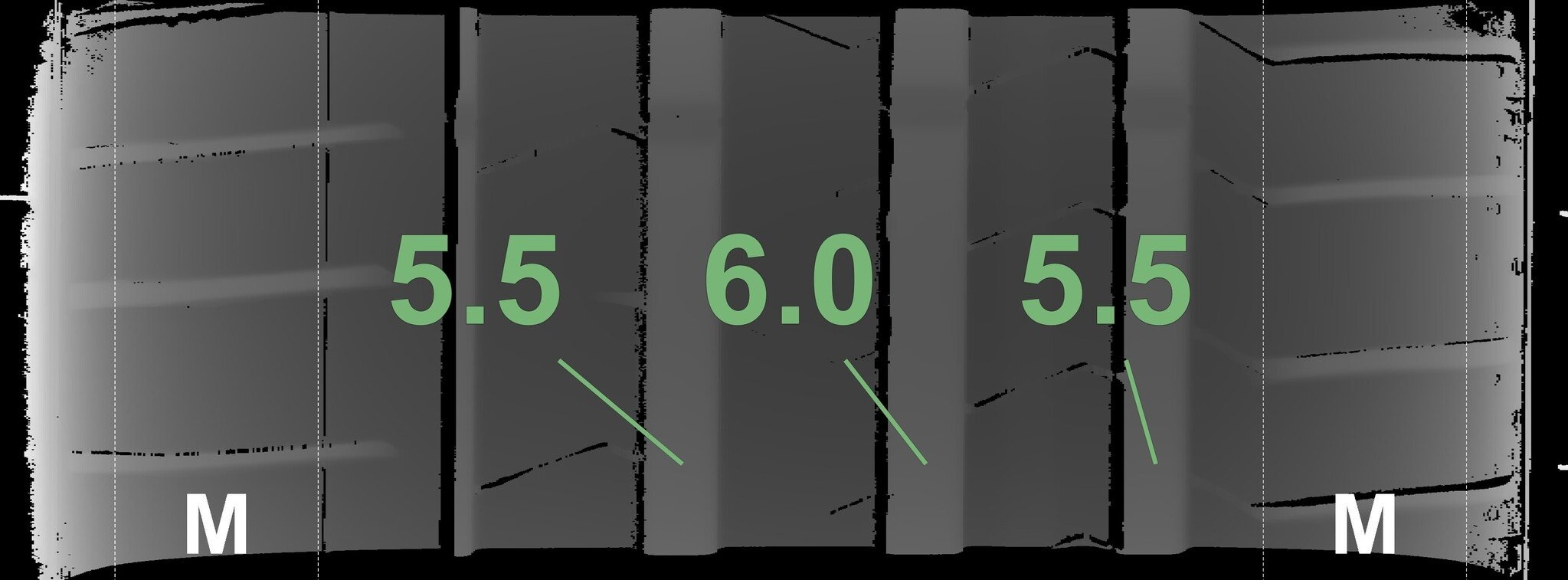 De gemeten profieldieptes en de details van de velgen zijn hierboven weergegeven.