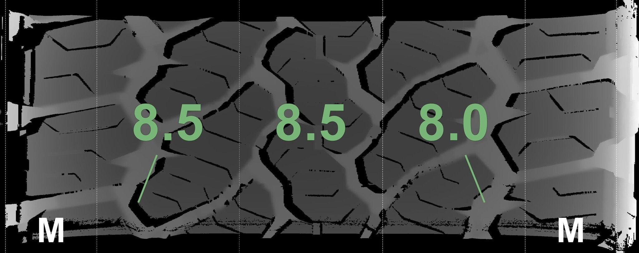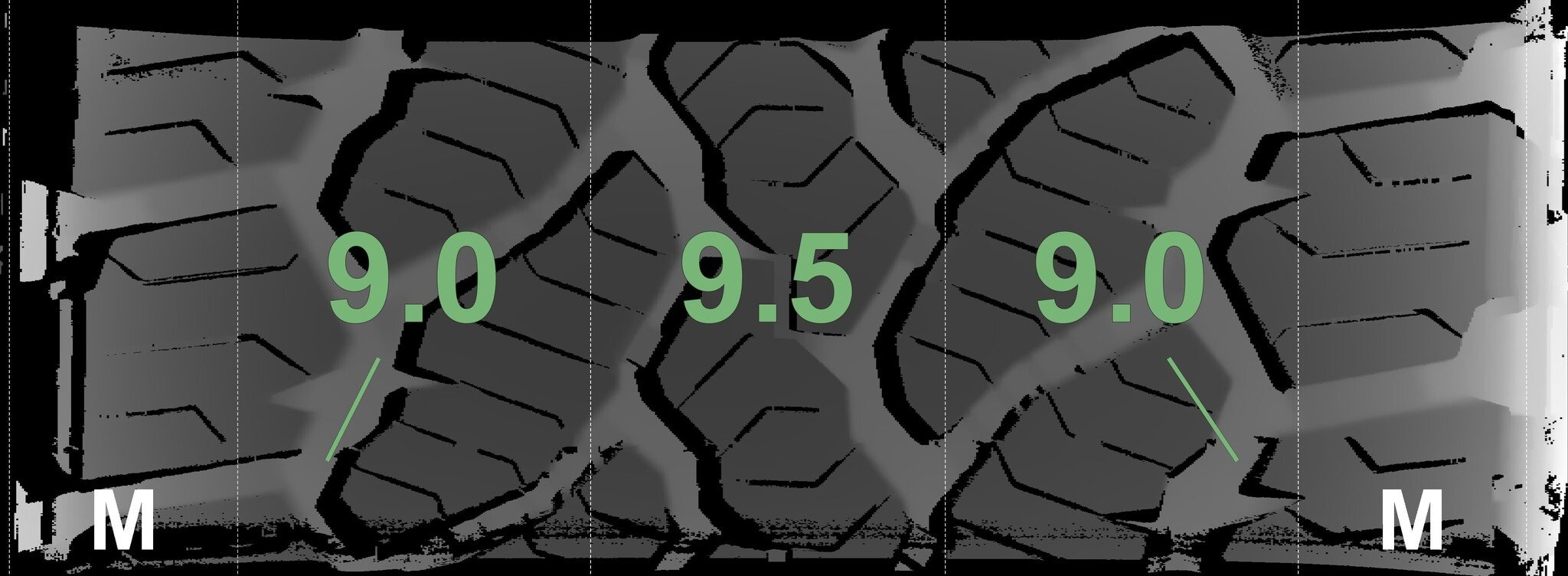 De gemeten profieldieptes en de details van de velgen zijn hierboven weergegeven.