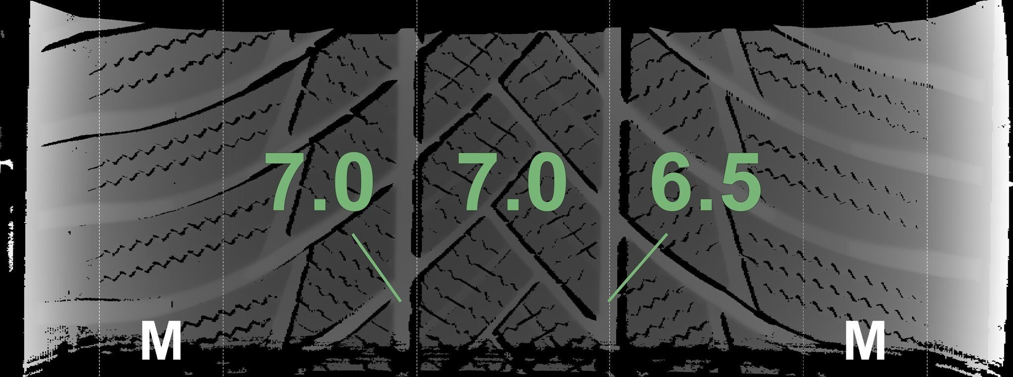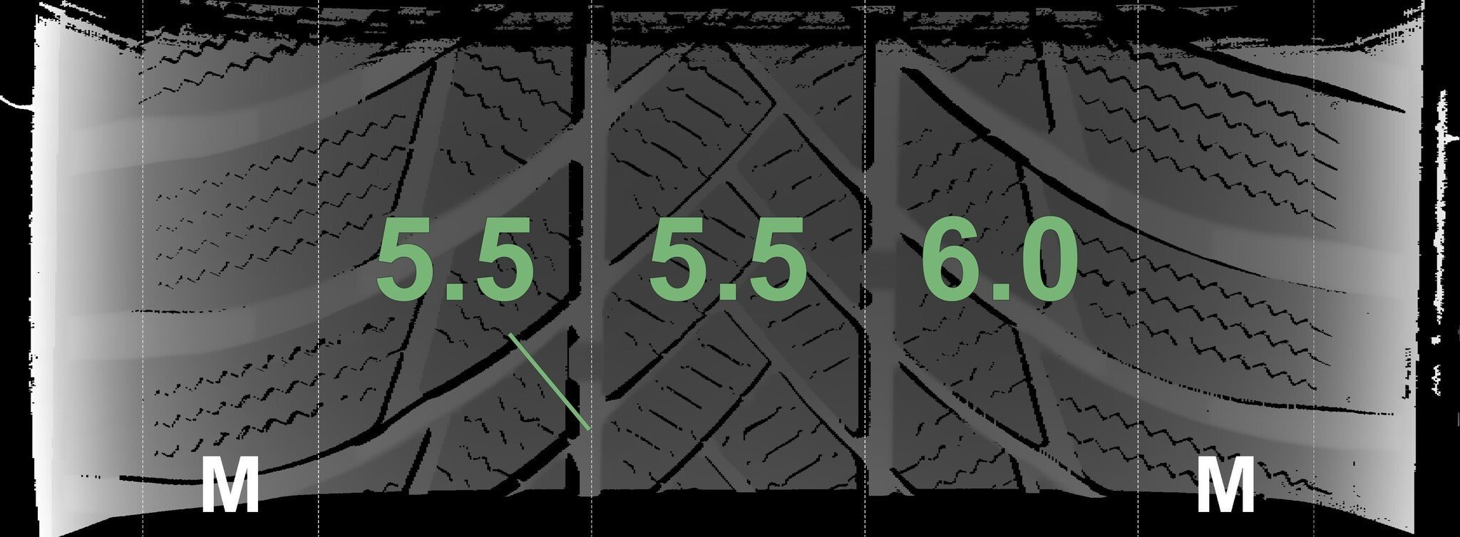 De gemeten profieldieptes en de details van de velgen zijn hierboven weergegeven.