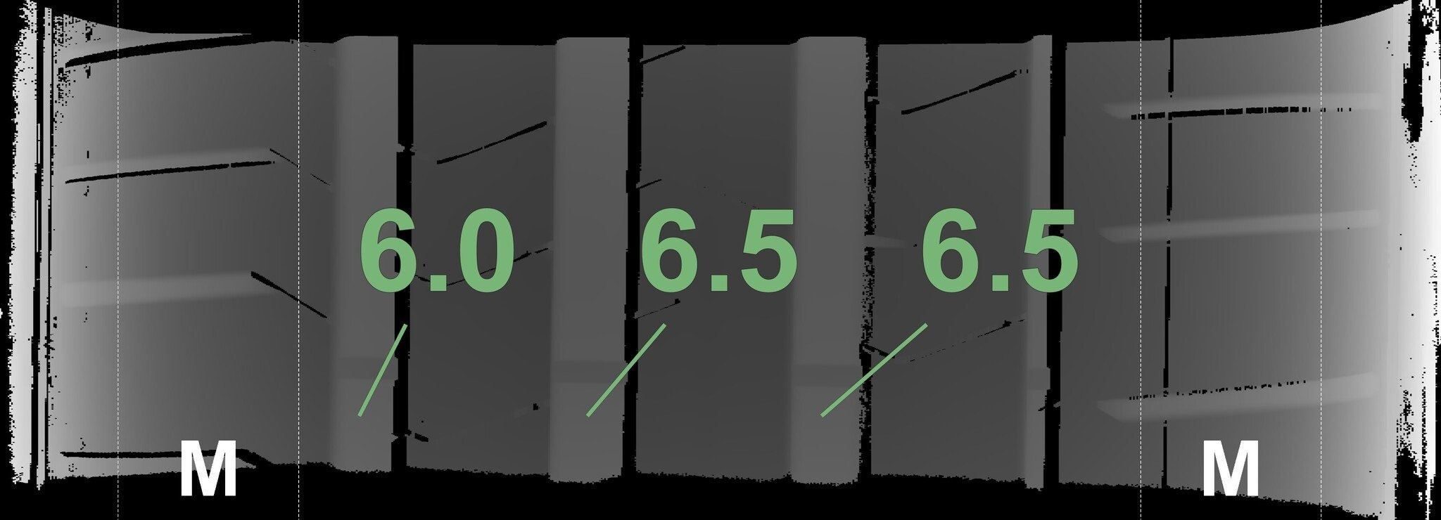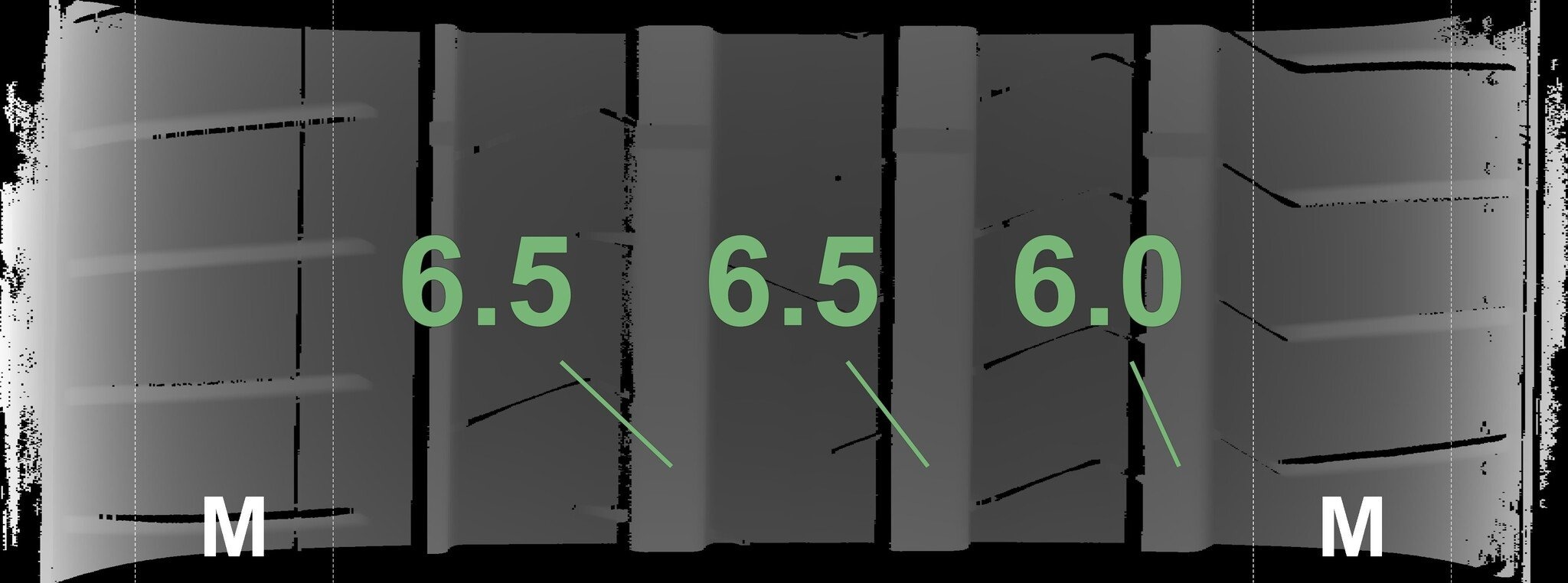 De gemeten profieldieptes en de details van de velgen zijn hierboven weergegeven.
