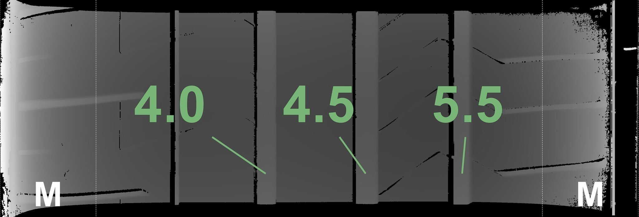 De gemeten profieldieptes en de details van de velgen zijn hierboven weergegeven.