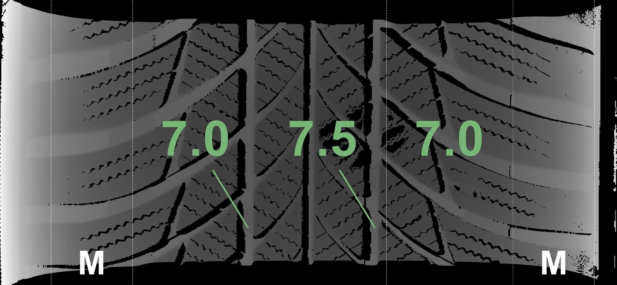 De gemeten profieldieptes en de details van de velgen zijn hierboven weergegeven.