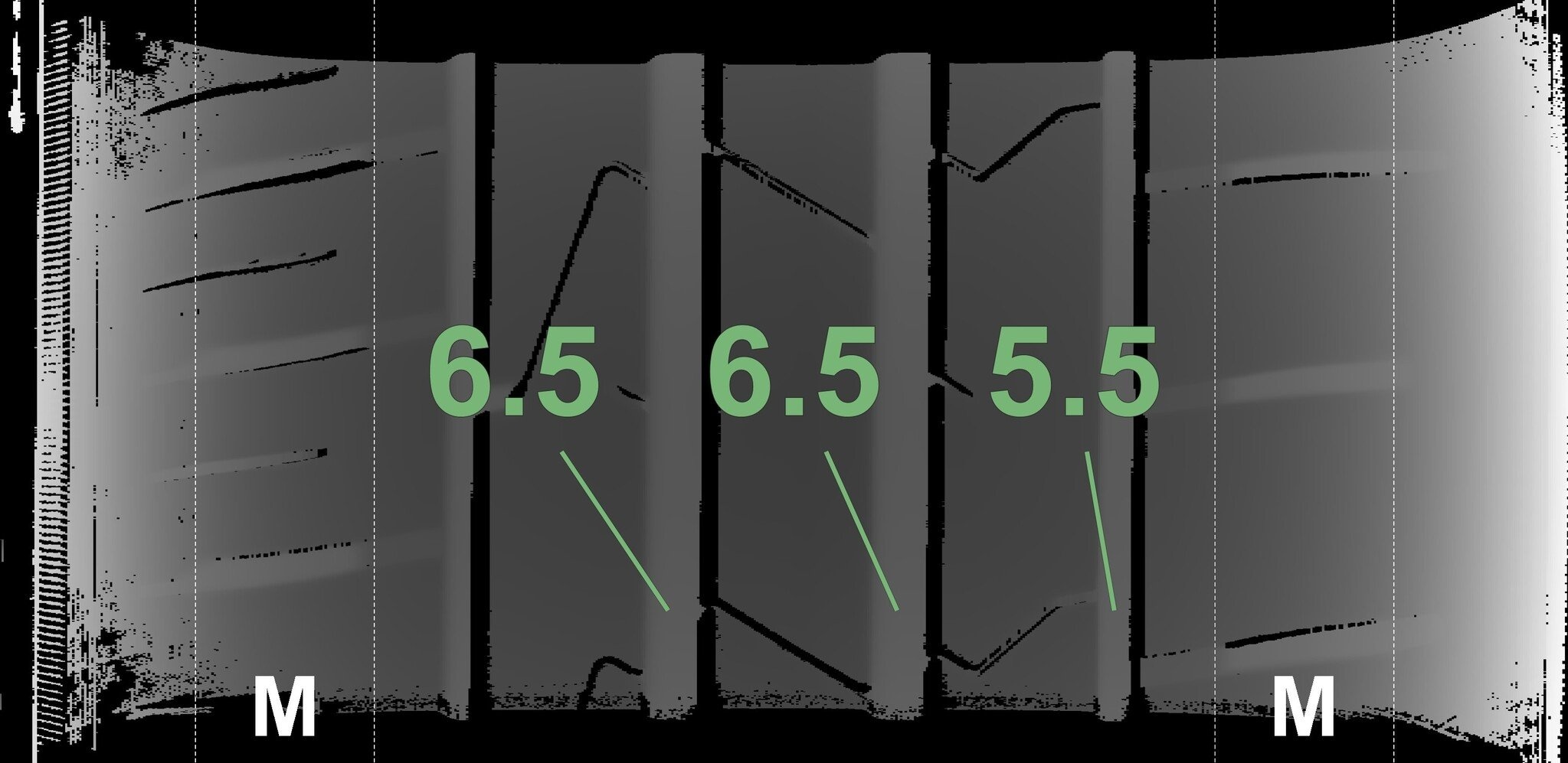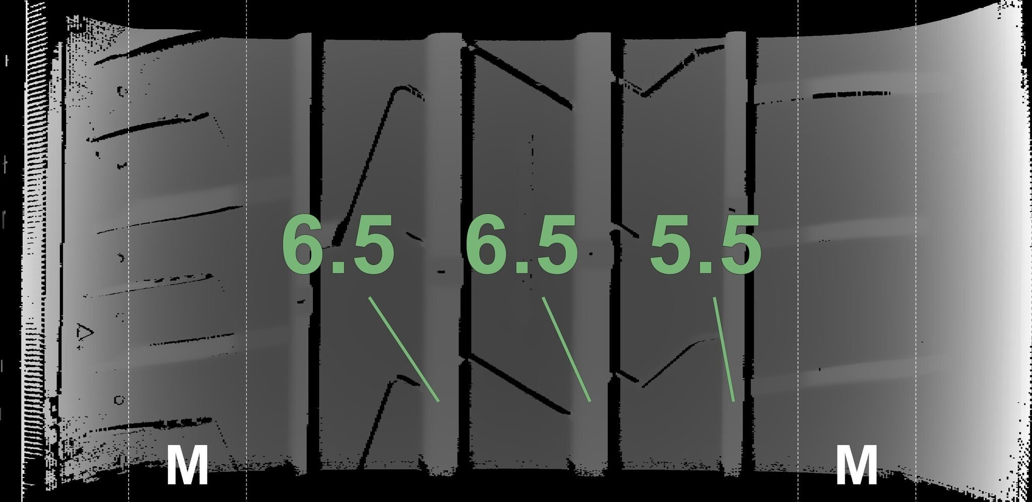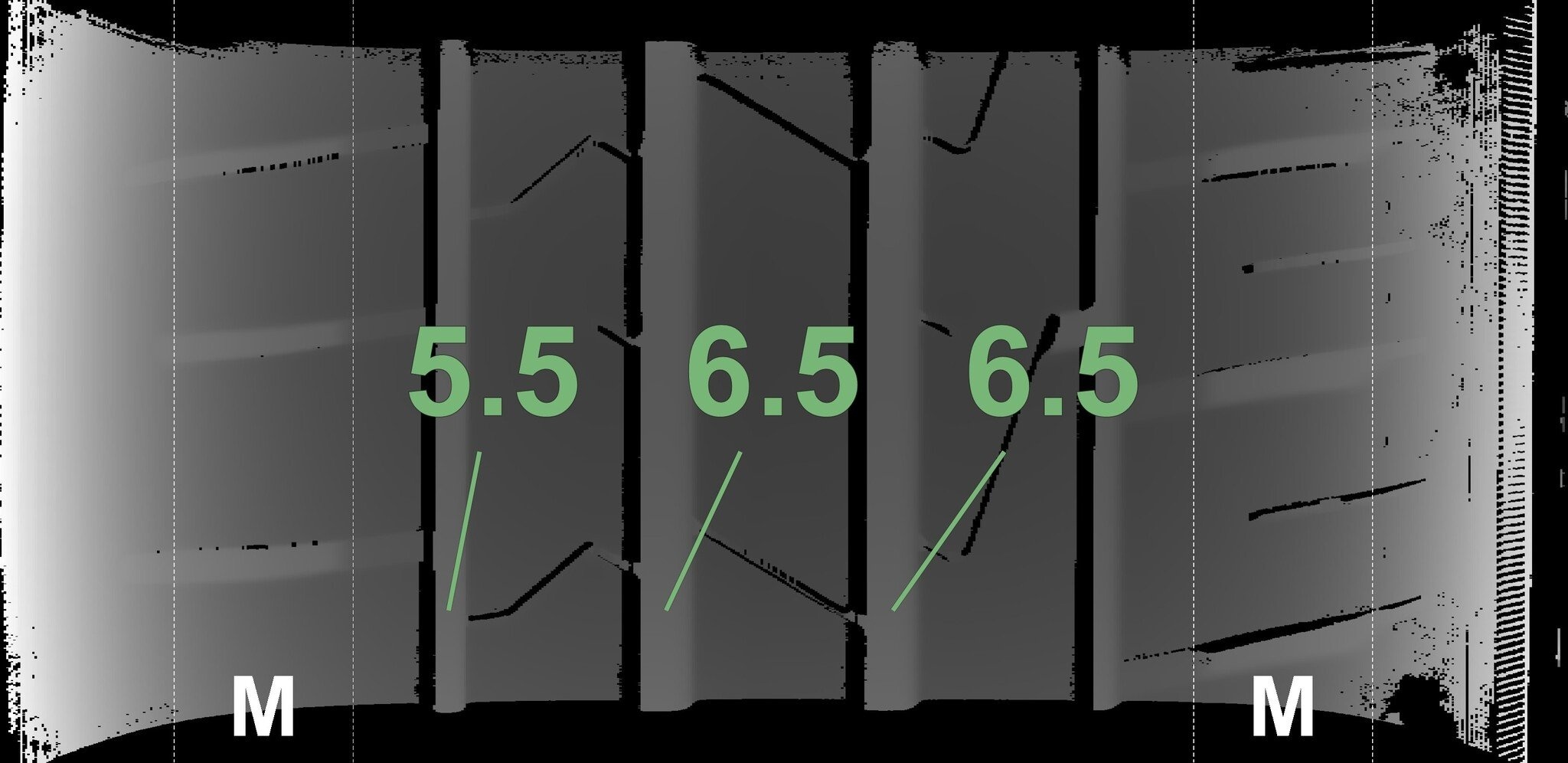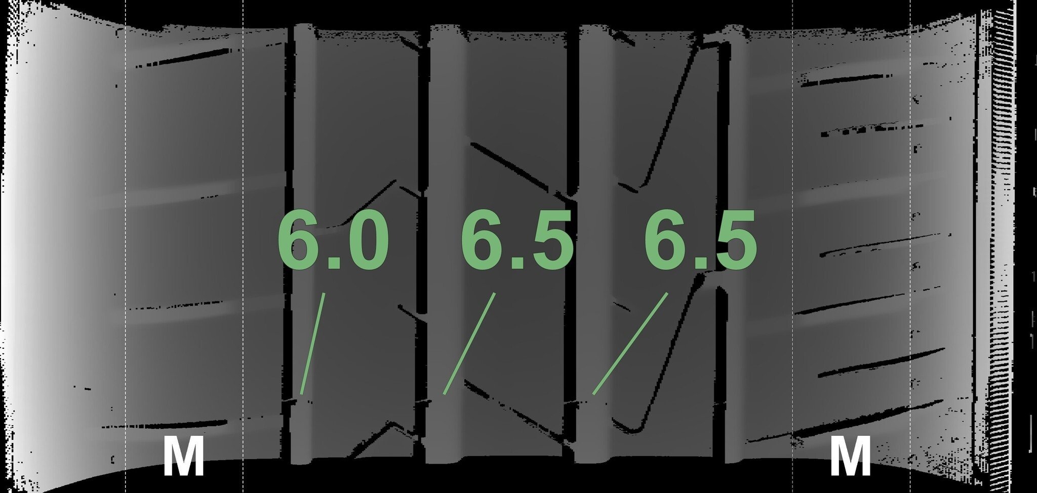De gemeten profieldieptes en de details van de velgen zijn hierboven weergegeven.