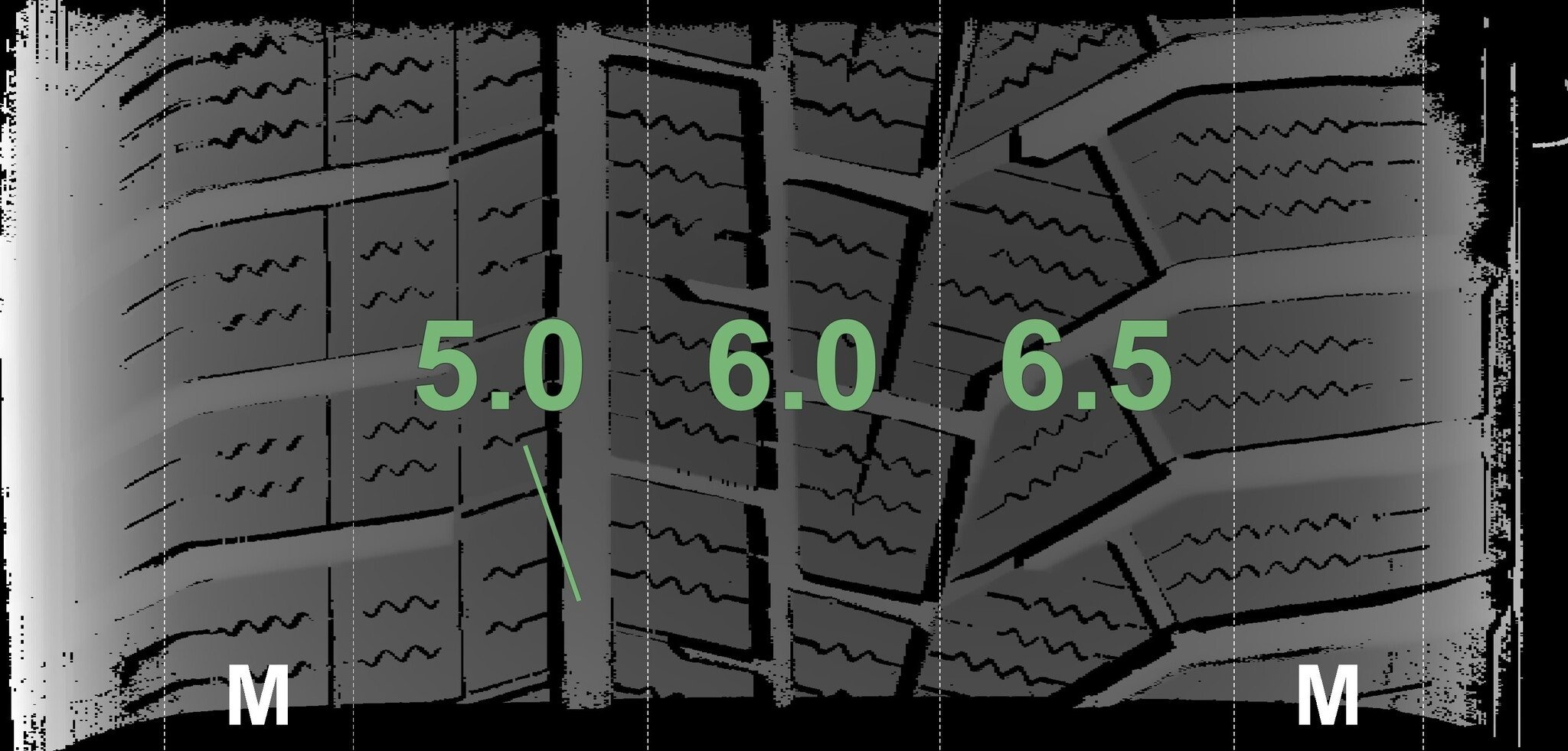 De gemeten profieldieptes en de details van de velgen zijn hierboven weergegeven.