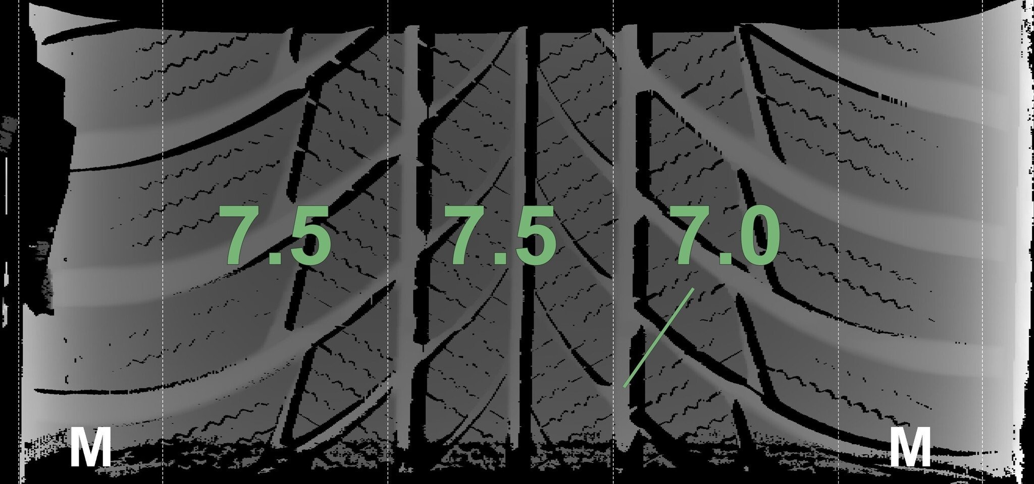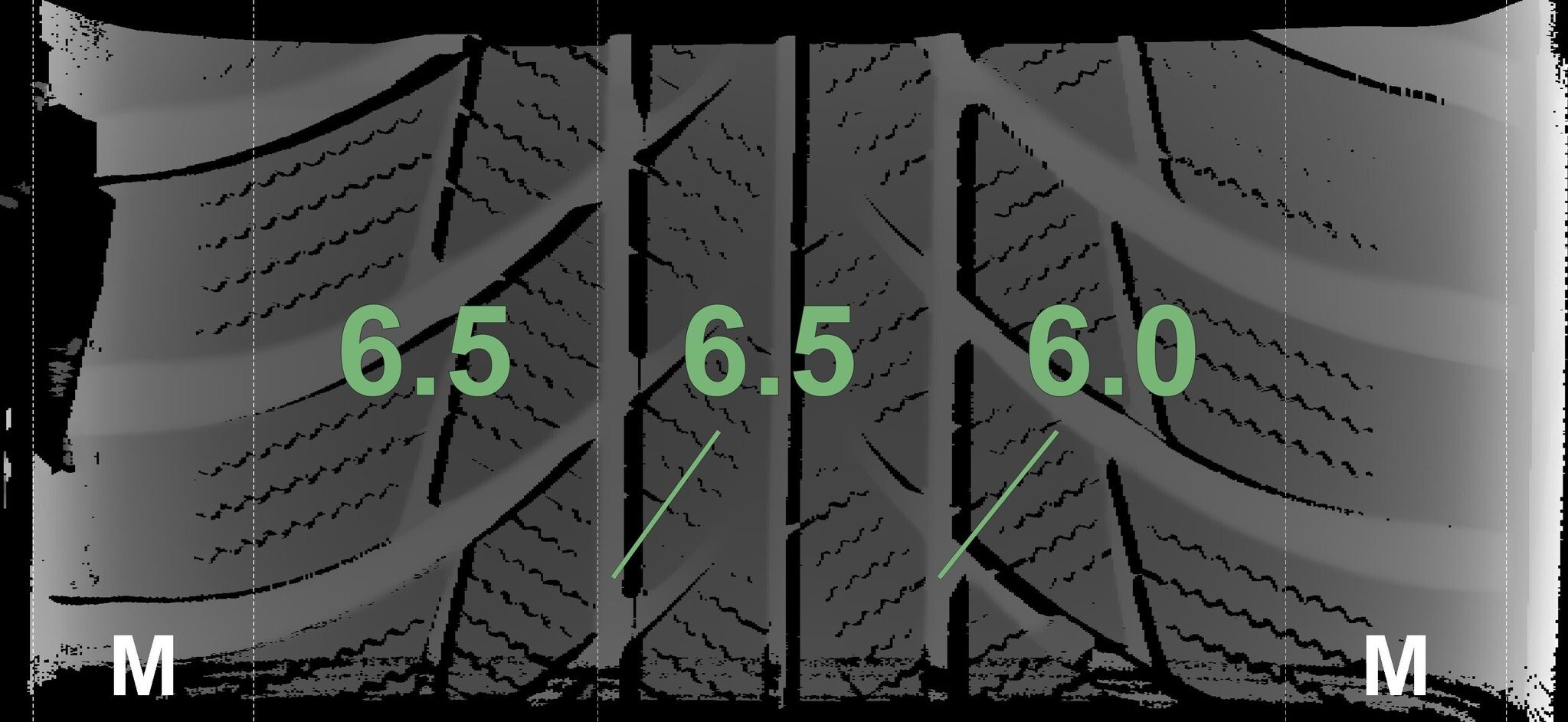 De gemeten profieldieptes en de details van de velgen zijn hierboven weergegeven.