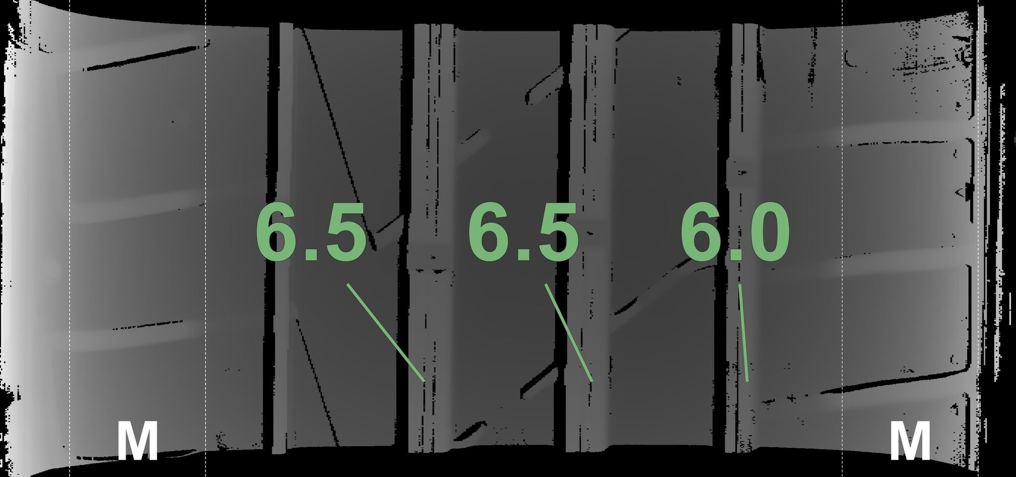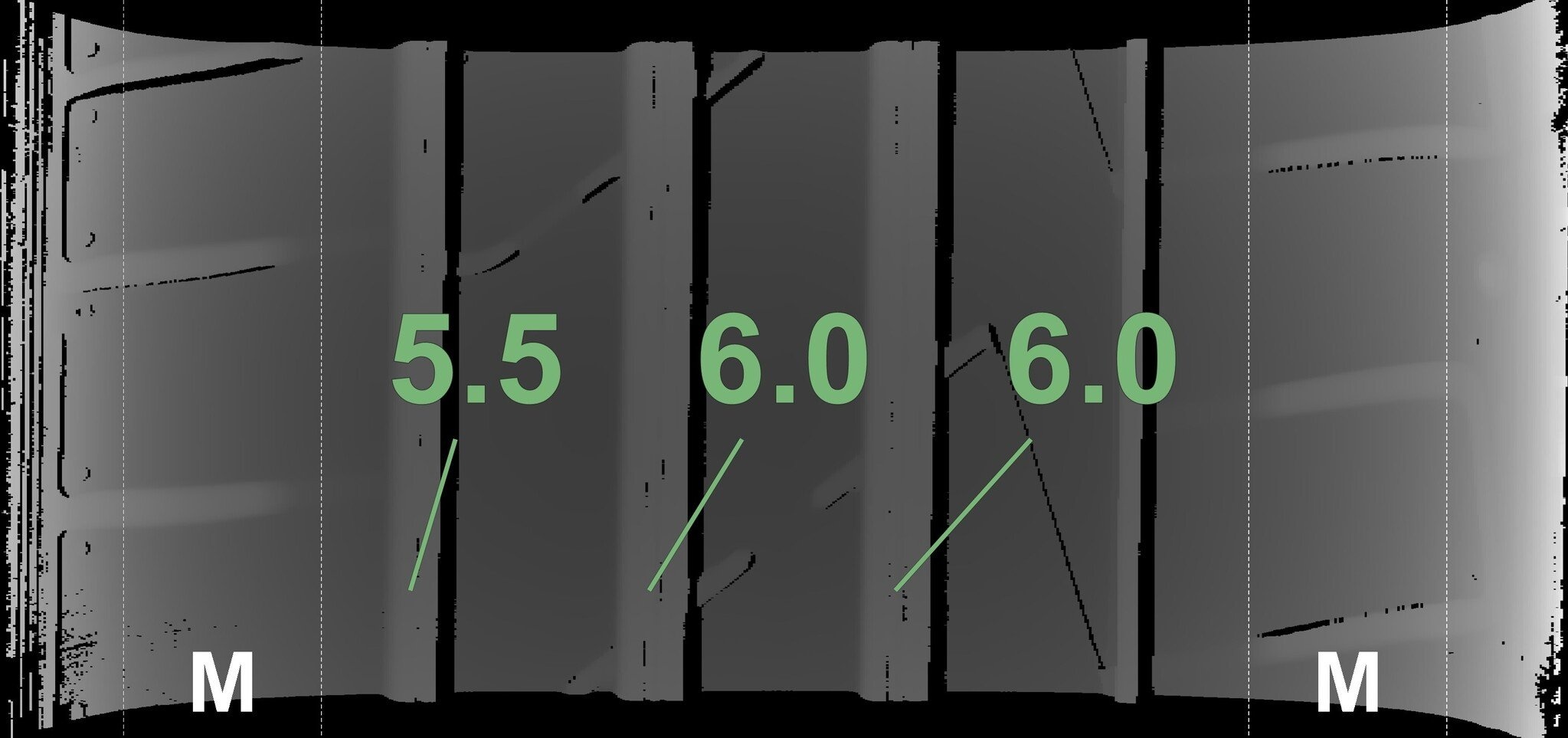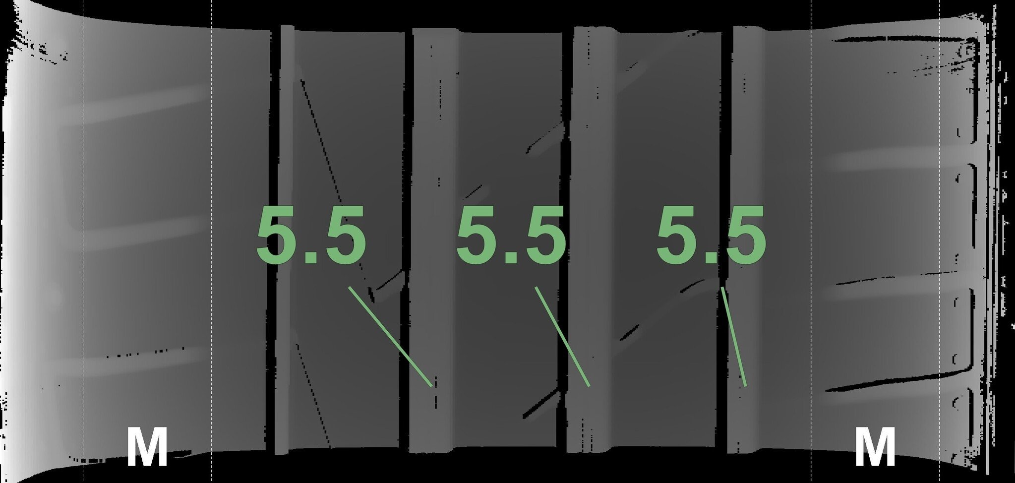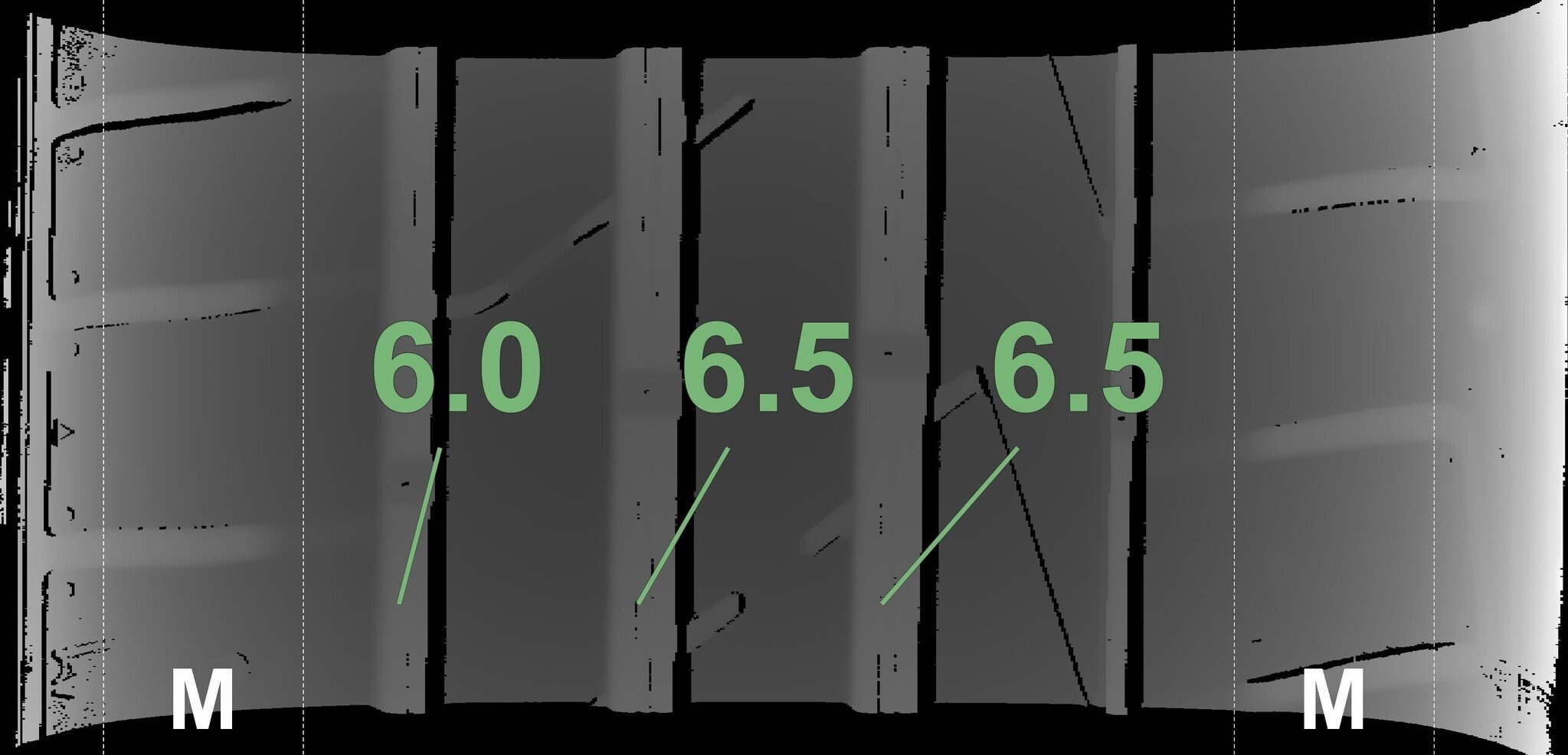 De gemeten profieldieptes en de details van de velgen zijn hierboven weergegeven.