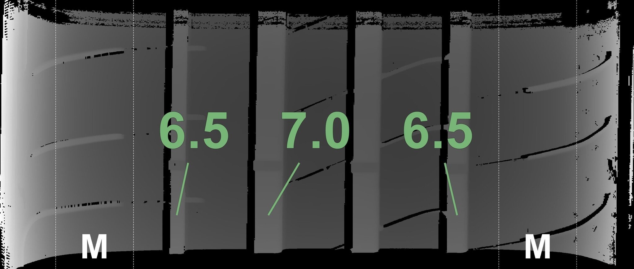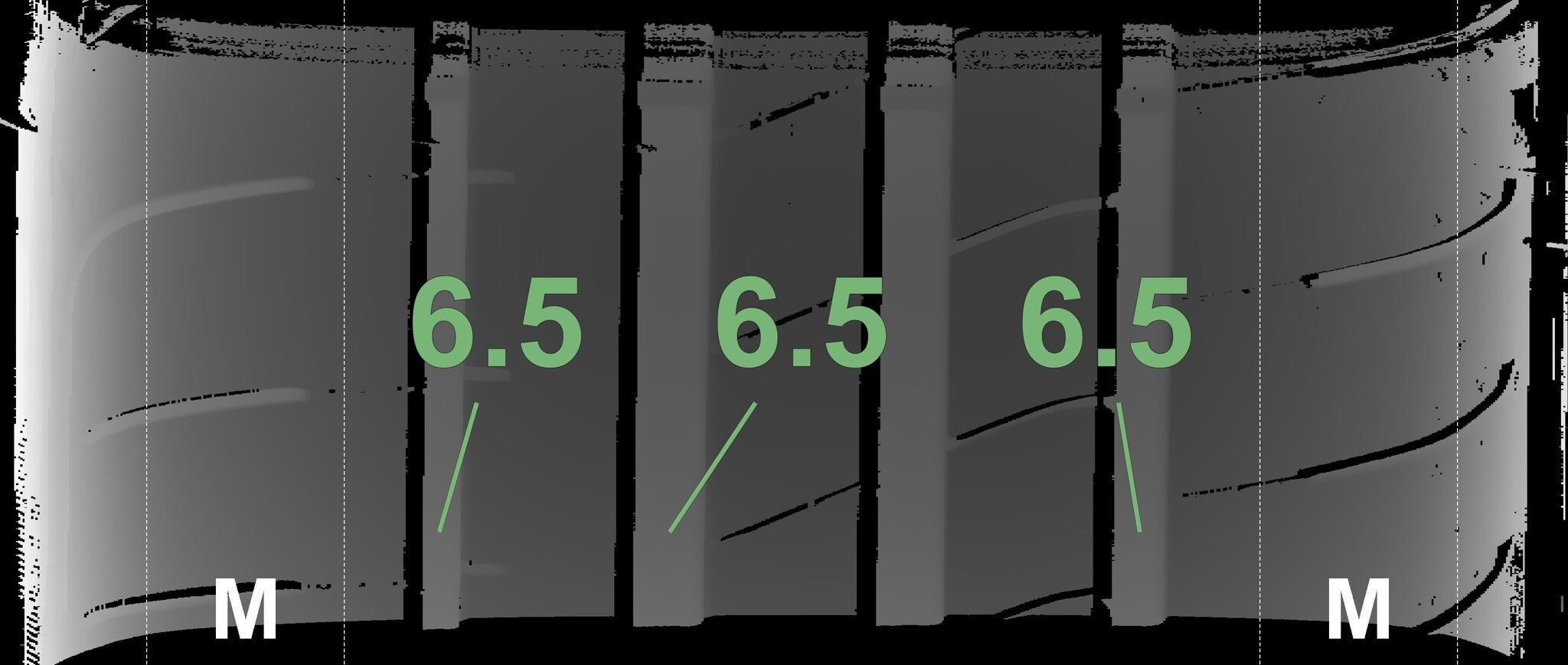 De gemeten profieldieptes en de details van de velgen zijn hierboven weergegeven.