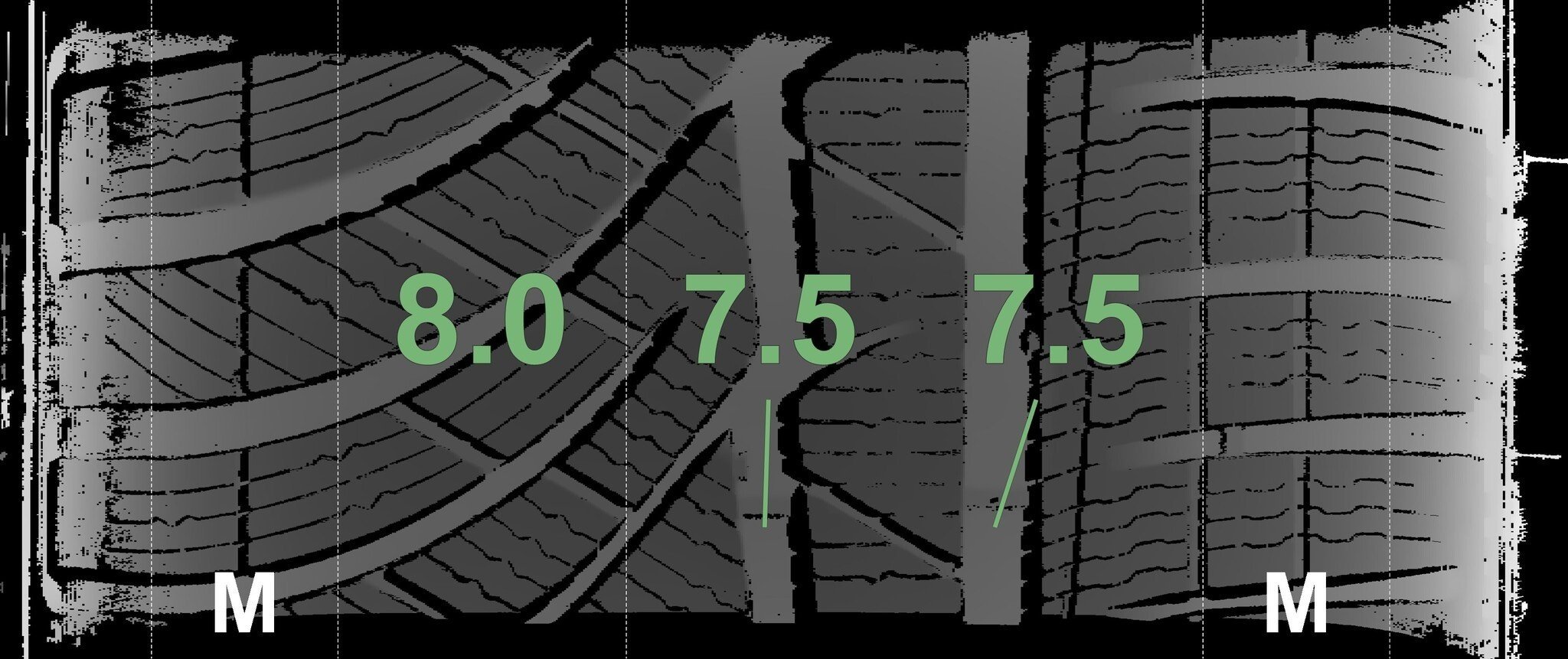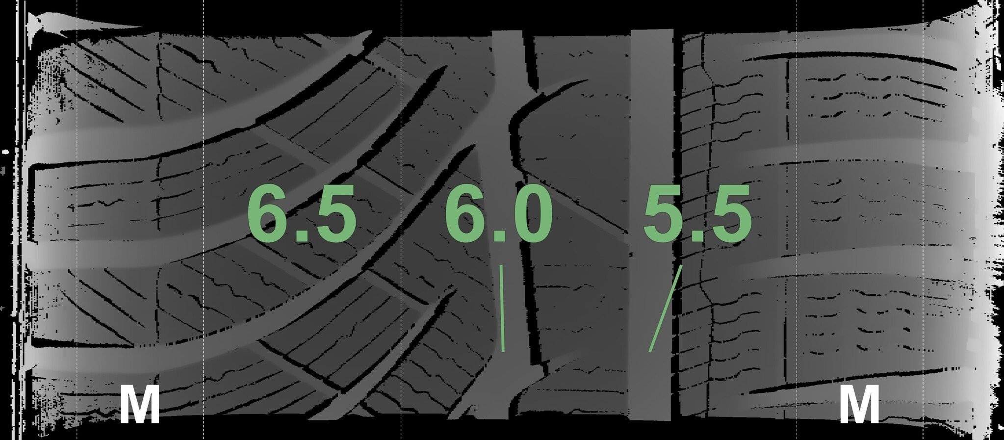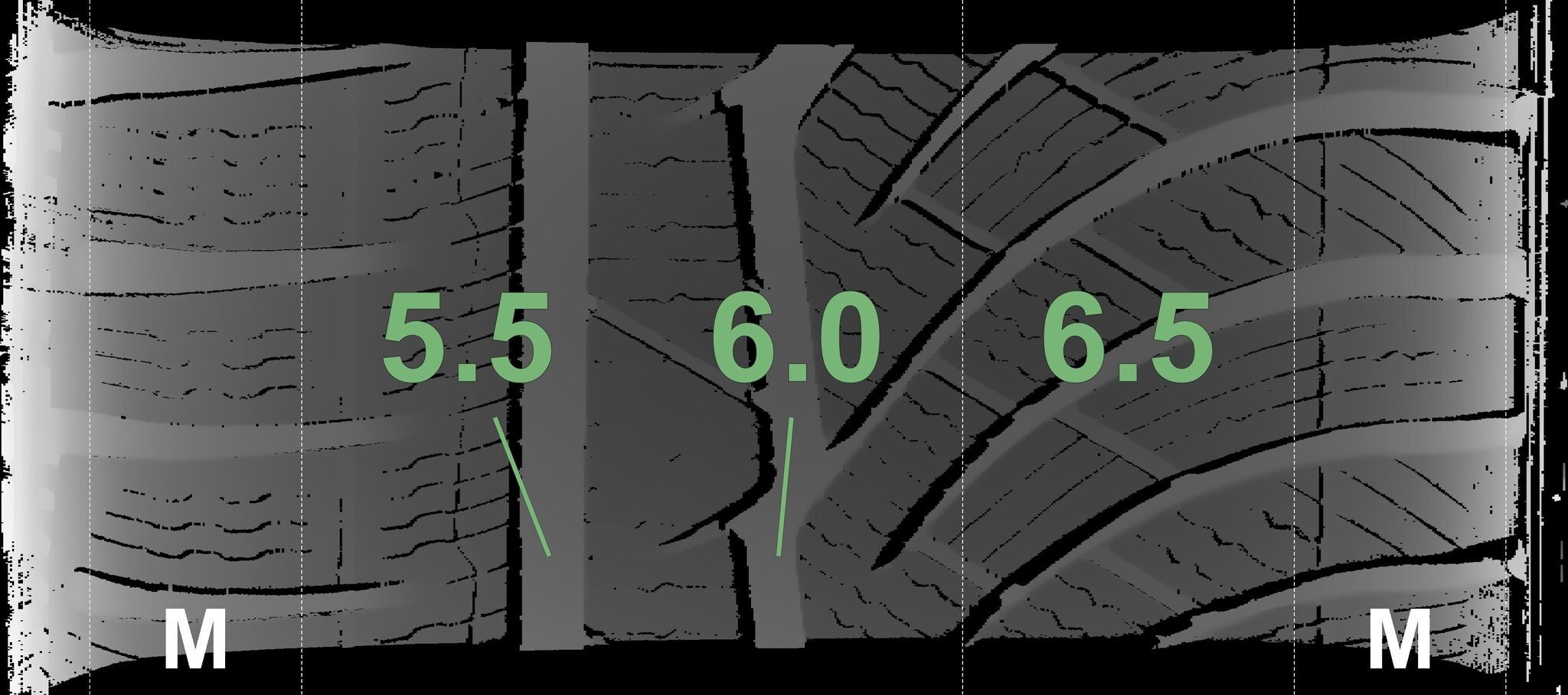 De gemeten profieldieptes en de details van de velgen zijn hierboven weergegeven.