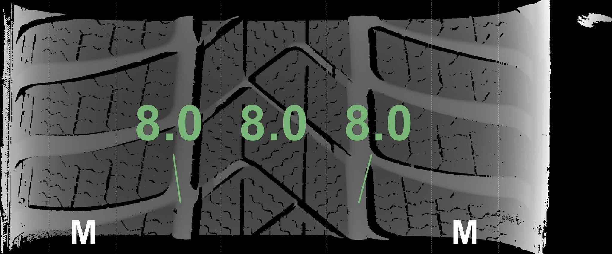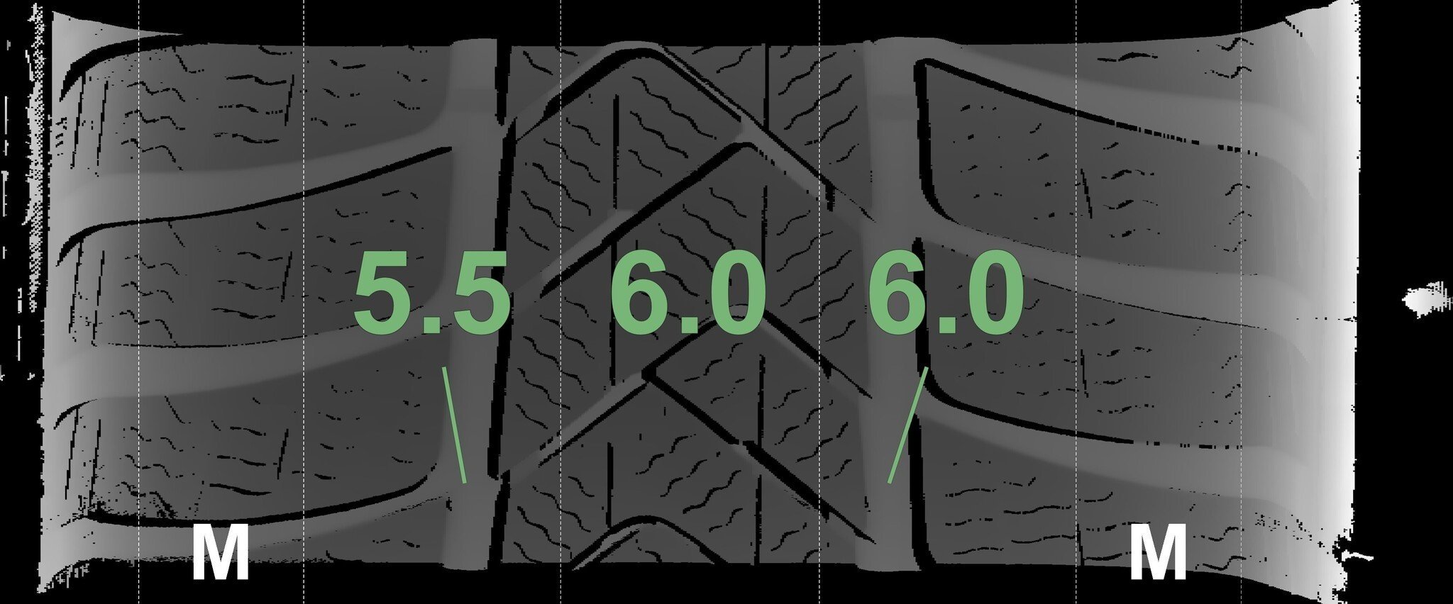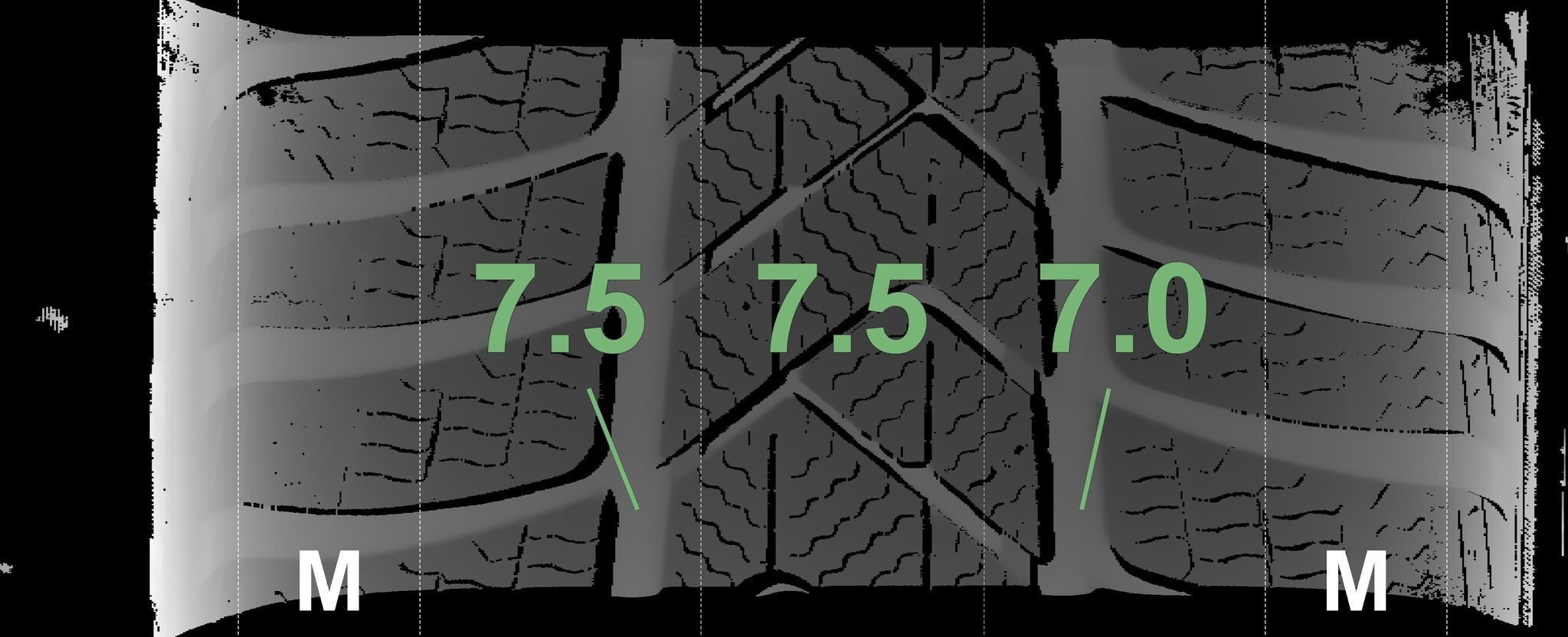 De gemeten profieldieptes en de details van de velgen zijn hierboven weergegeven.