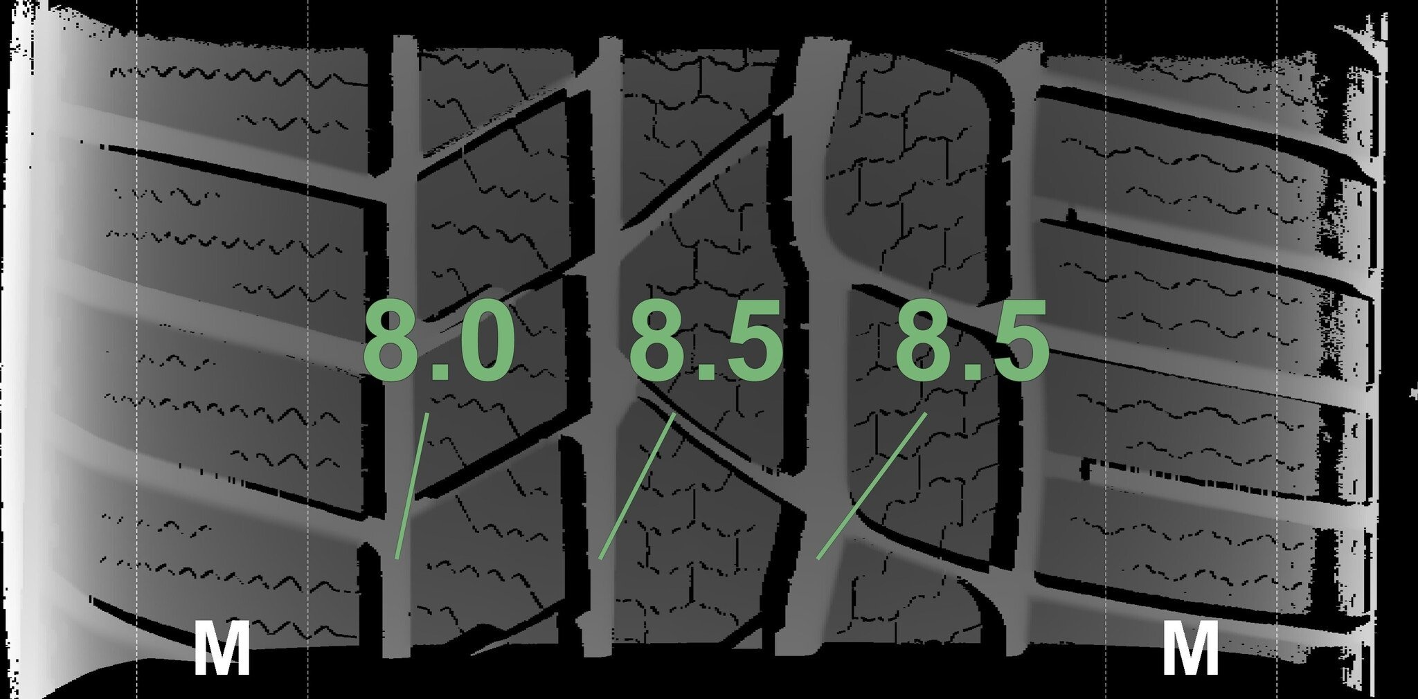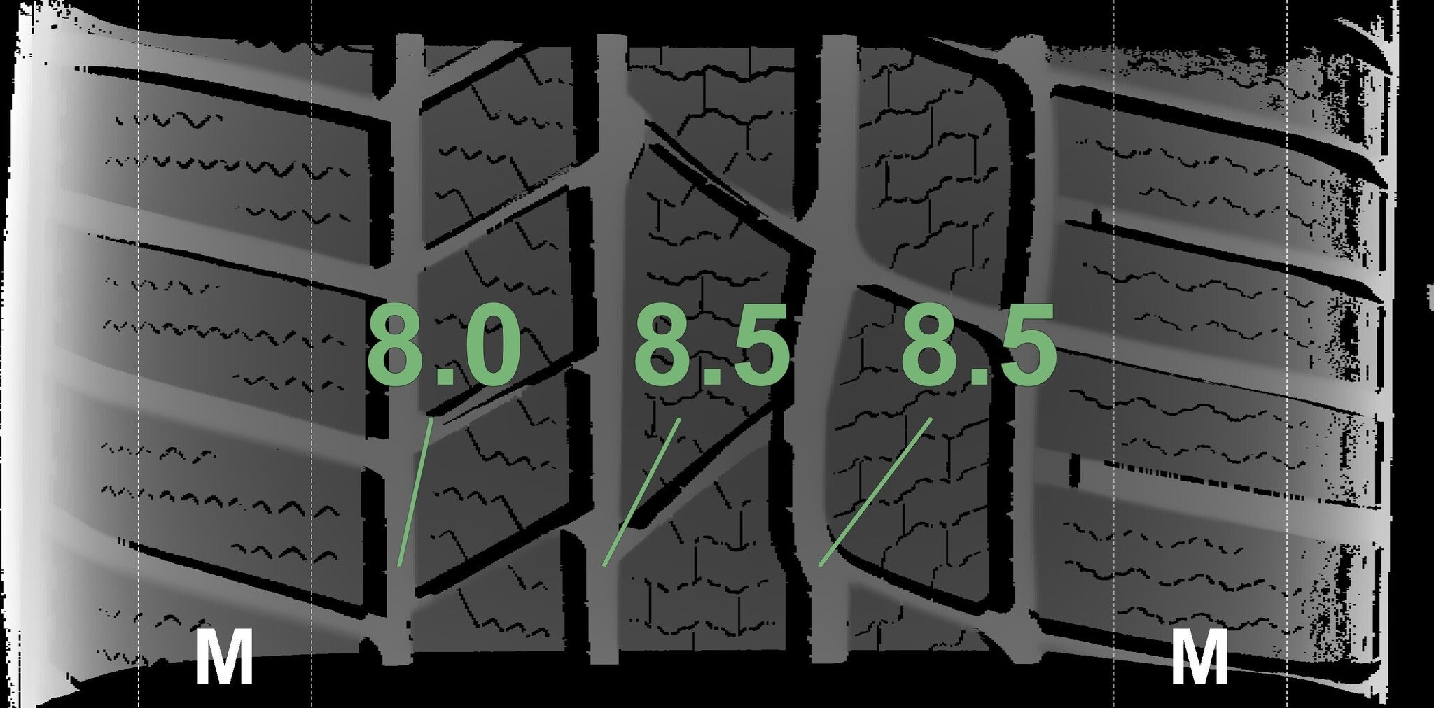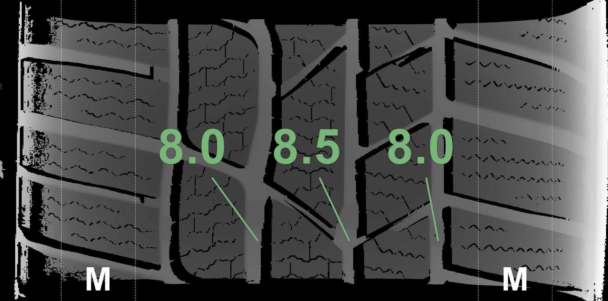 De gemeten profieldieptes en de details van de velgen zijn hierboven weergegeven.