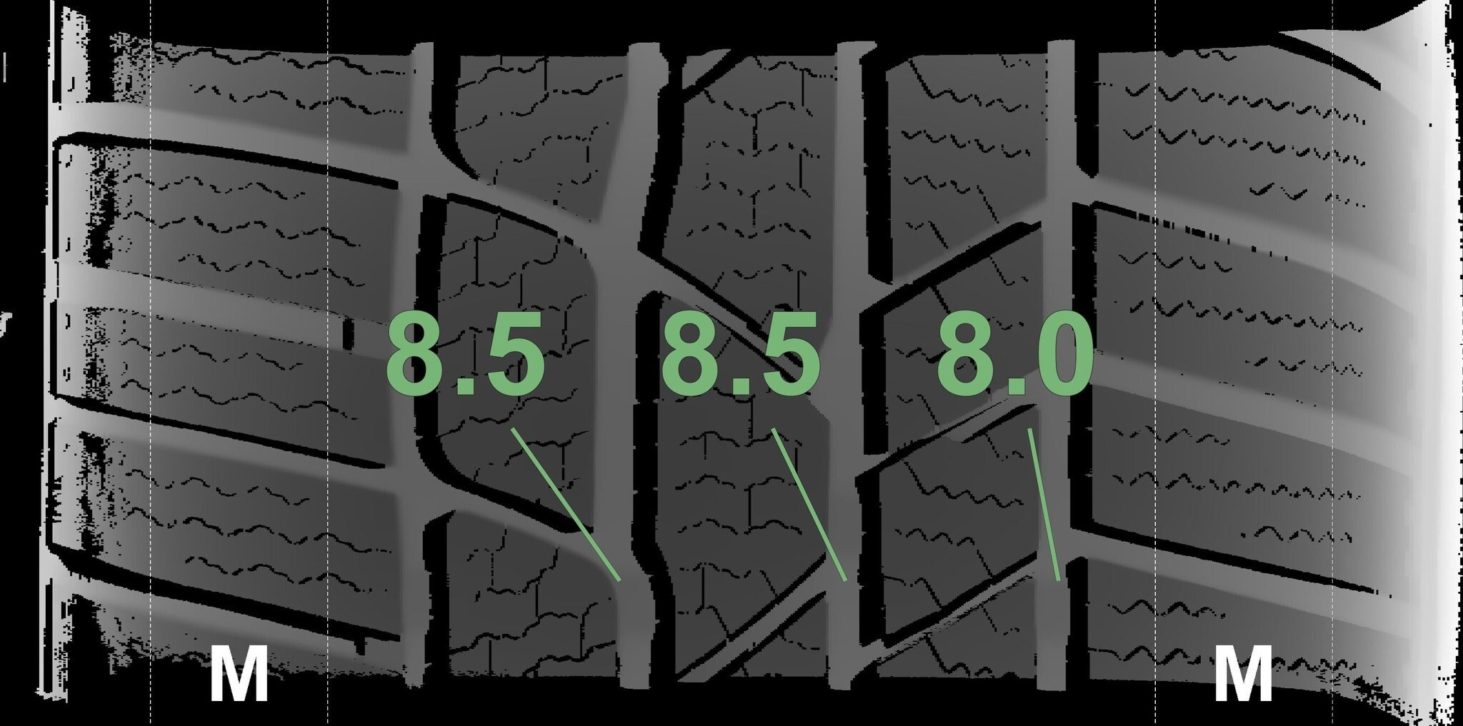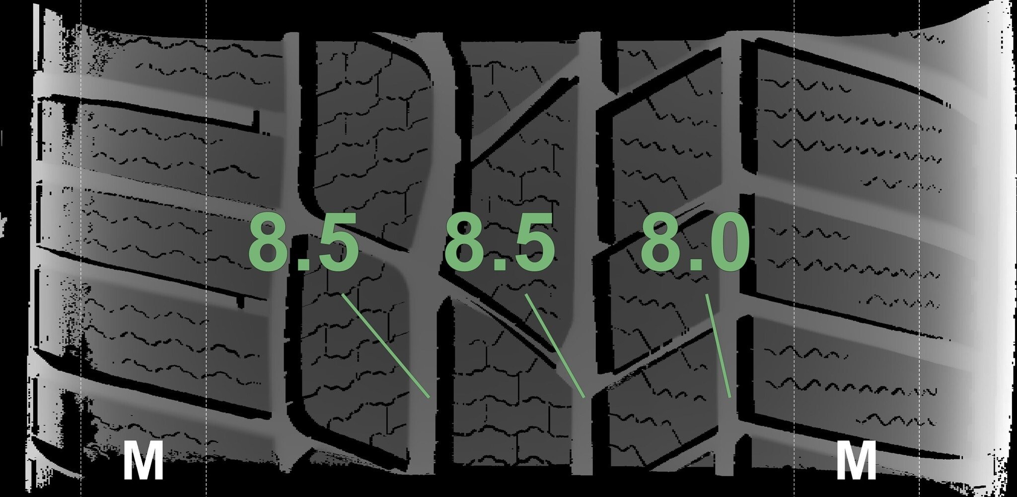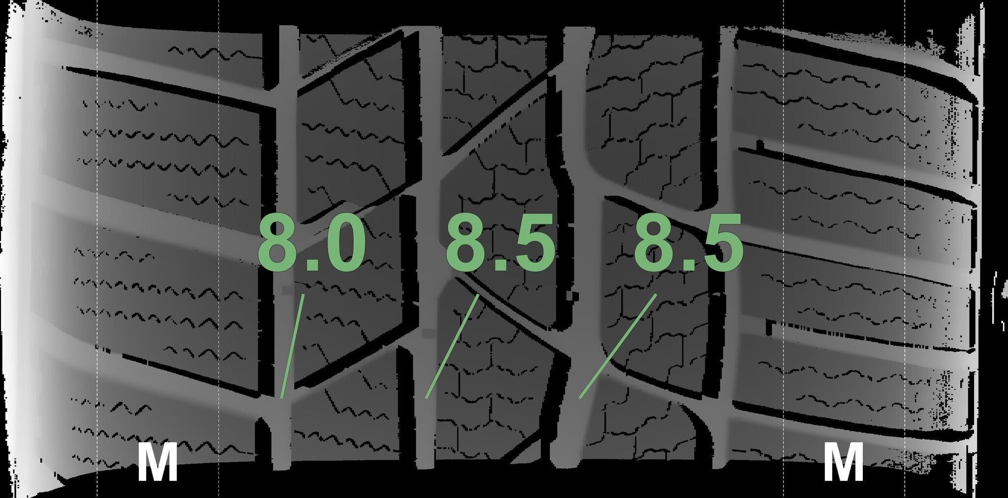 De gemeten profieldieptes en de details van de velgen zijn hierboven weergegeven.