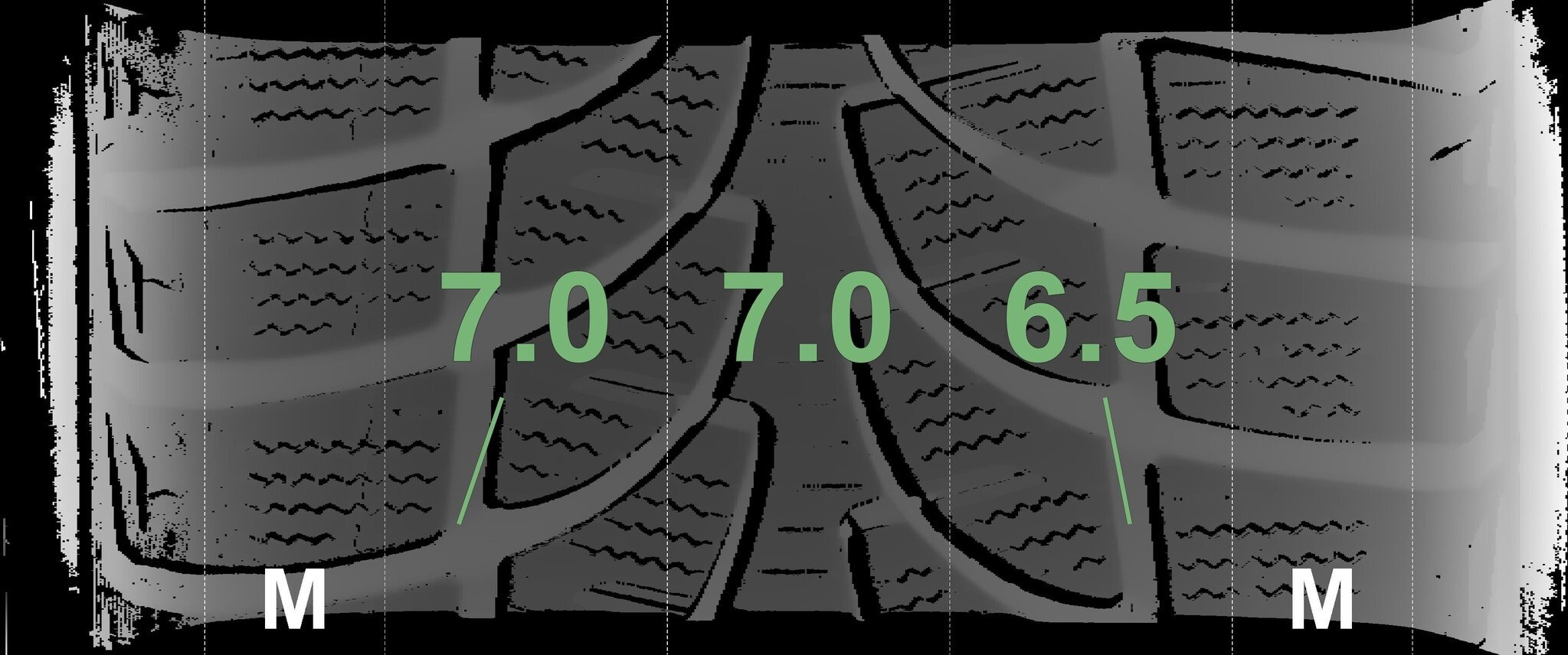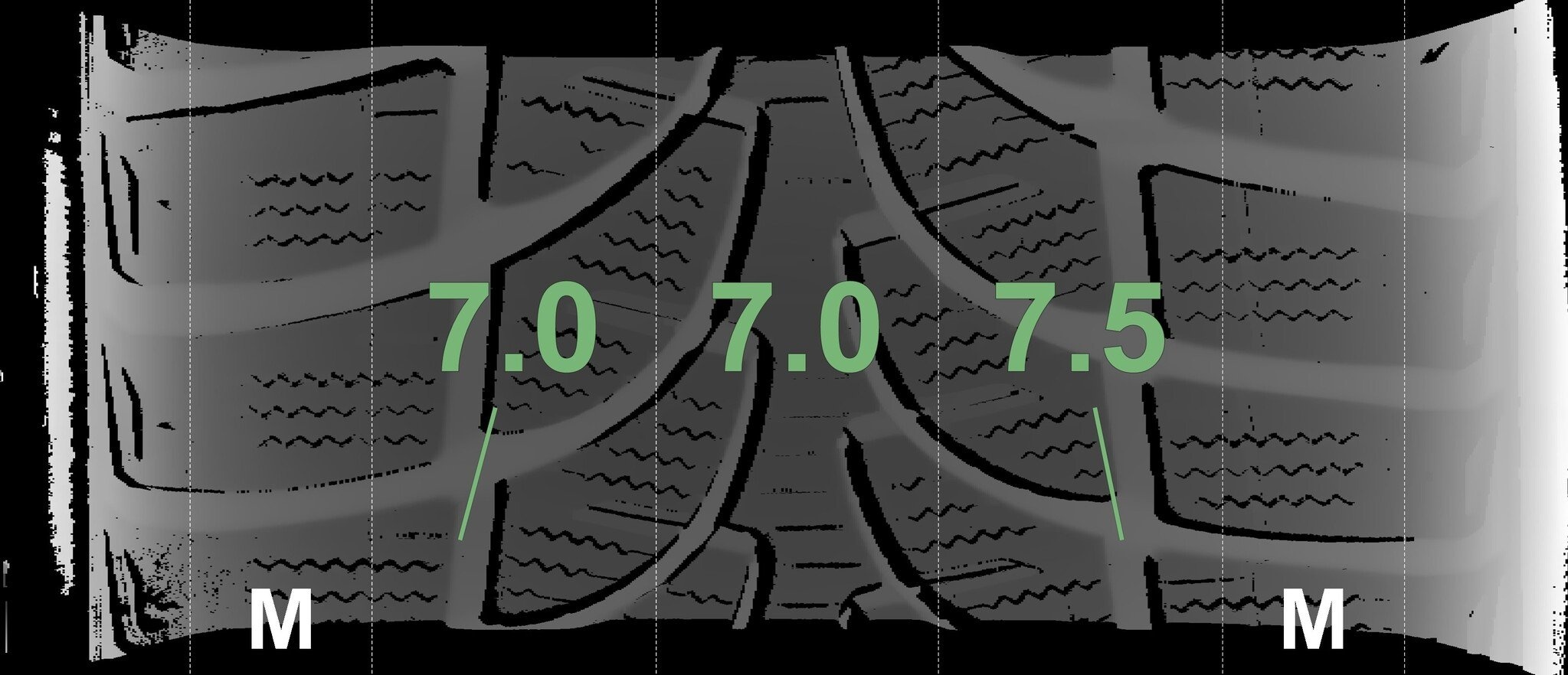 De gemeten profieldieptes en de details van de velgen zijn hierboven weergegeven.