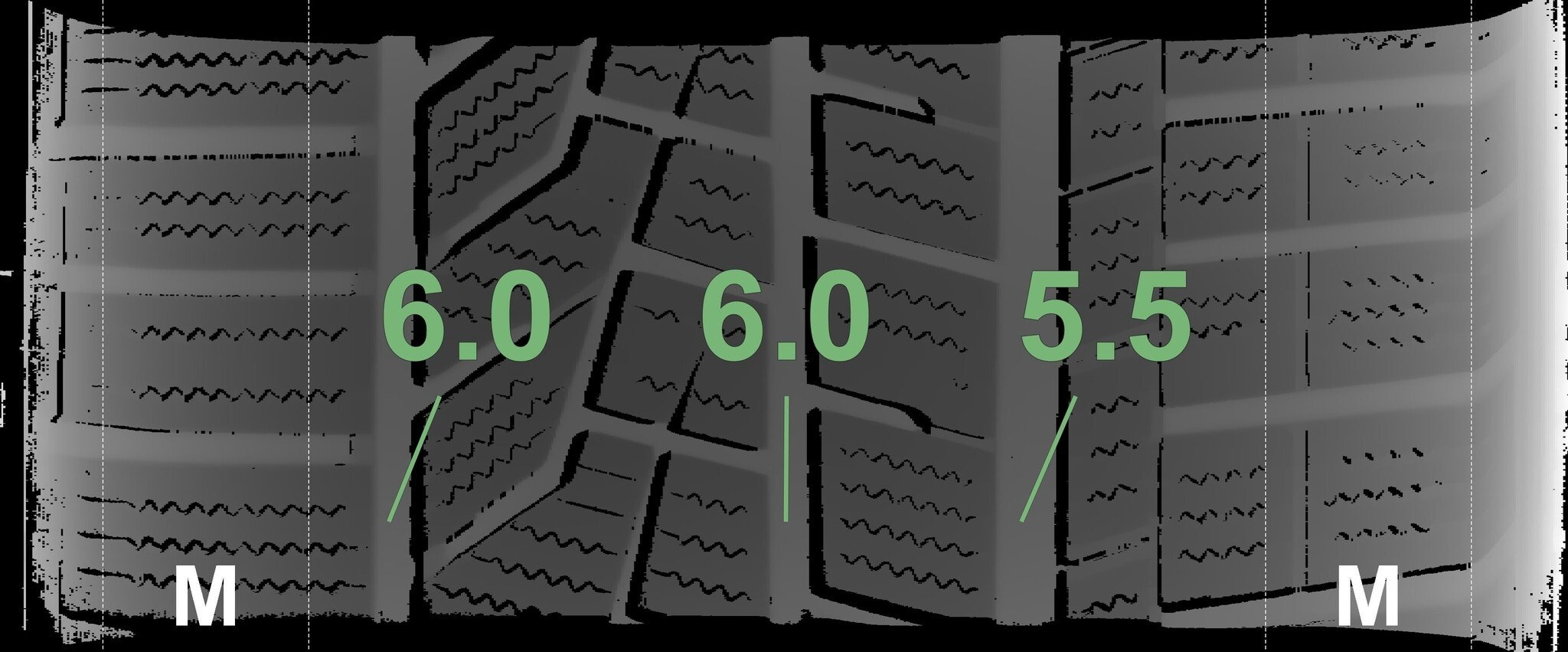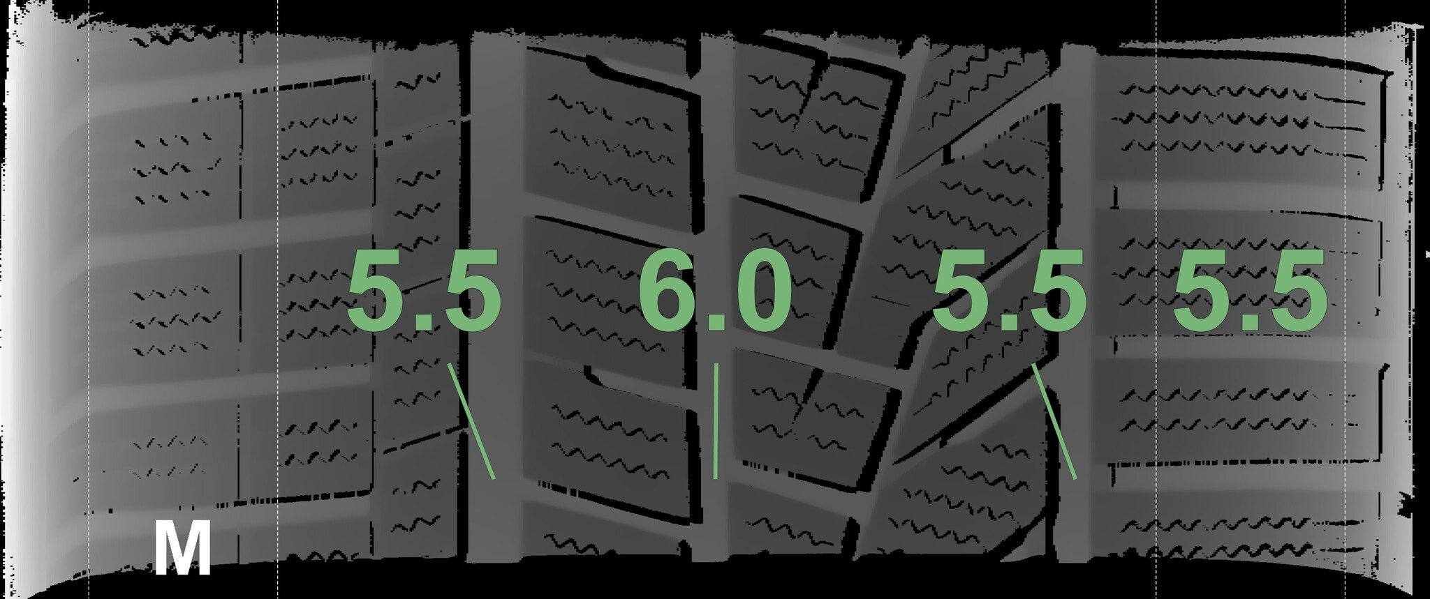 De gemeten profieldieptes en de details van de velgen zijn hierboven weergegeven.