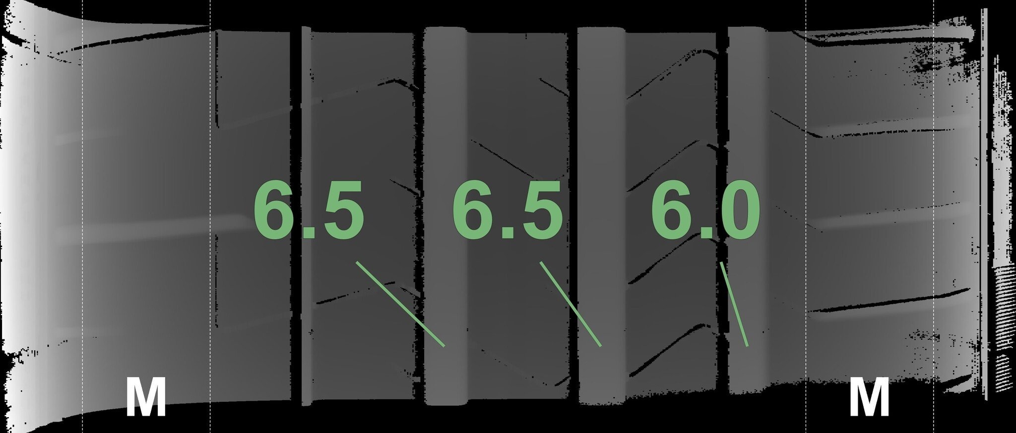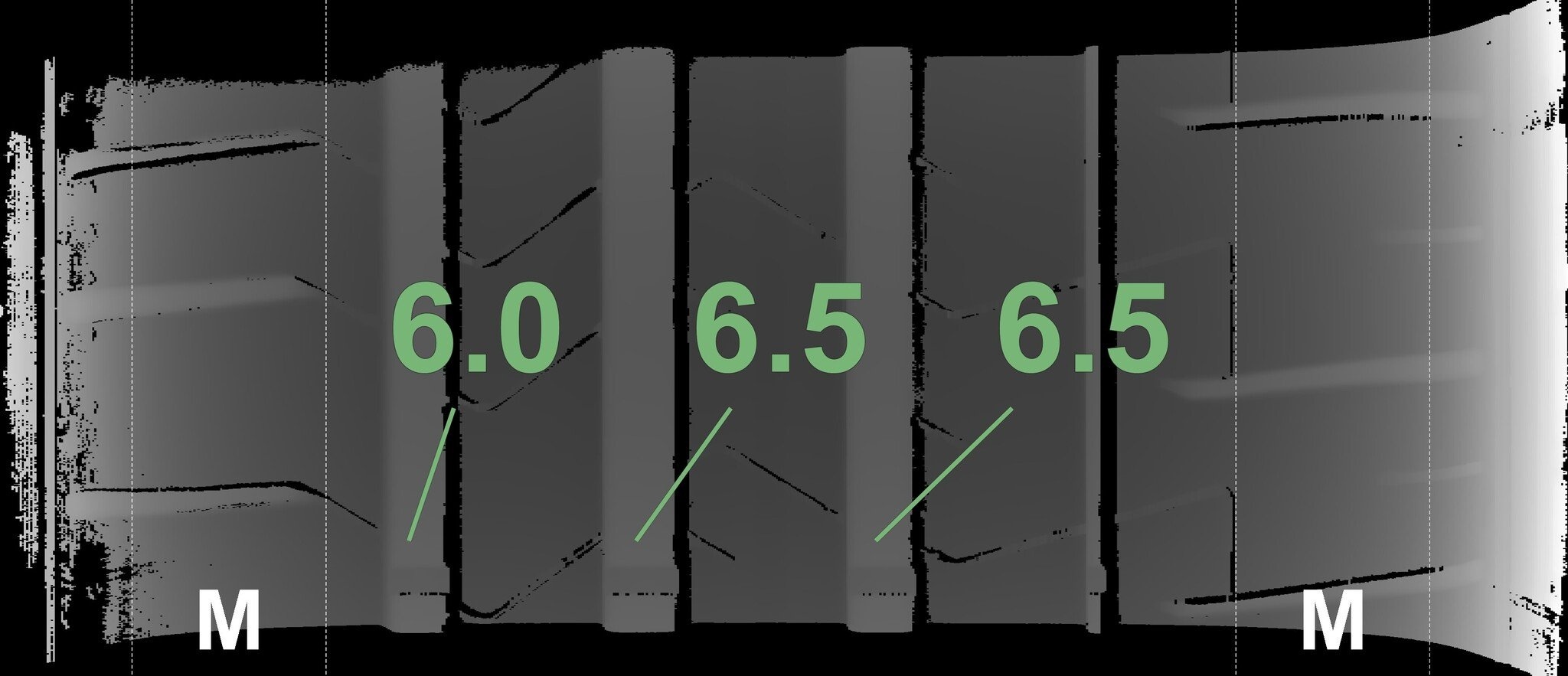 De gemeten profieldieptes en de details van de velgen zijn hierboven weergegeven.
