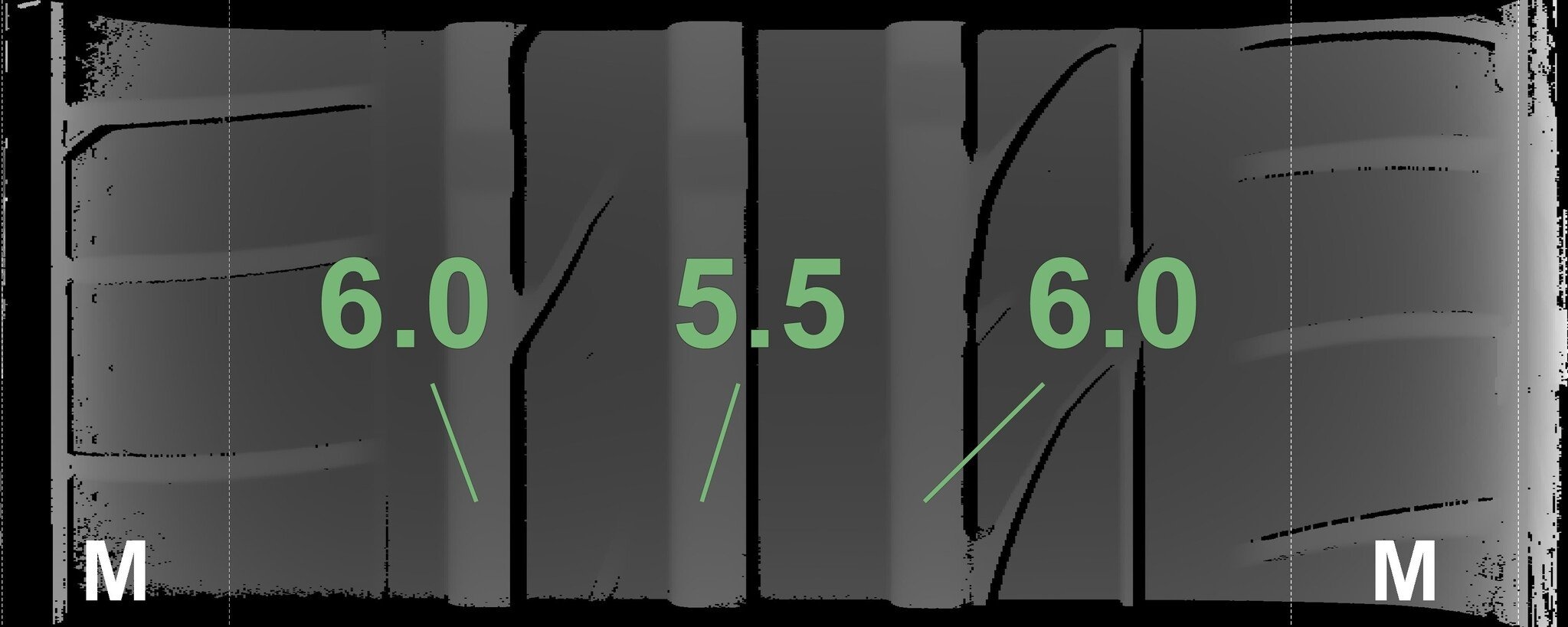 De gemeten profieldieptes en de details van de velgen zijn hierboven weergegeven.