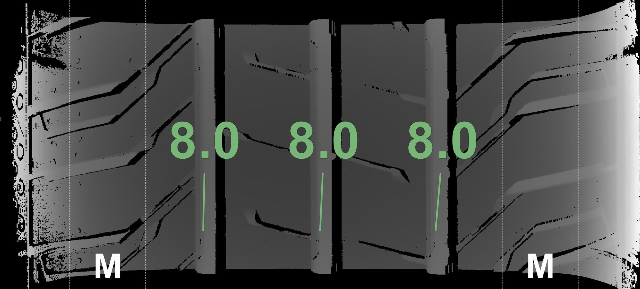 De gemeten profieldieptes en de details van de velgen zijn hierboven weergegeven.
