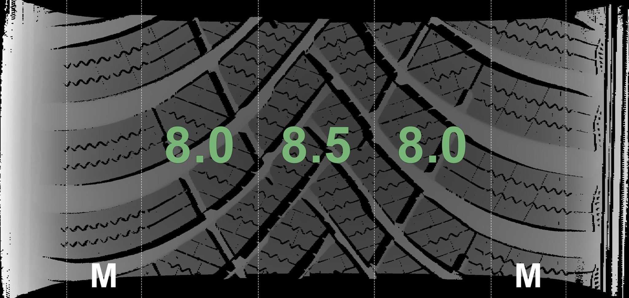 De gemeten profieldieptes en de details van de velgen zijn hierboven weergegeven.