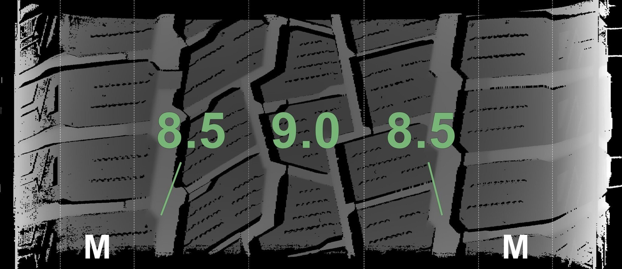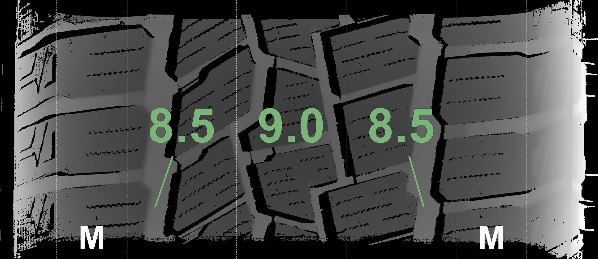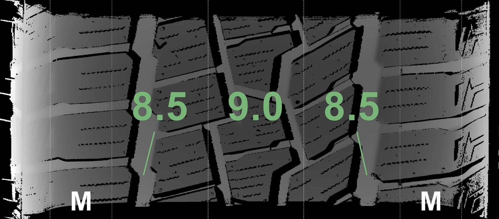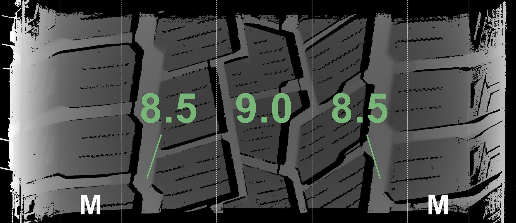 De gemeten profieldieptes en de details van de velgen zijn hierboven weergegeven.