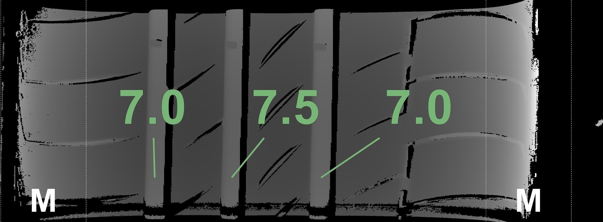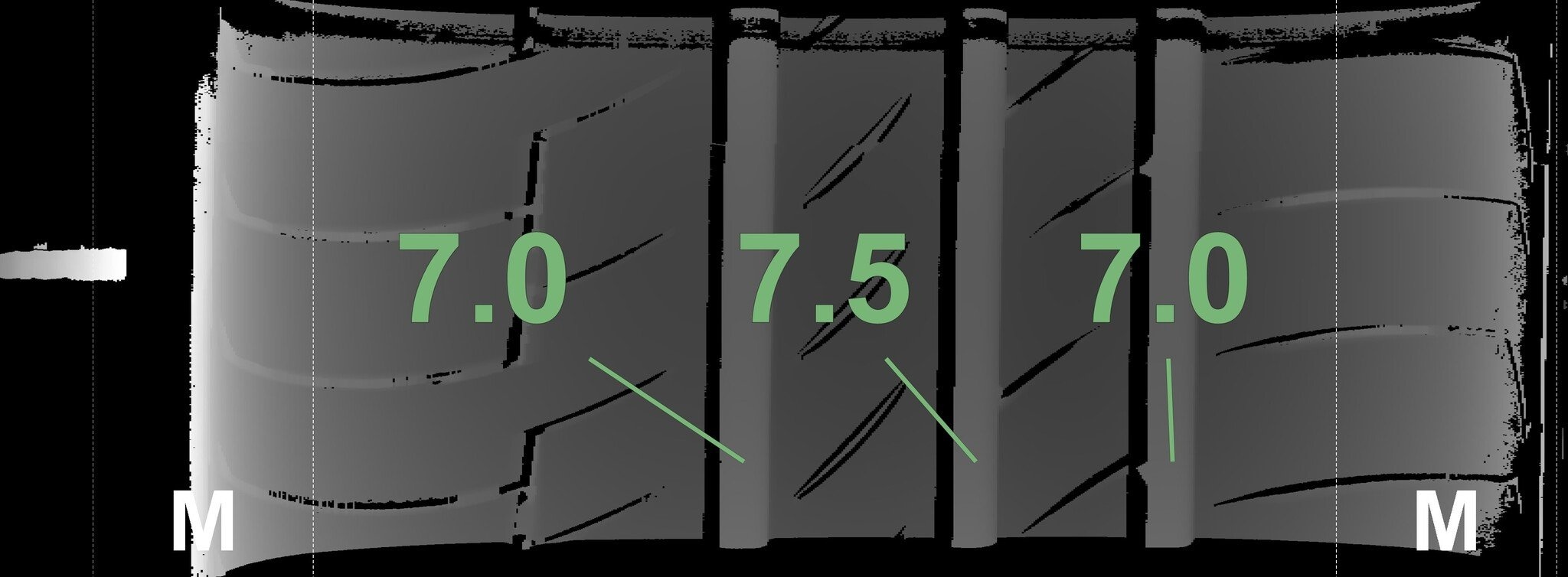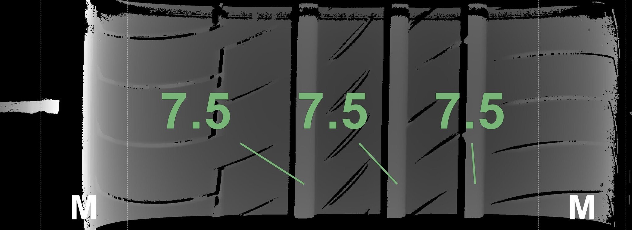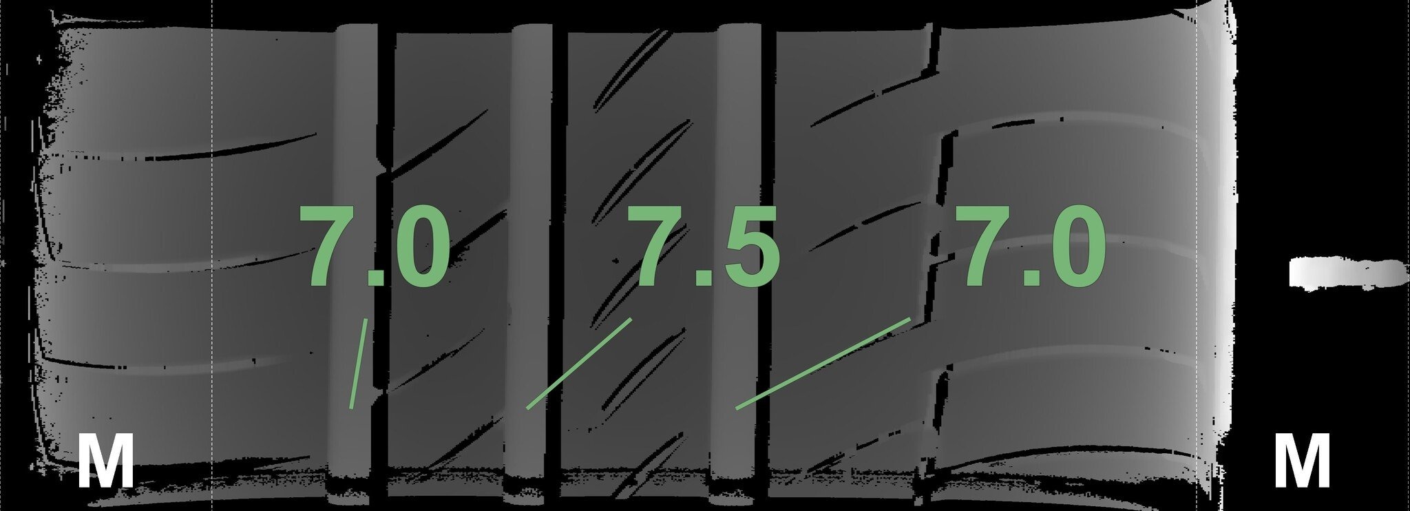 | Conditie | Profieldiepte | DOT | Rechts Achter | Demo nopjes nog zichtbaar | 7.0 mm | 2925 |