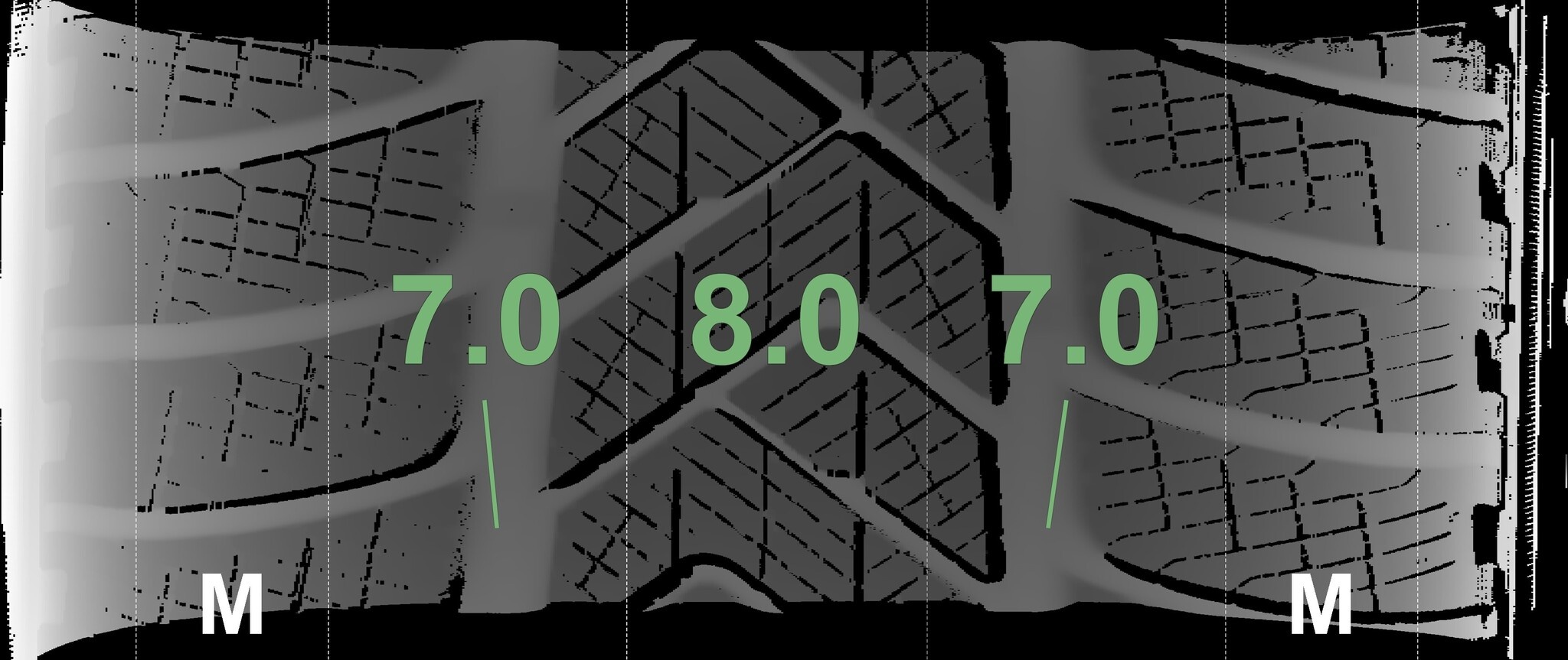 De gemeten profieldieptes en de details van de velgen zijn hierboven weergegeven.