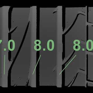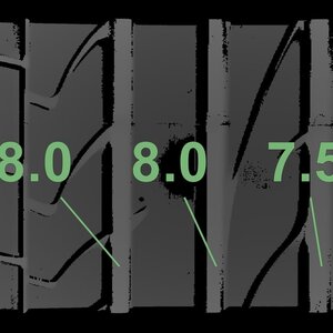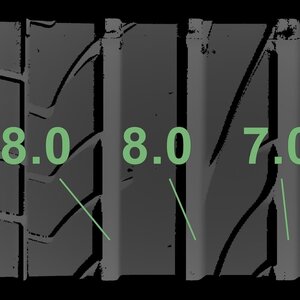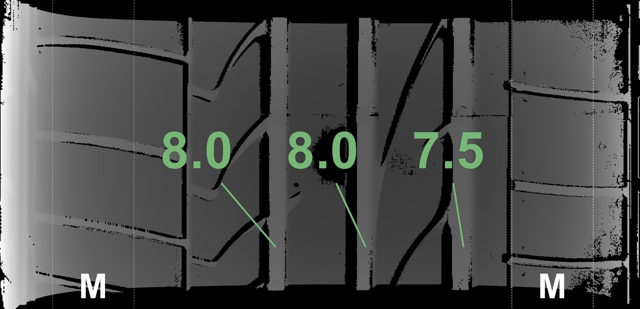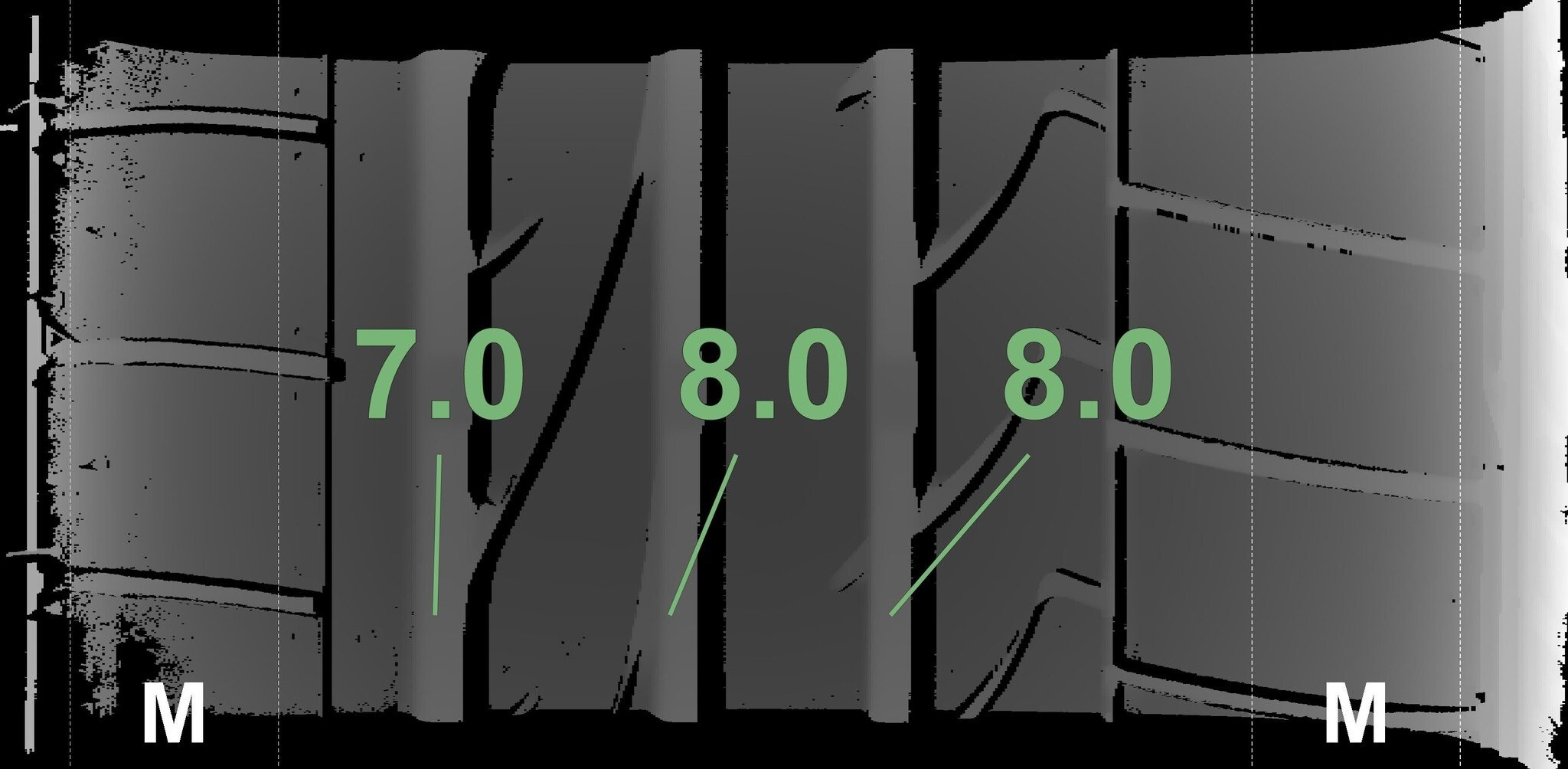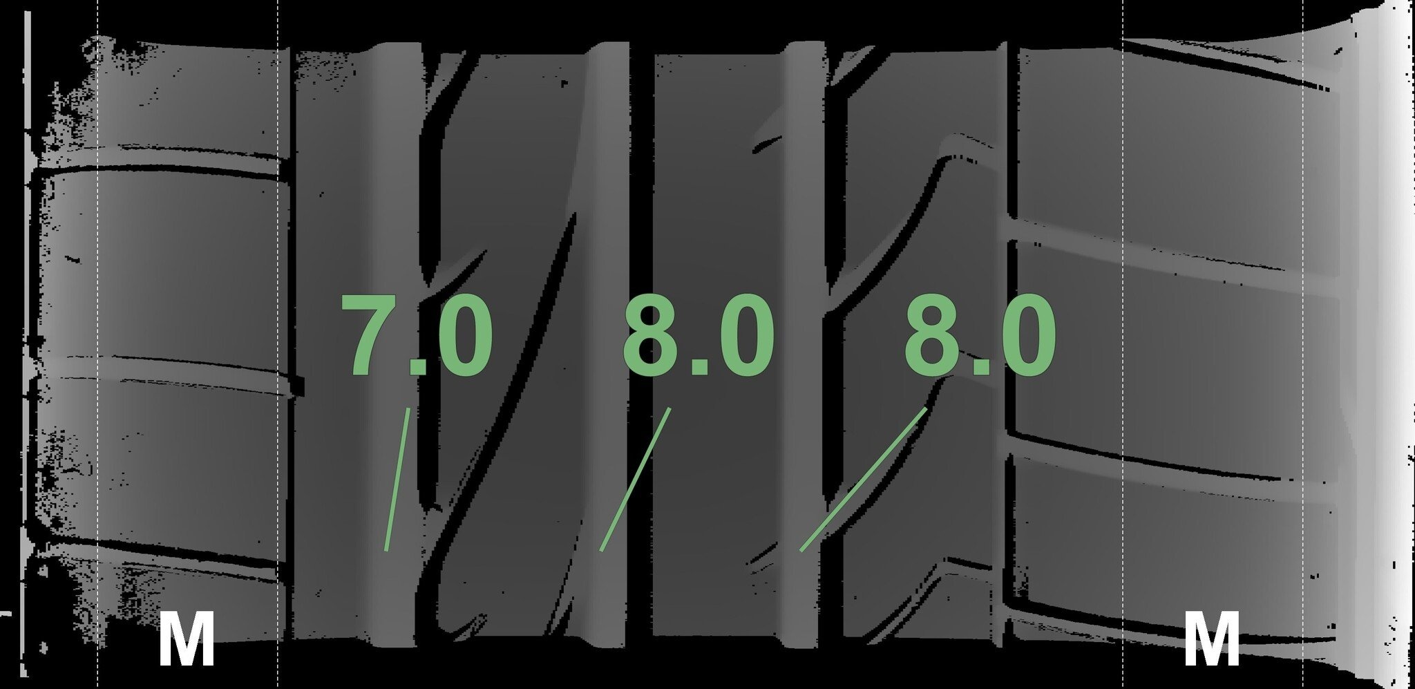 De gemeten profieldieptes en de details van de velgen zijn hierboven weergegeven.