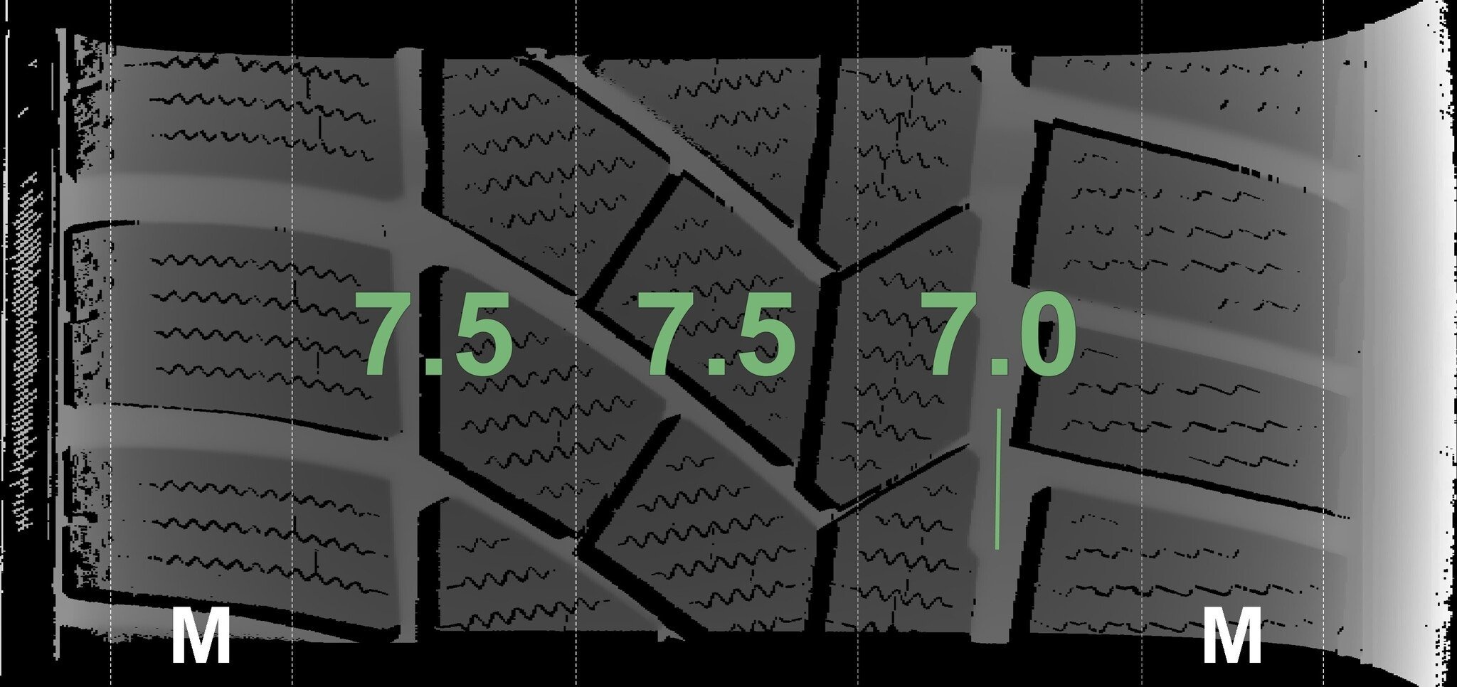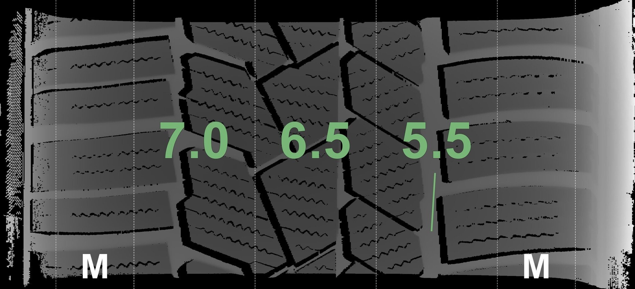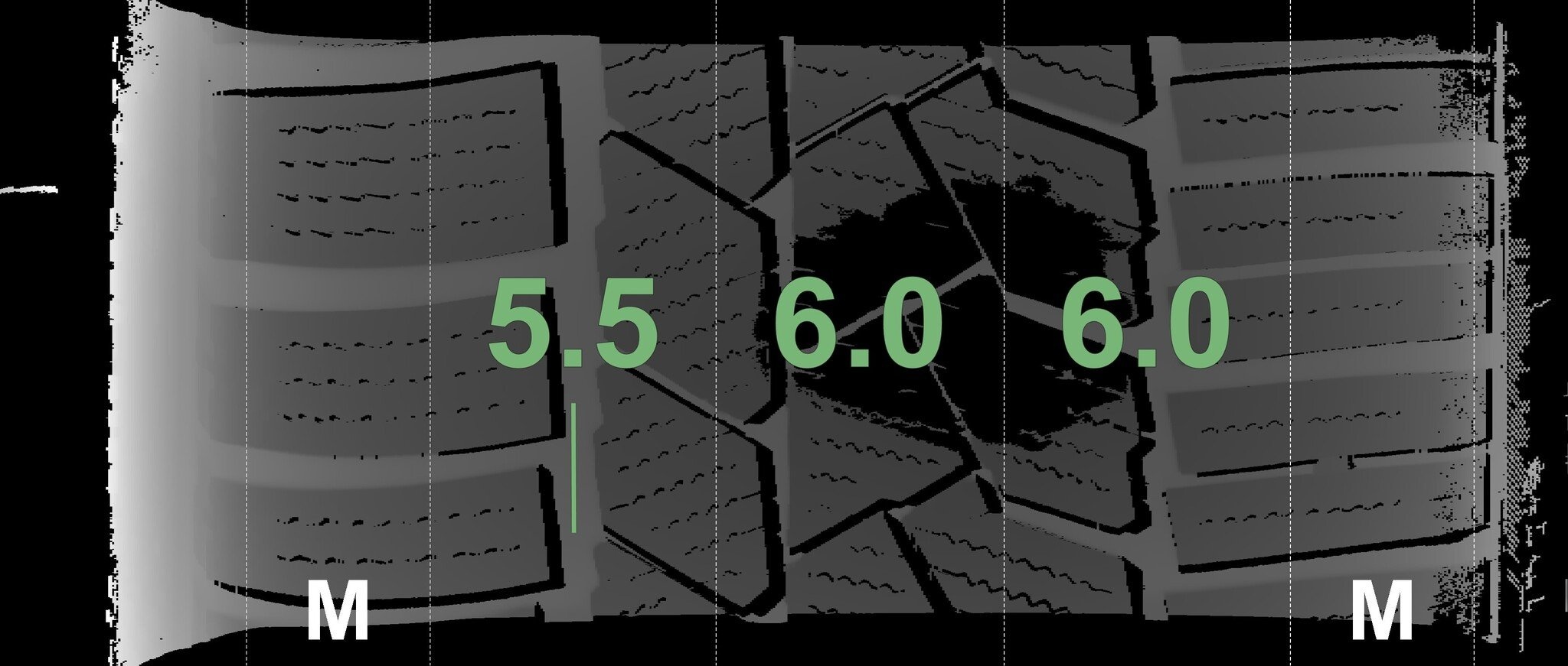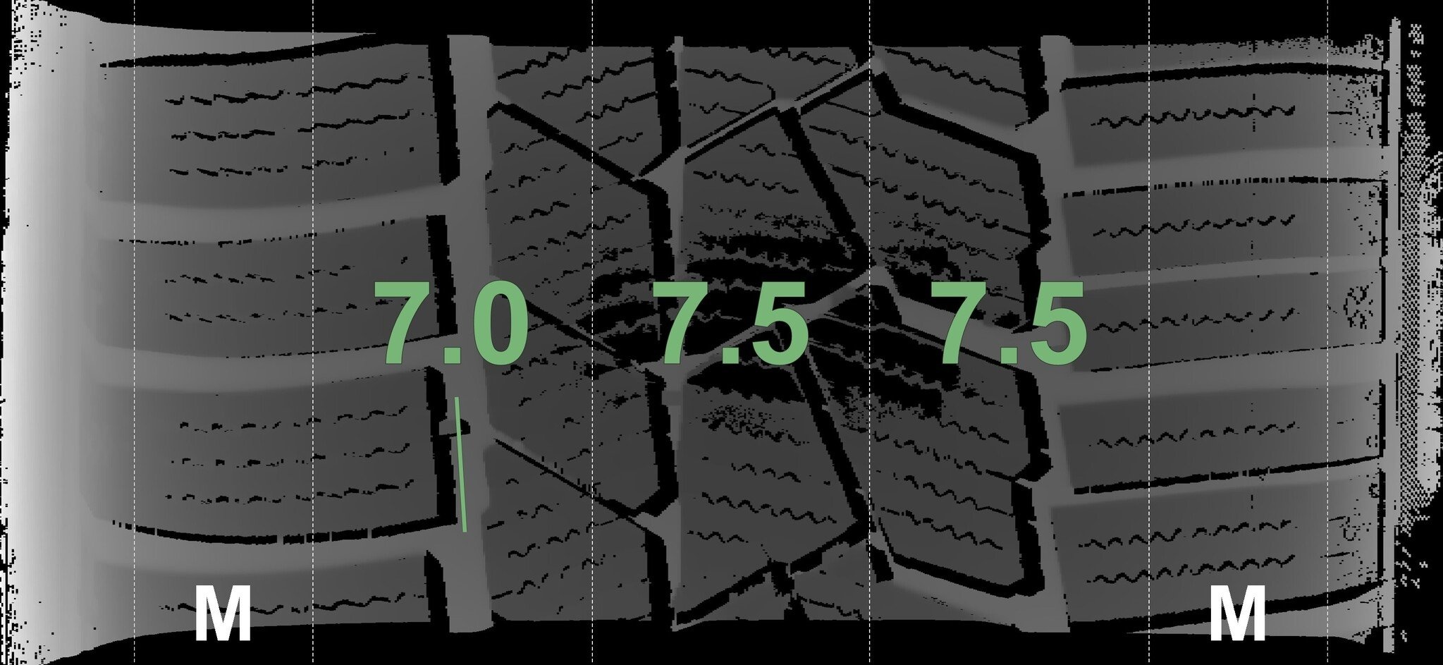 De gemeten profieldieptes en de details van de velgen zijn hierboven weergegeven.