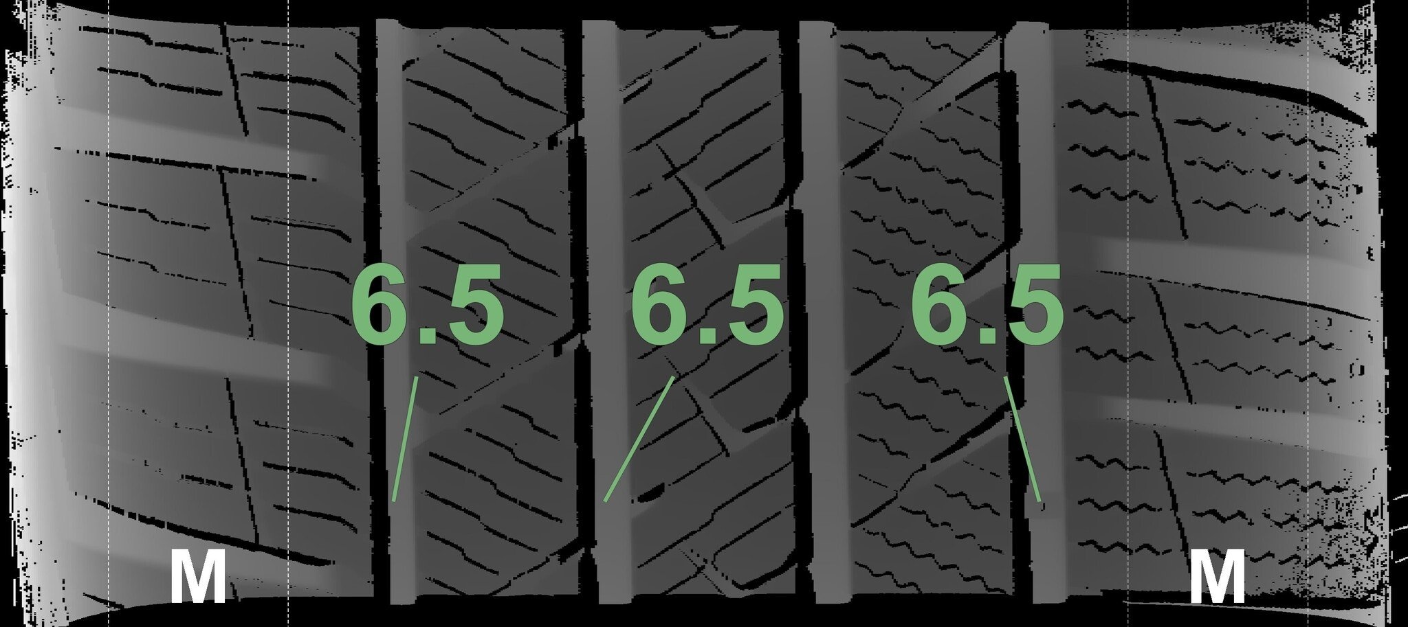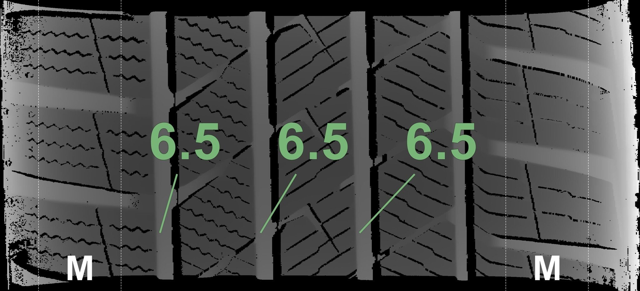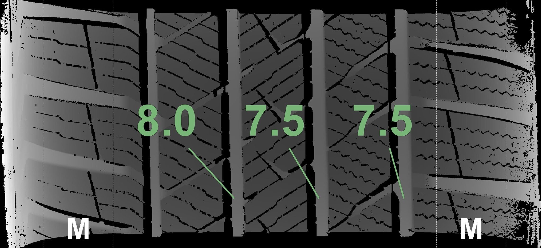 De gemeten profieldieptes en de details van de velgen zijn hierboven weergegeven.
