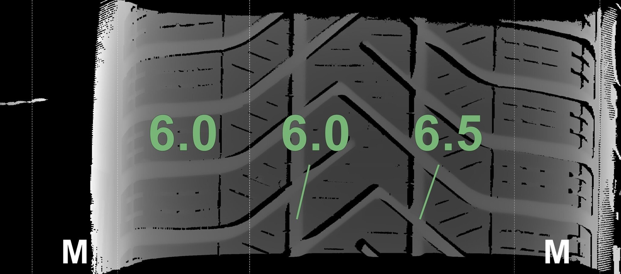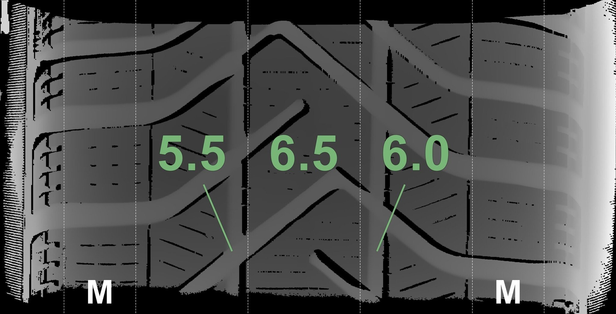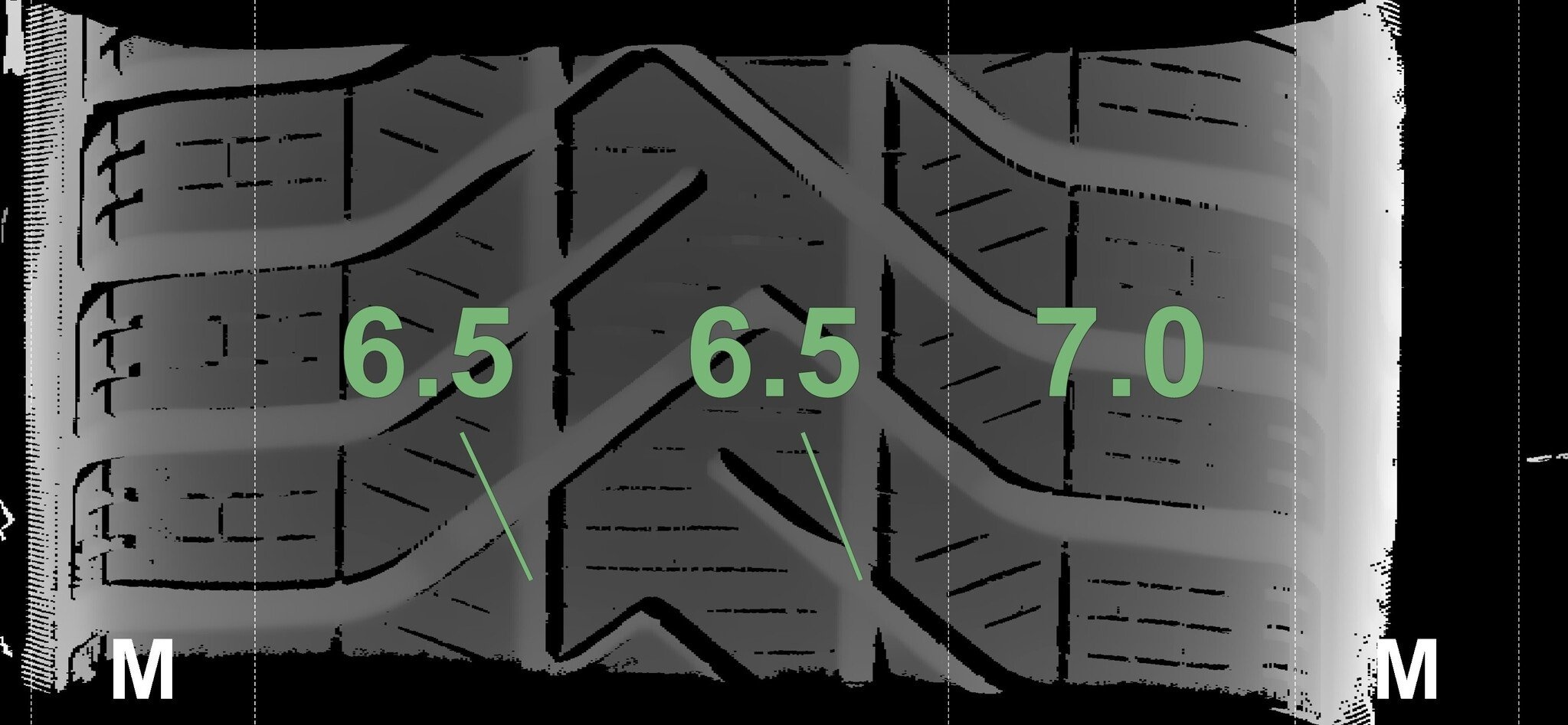 De gemeten profieldieptes en de details van de velgen zijn hierboven weergegeven.