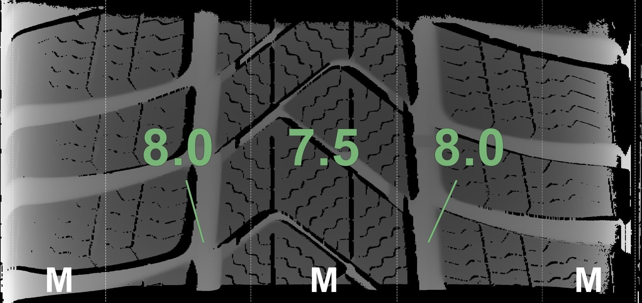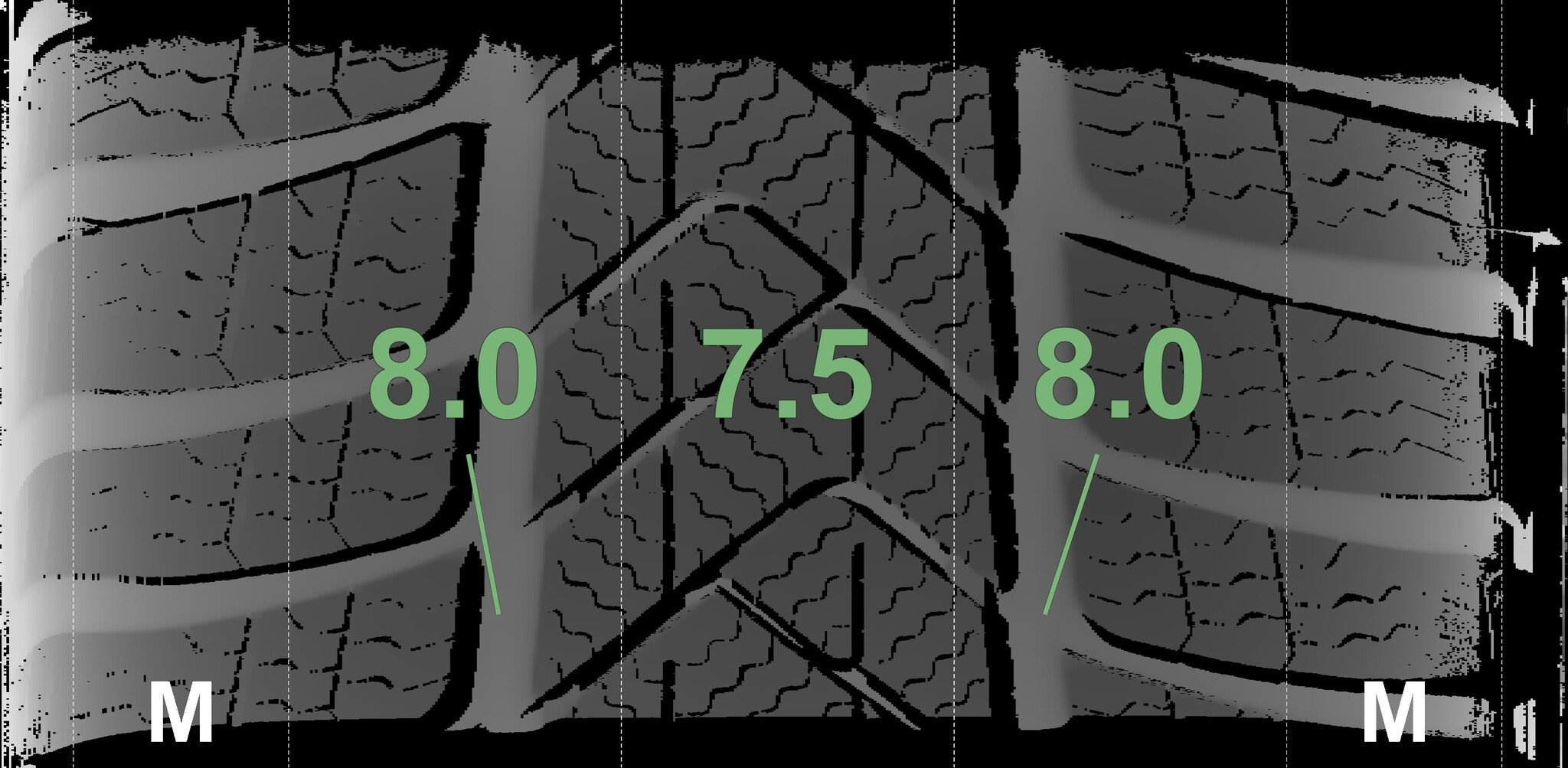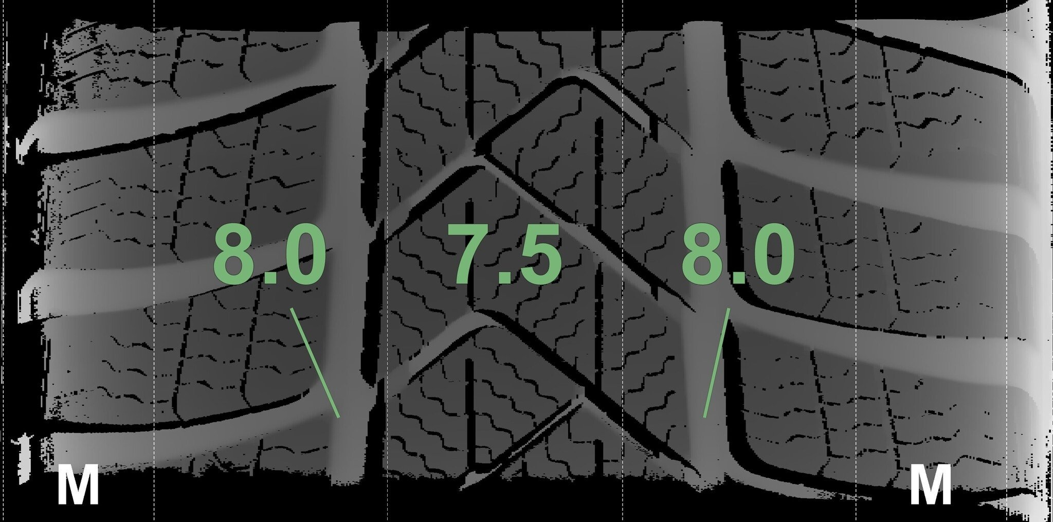 De gemeten profieldieptes en de details van de velgen zijn hierboven weergegeven.