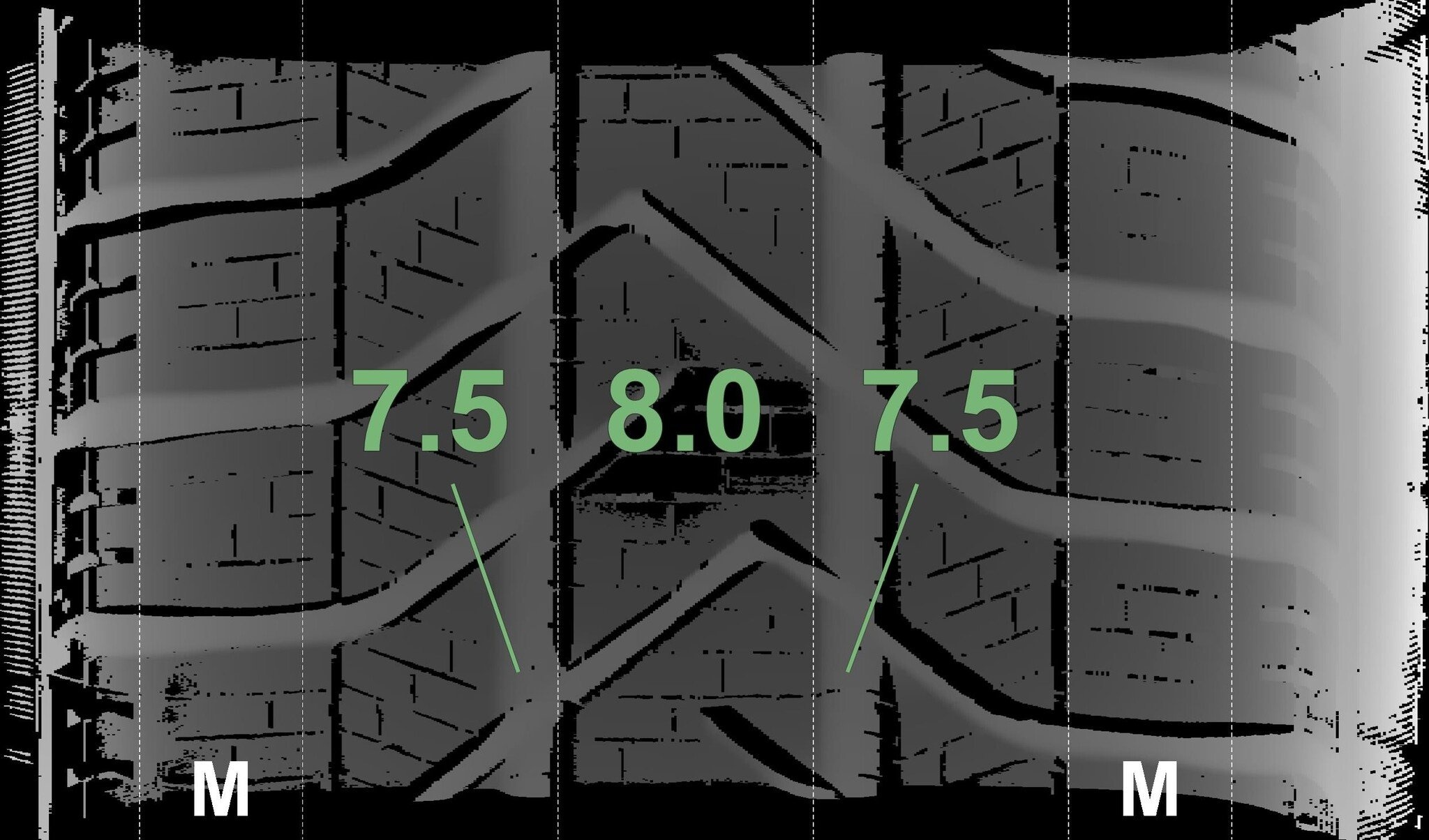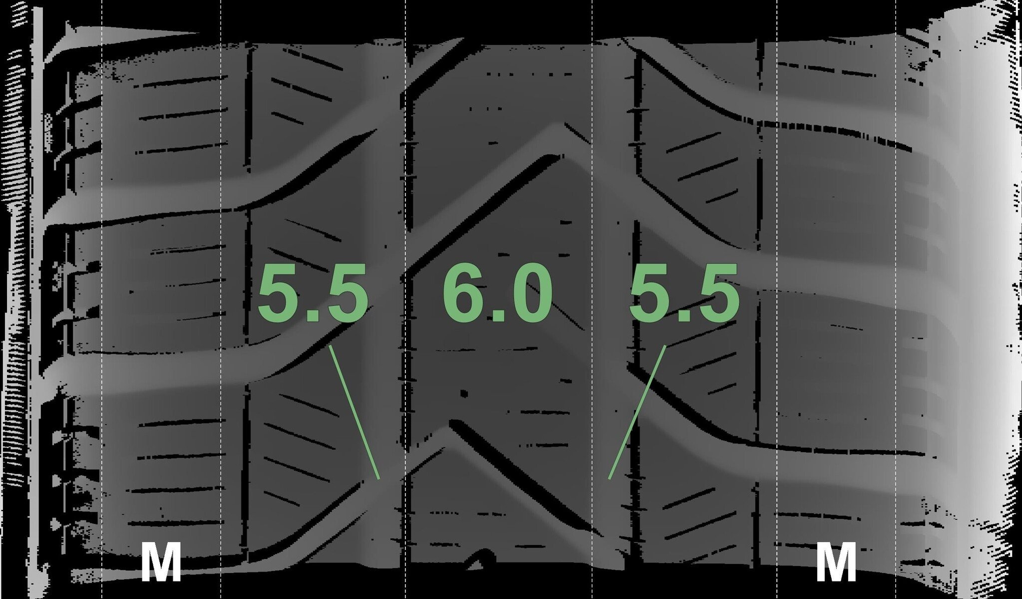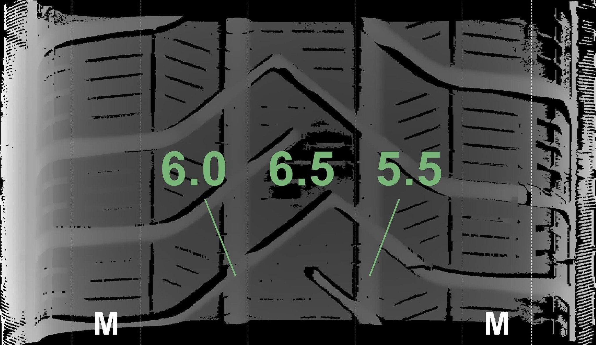 De gemeten profieldieptes en de details van de velgen zijn hierboven weergegeven.