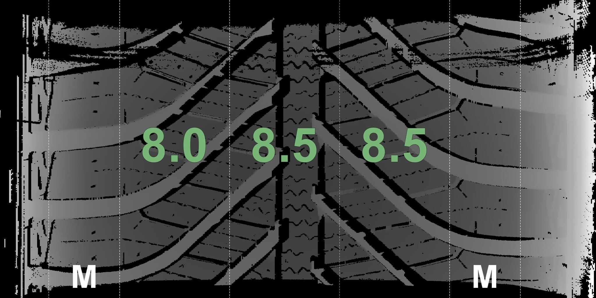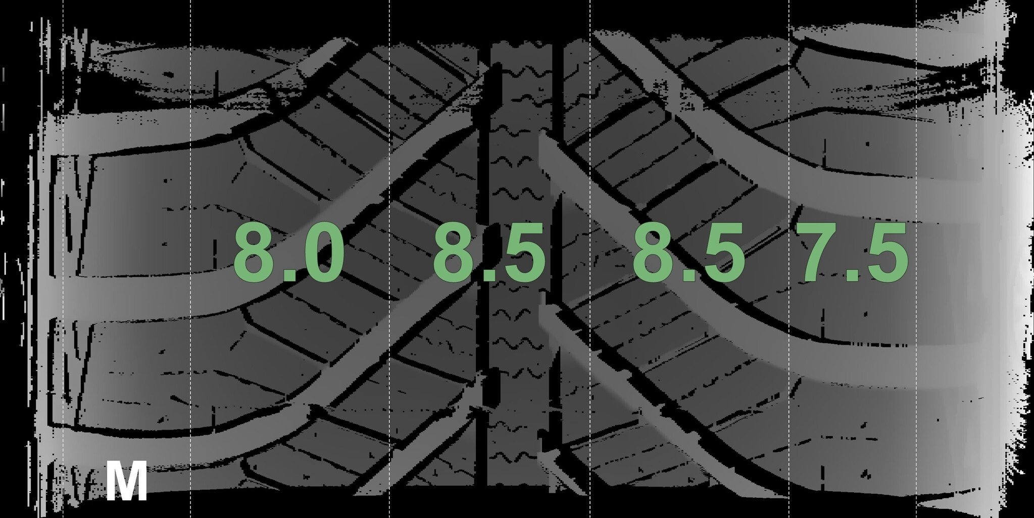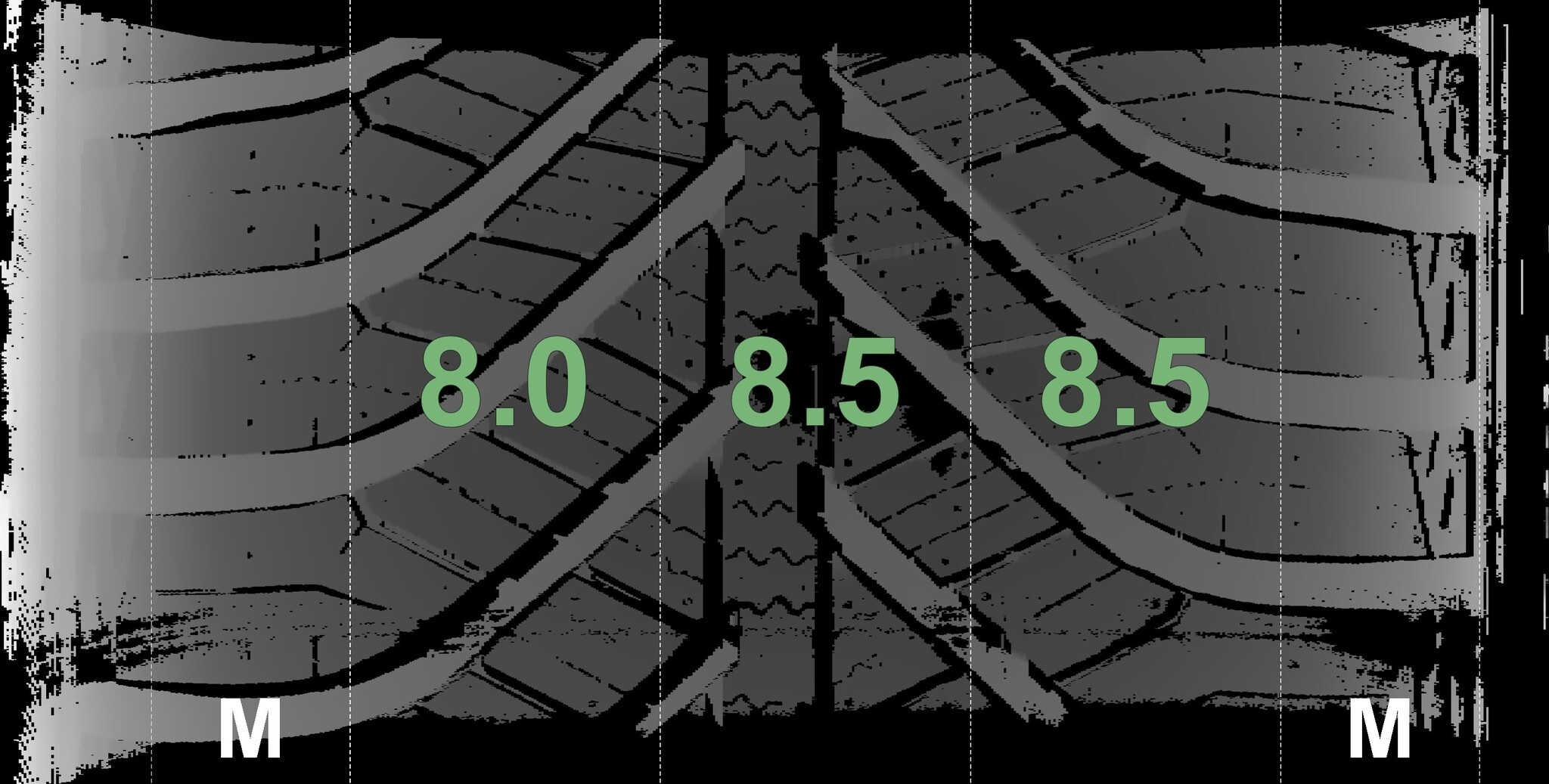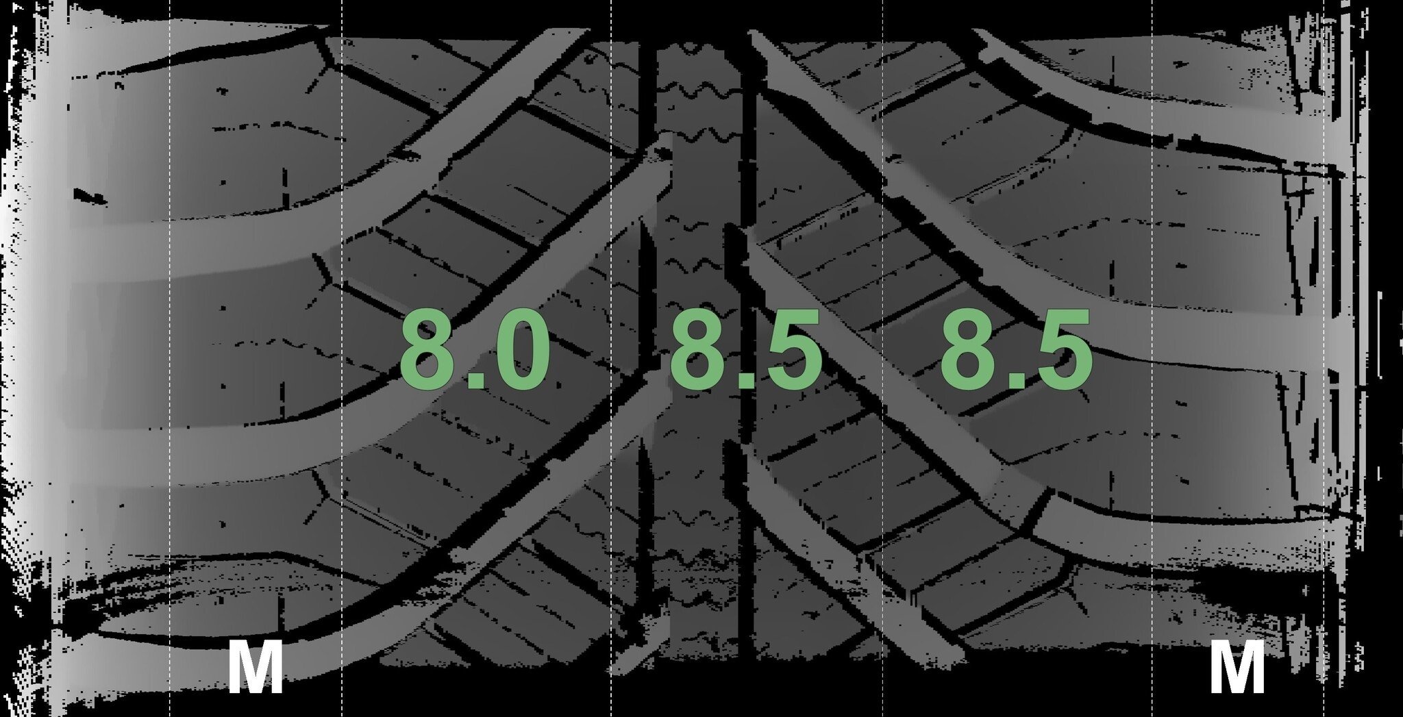 De gemeten profieldieptes en de details van de velgen zijn hierboven weergegeven.