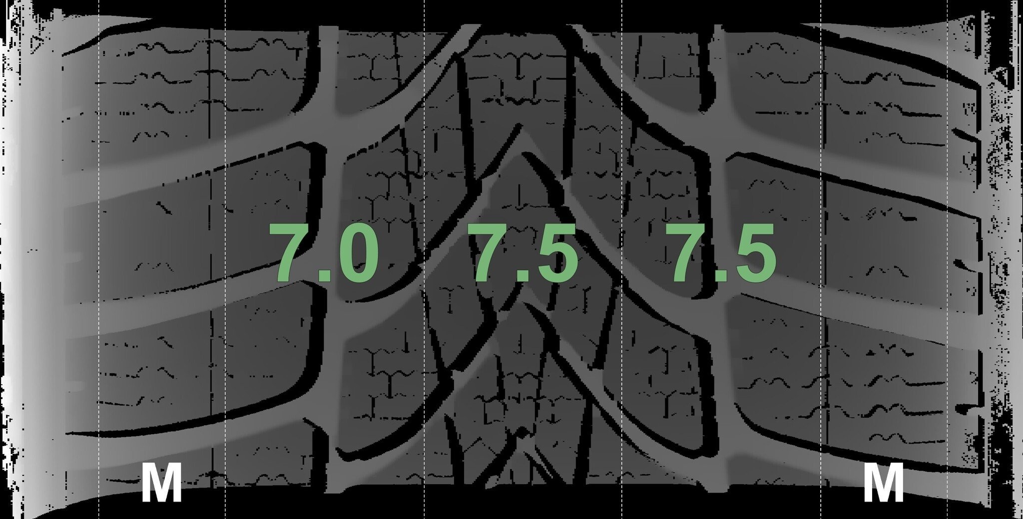 De gemeten profieldieptes en de details van de velgen zijn hierboven weergegeven.