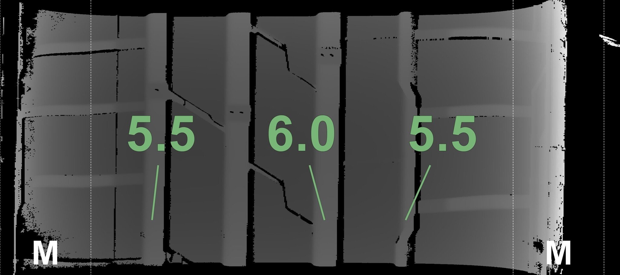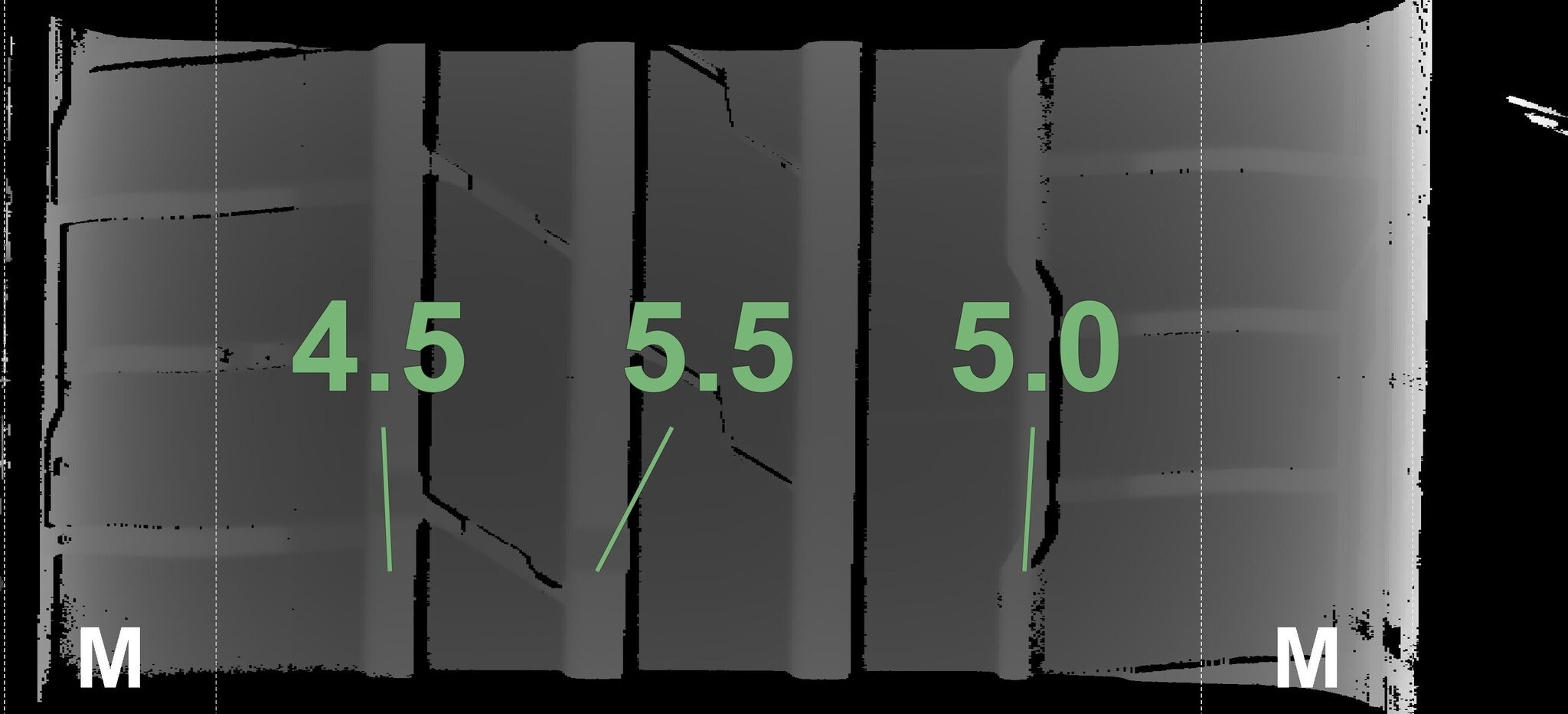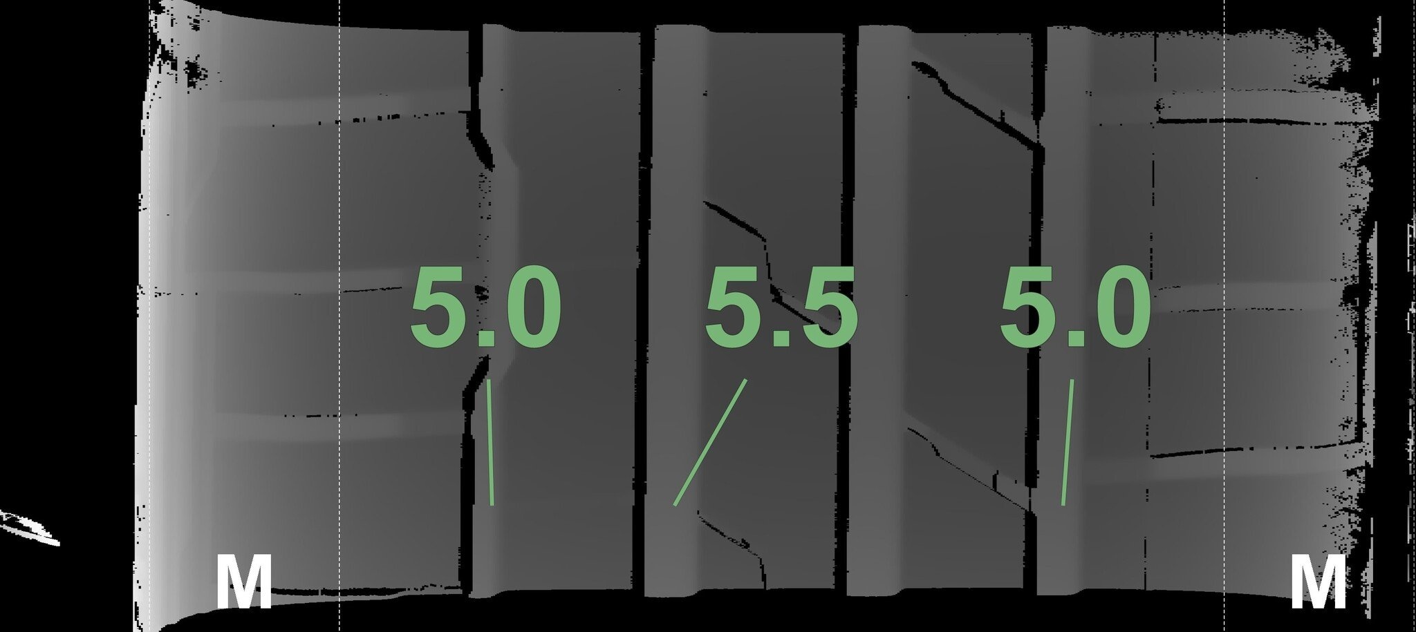 De gemeten profieldieptes en de details van de velgen zijn hierboven weergegeven.