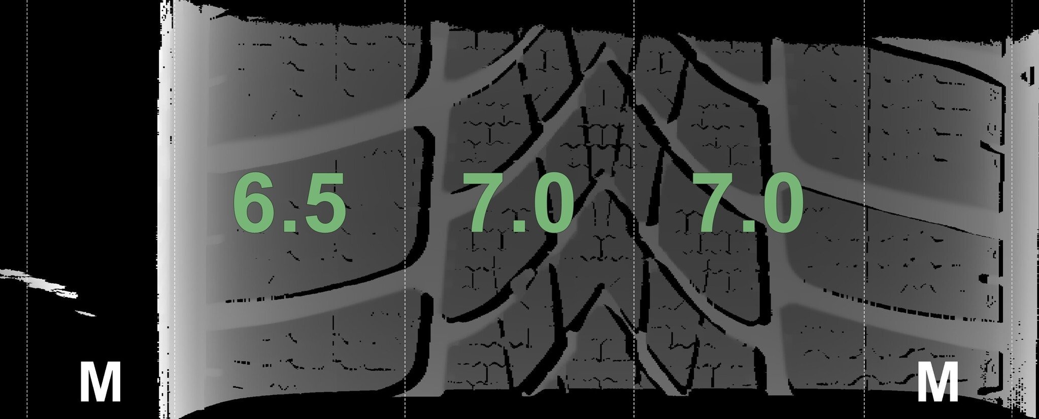 De gemeten profieldieptes en de details van de velgen zijn hierboven weergegeven.