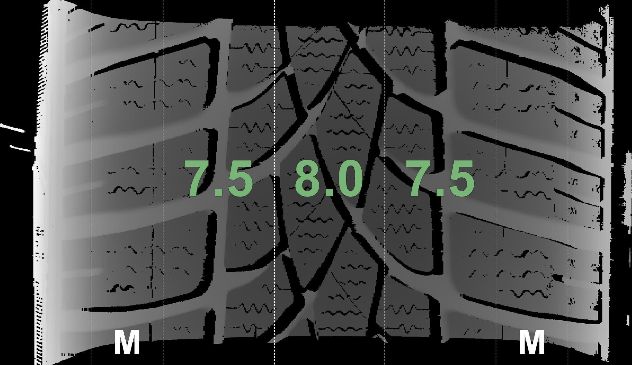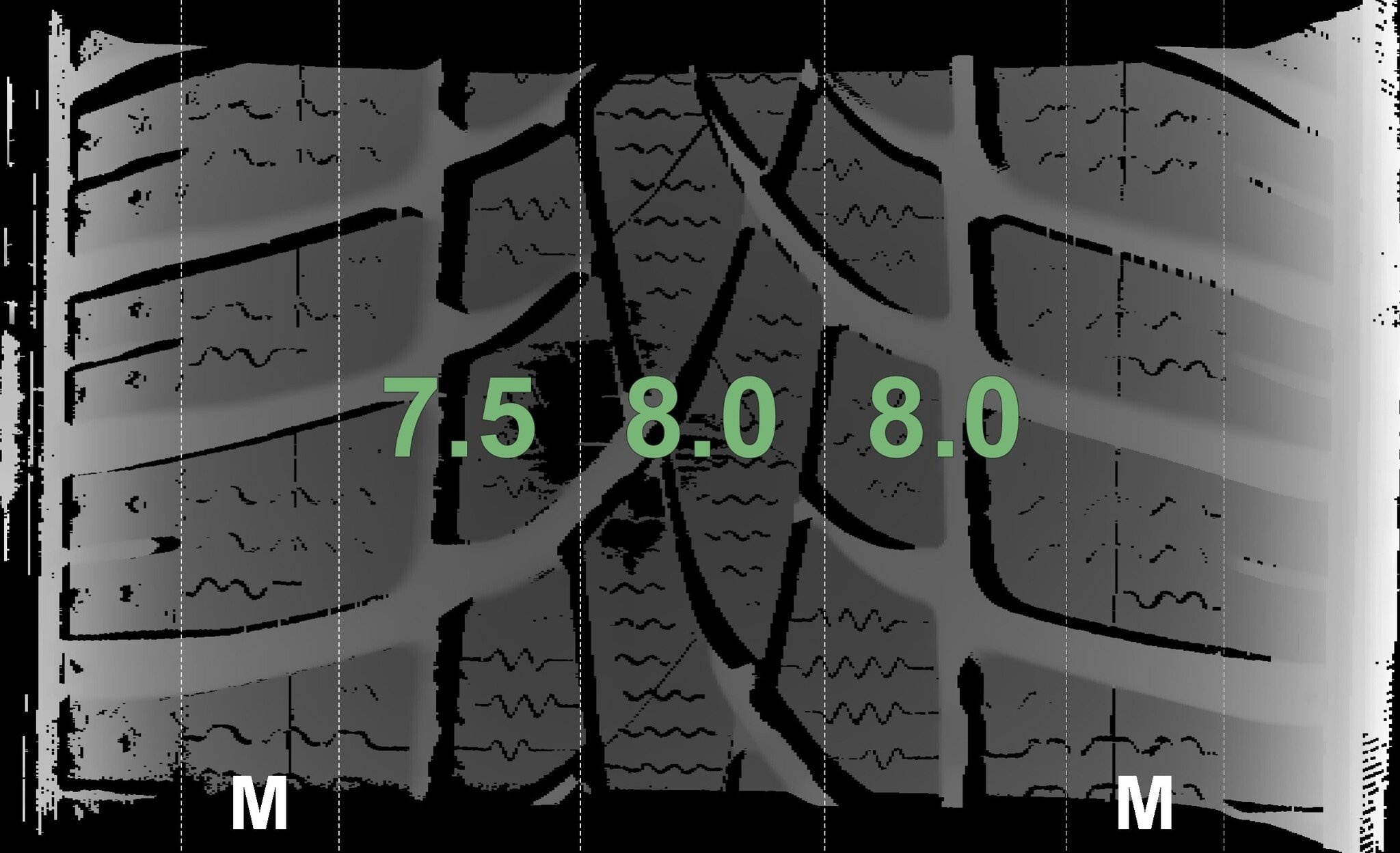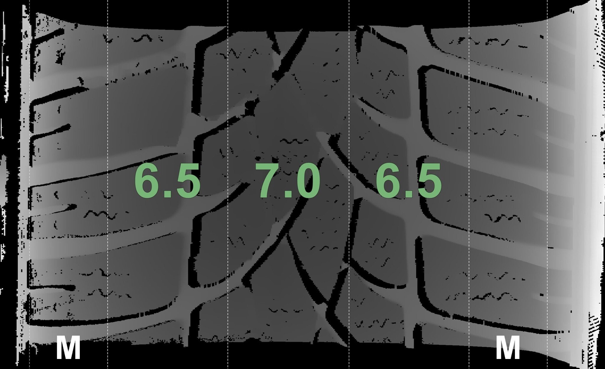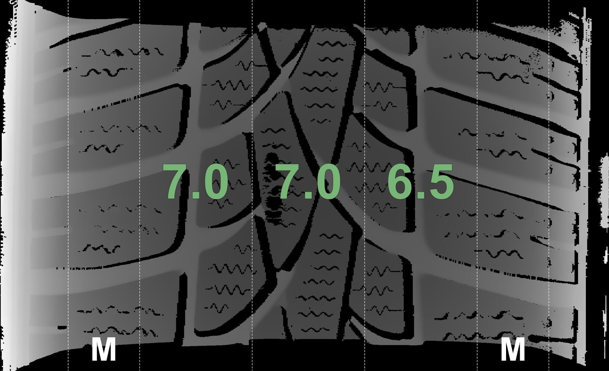De gemeten profieldieptes en de details van de velgen zijn hierboven weergegeven.