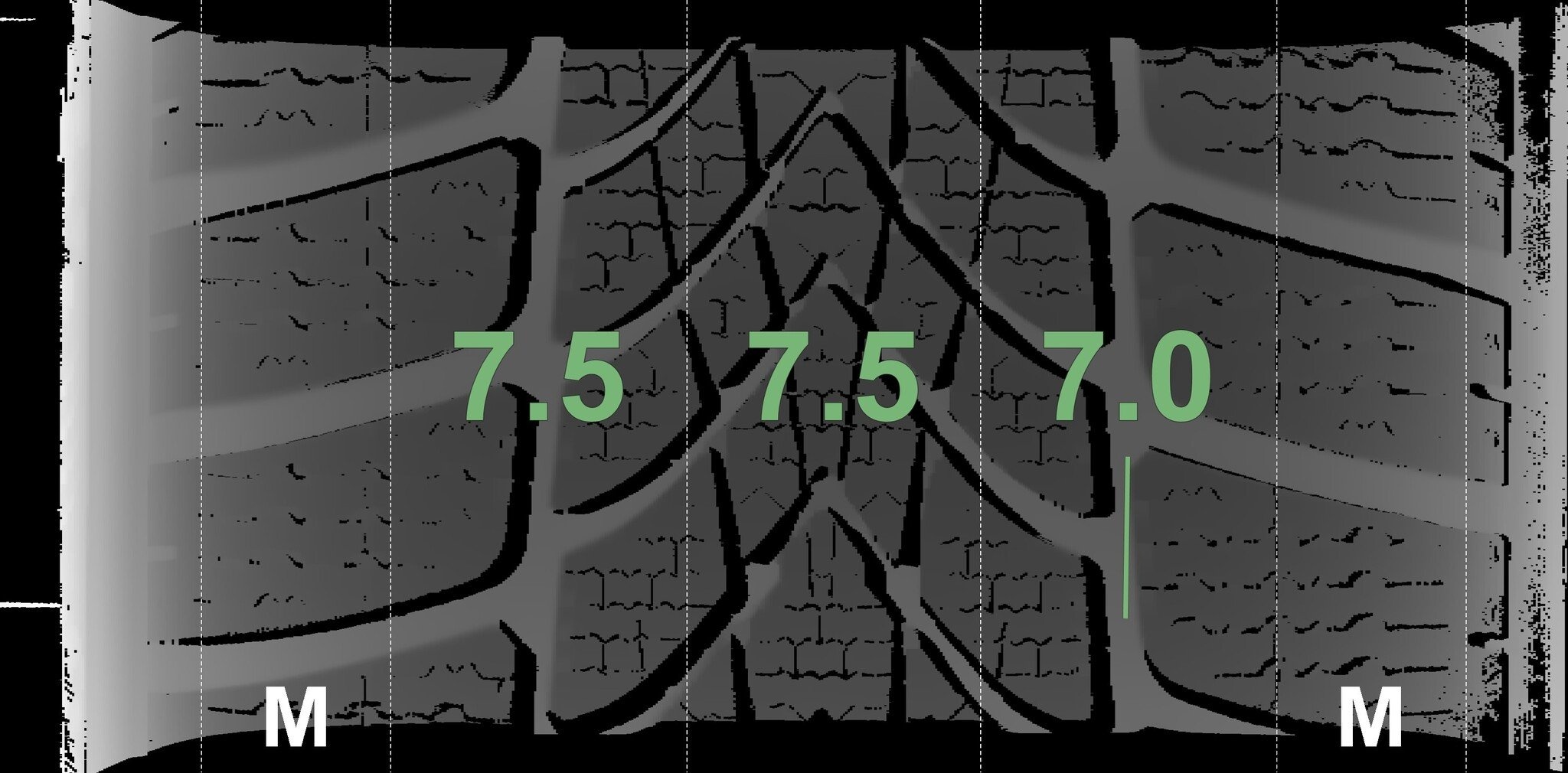 De gemeten profieldieptes en de details van de velgen zijn hierboven weergegeven.